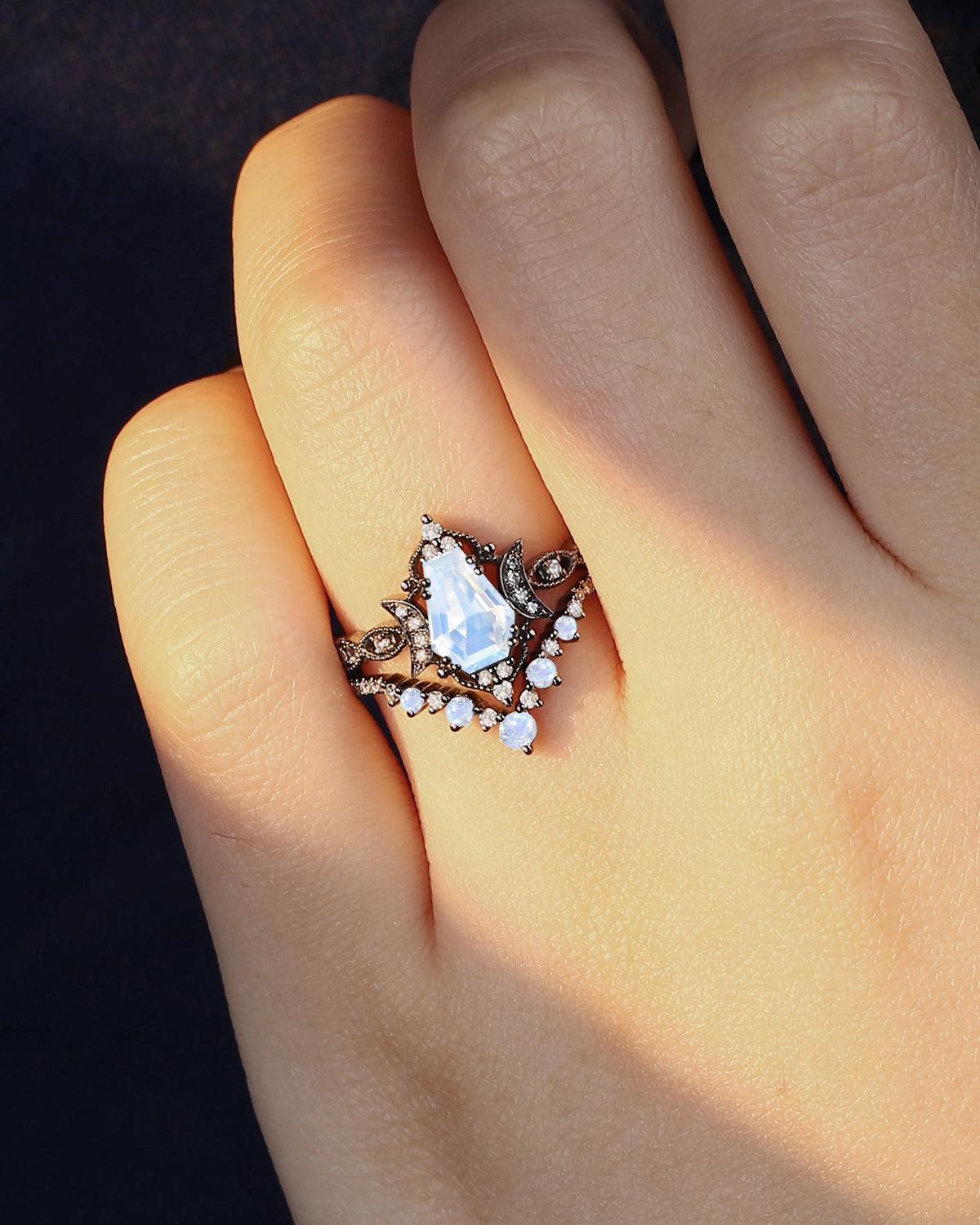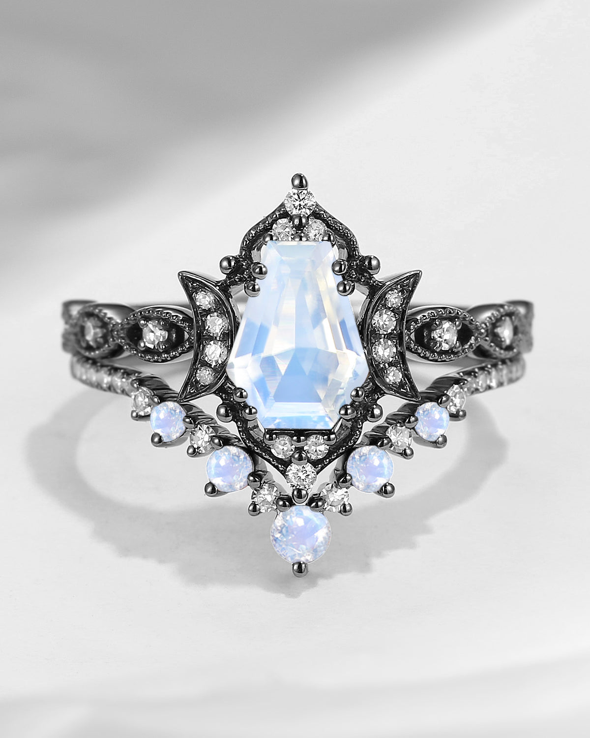 Crescent Moon | Coffin Cut Moonstone 'Black Statement' Ring Set 2pcs