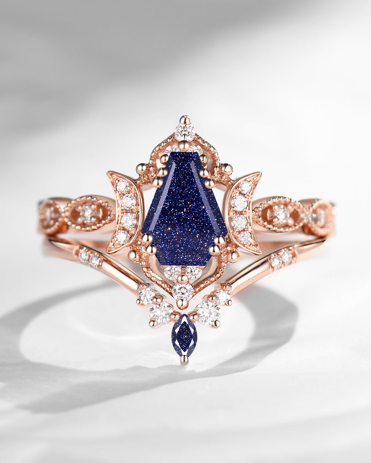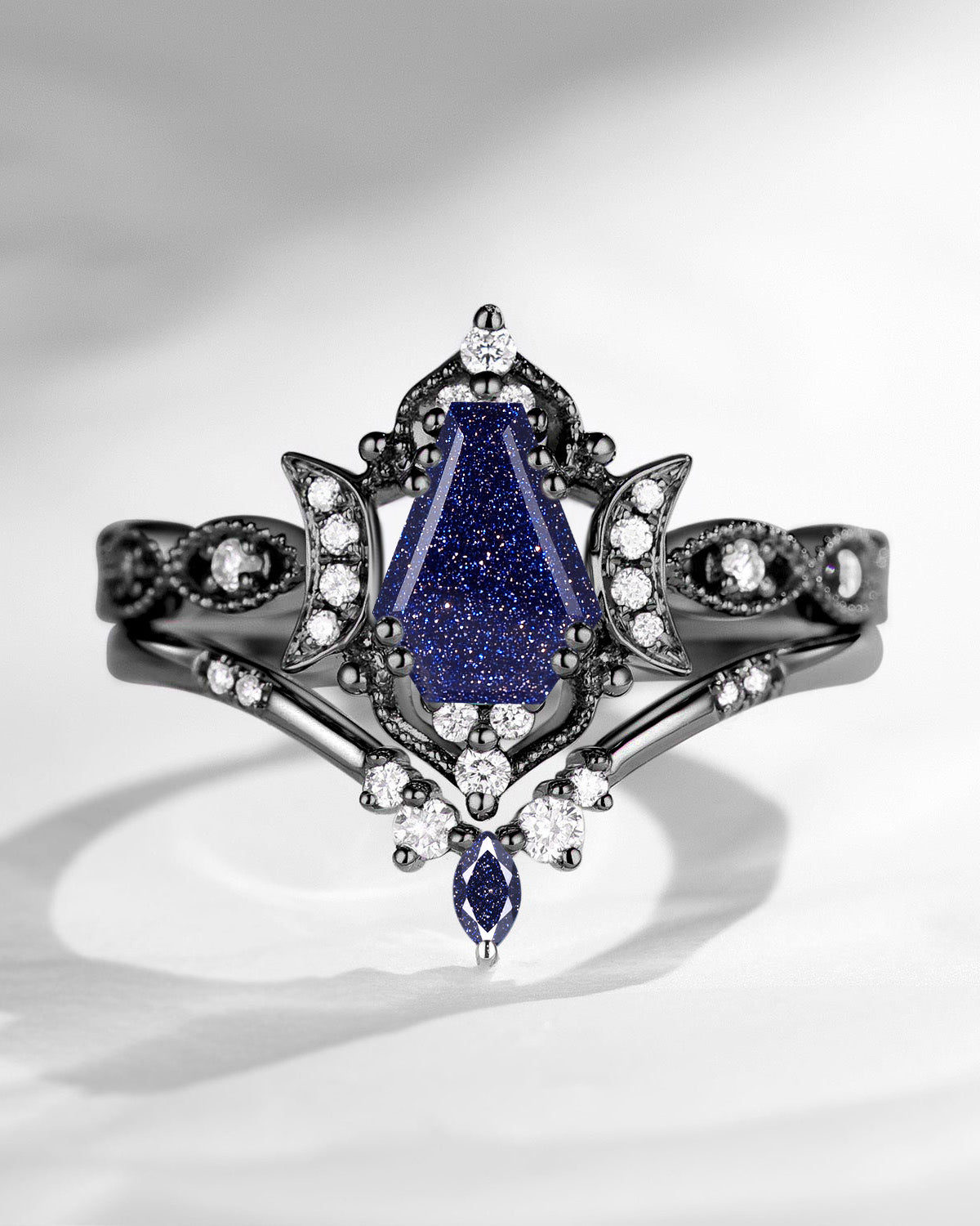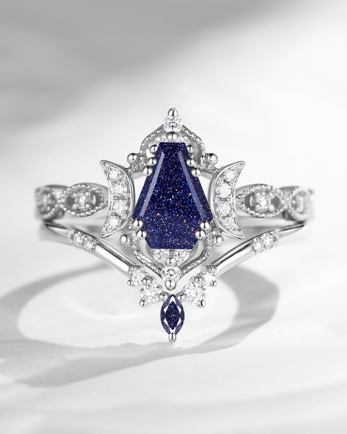 Crescent Moon | Unique Coffin Cut Blue Sandstone Engagement Ring Set 2pcs - Luna