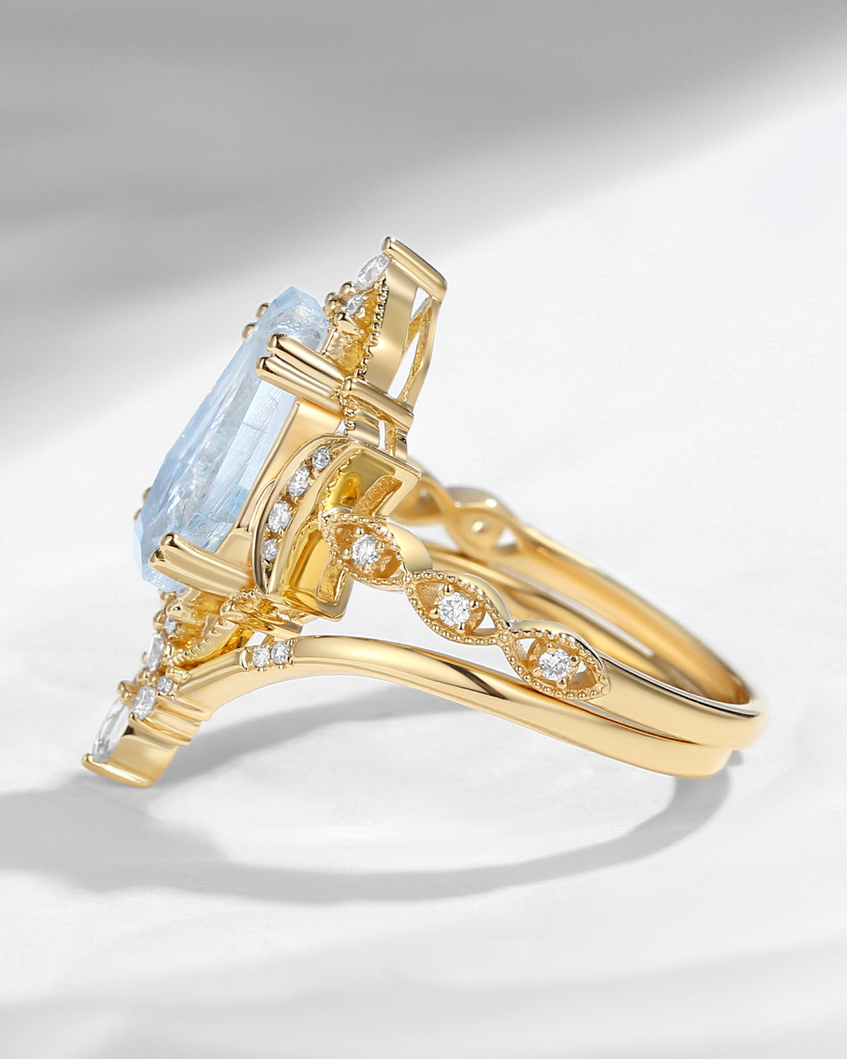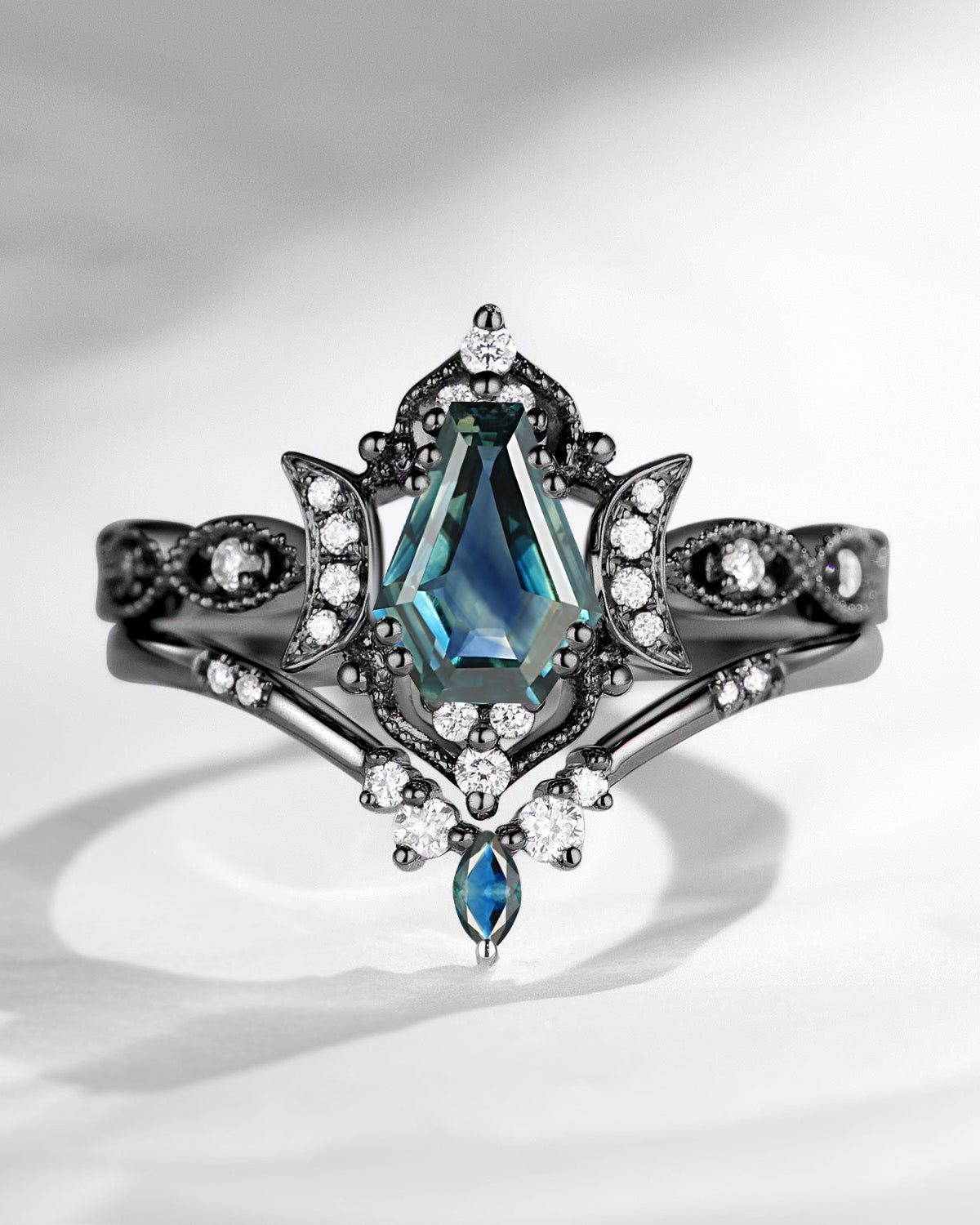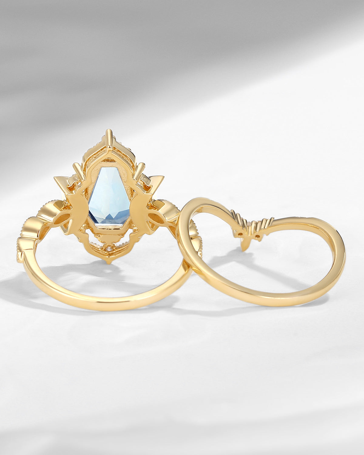 Crescent Moon | Unique Coffin Cut Blue Sandstone Engagement Ring Set 2pcs - Luna