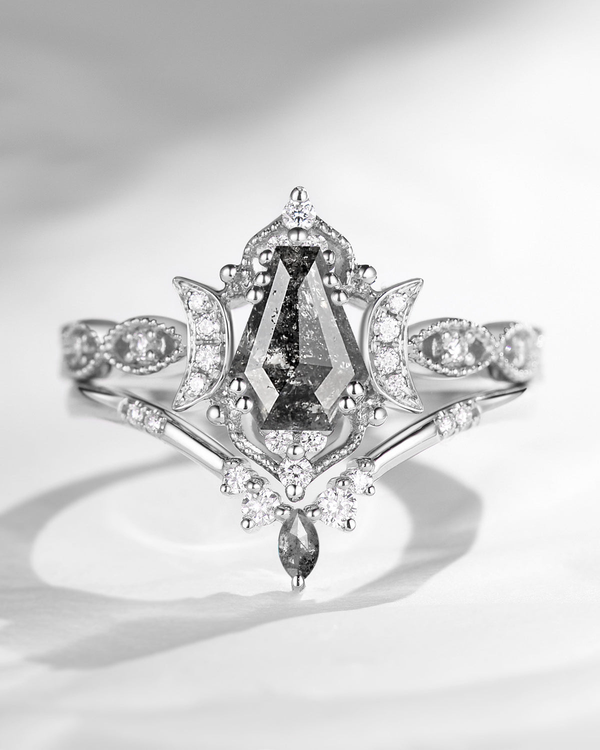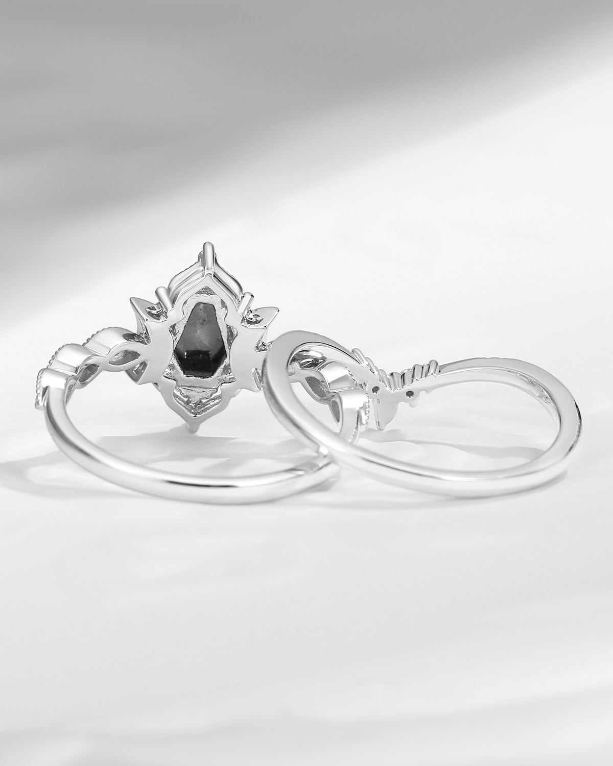 In Stock | Coffin Cut Salt And Pepper Diamond Engagement Ring Set 2pcs