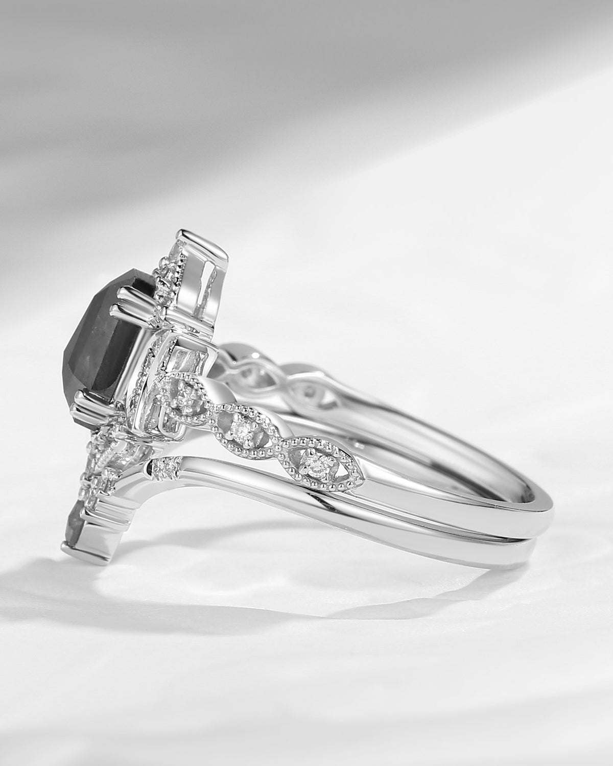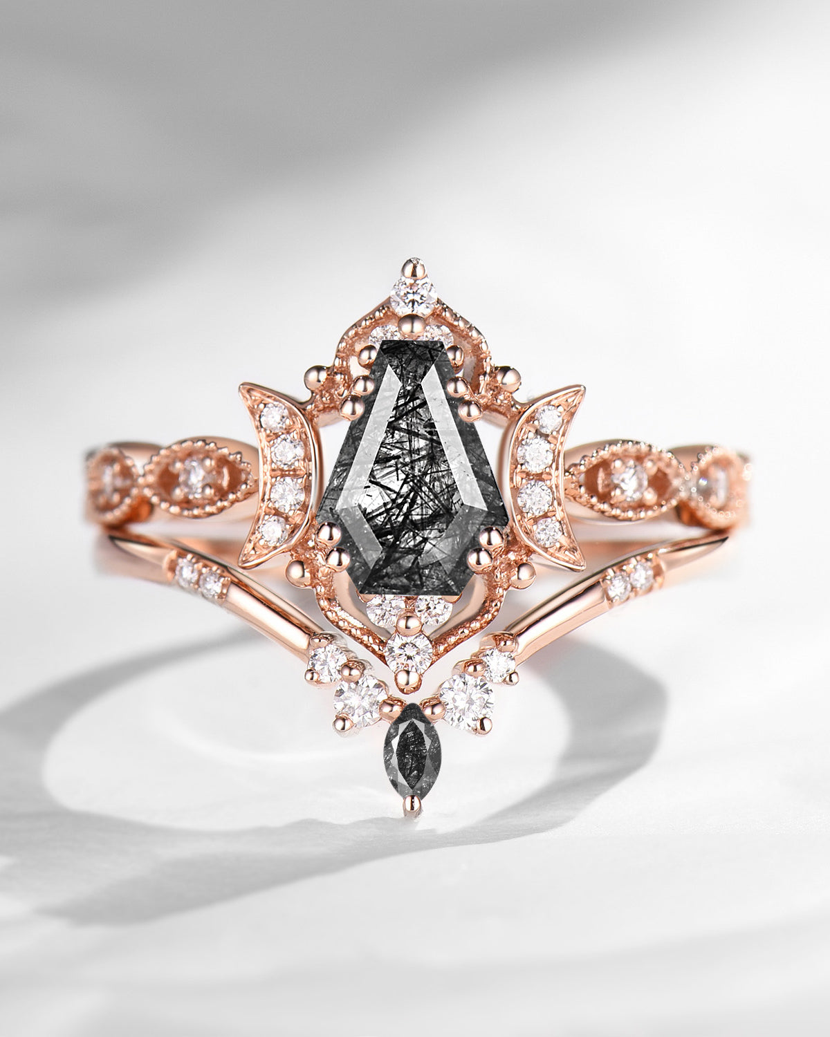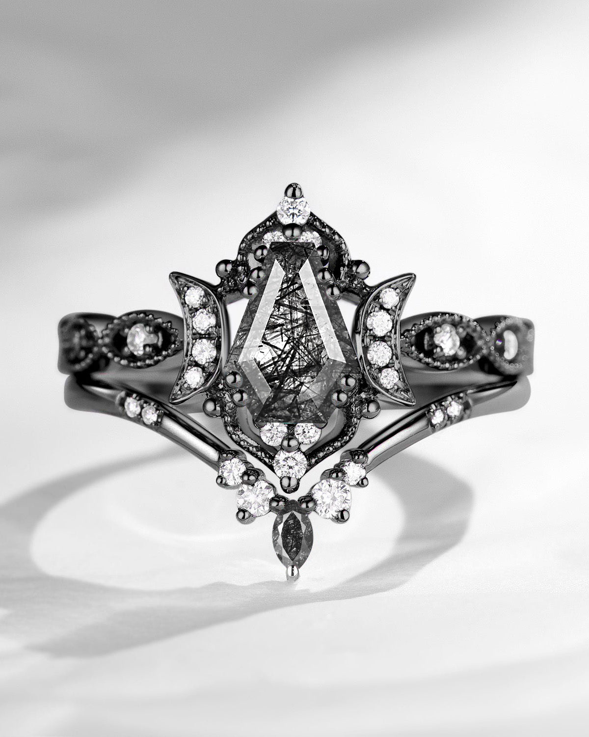 In Stock | Art Deco Coffin Cut Black Rutilated Quartz Engagement Ring Set 3pcs