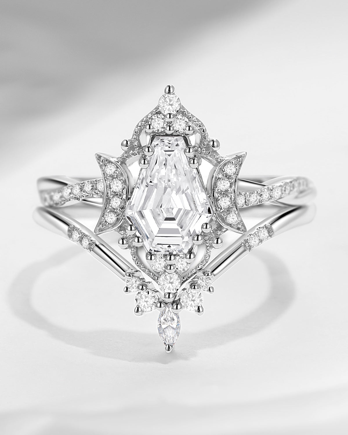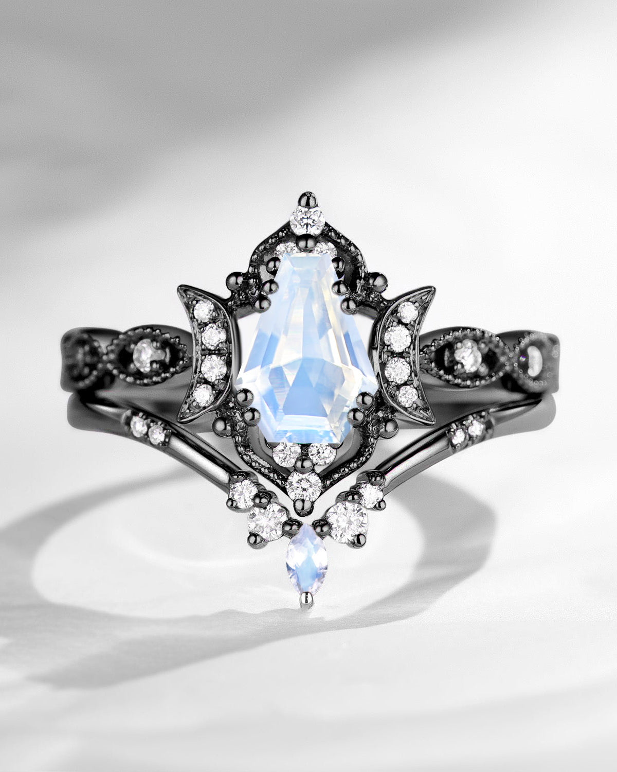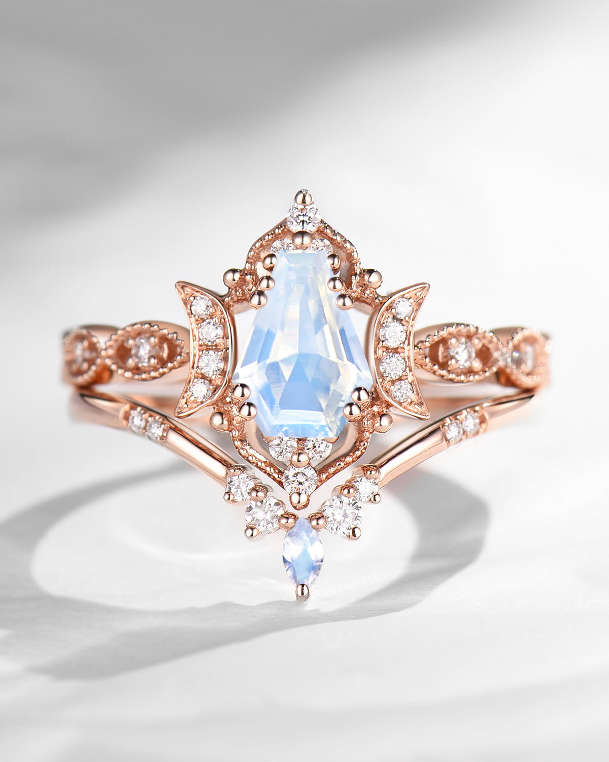 Crescent Moon | Unique Coffin Cut Moonstone Engagement Ring Set 2pcs - Luna