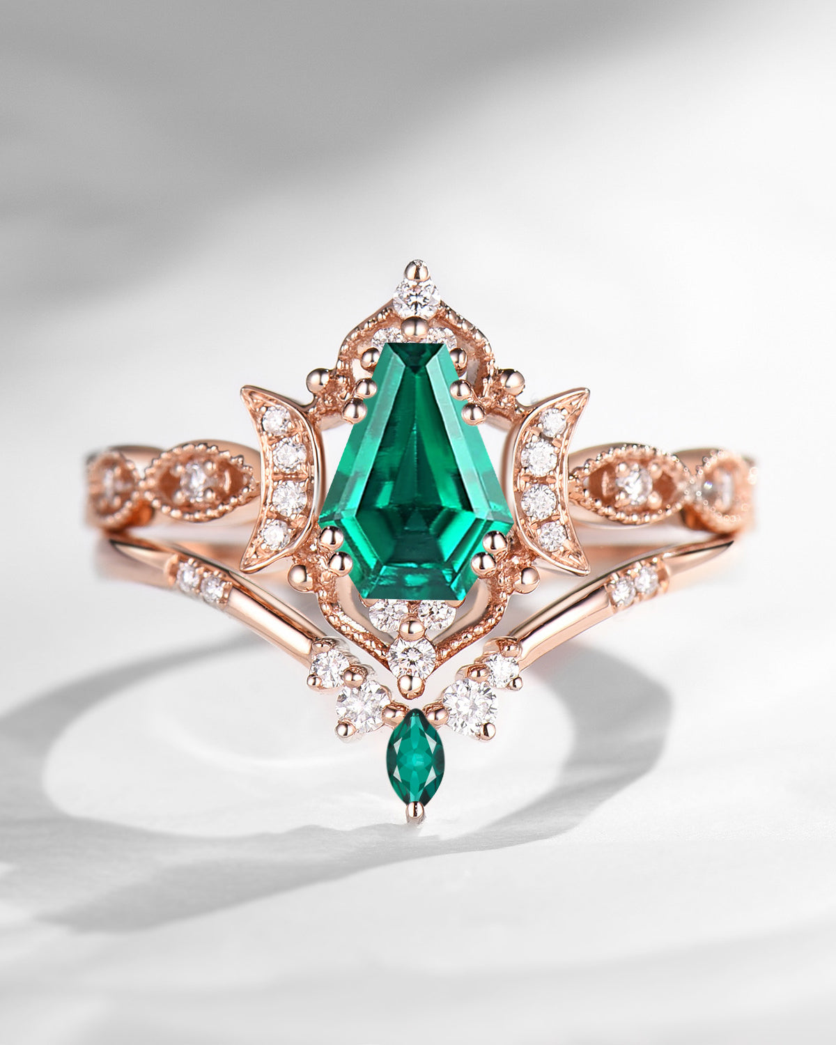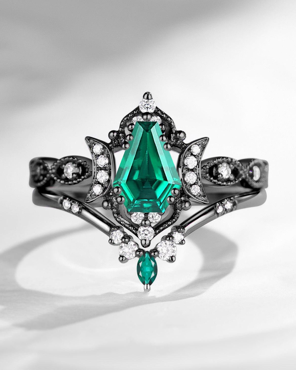 Crescent Moon | Unique Coffin Cut Lab Emerald Engagement Ring Set 2pcs - Luna