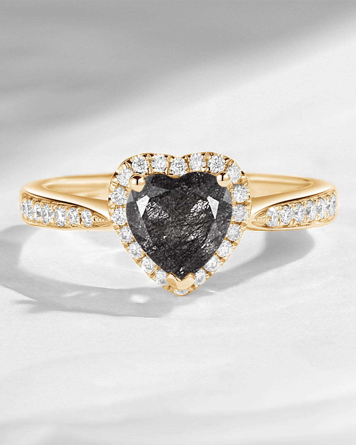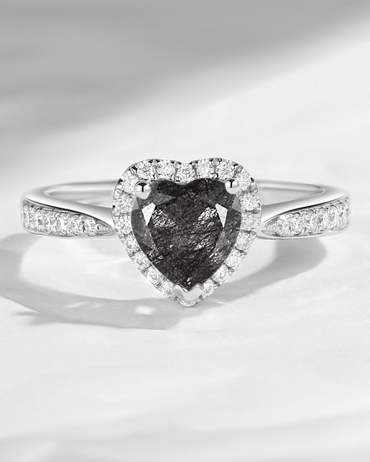 Classic Heart Shaped Halo Black Rutilated Quartz Promise Ring