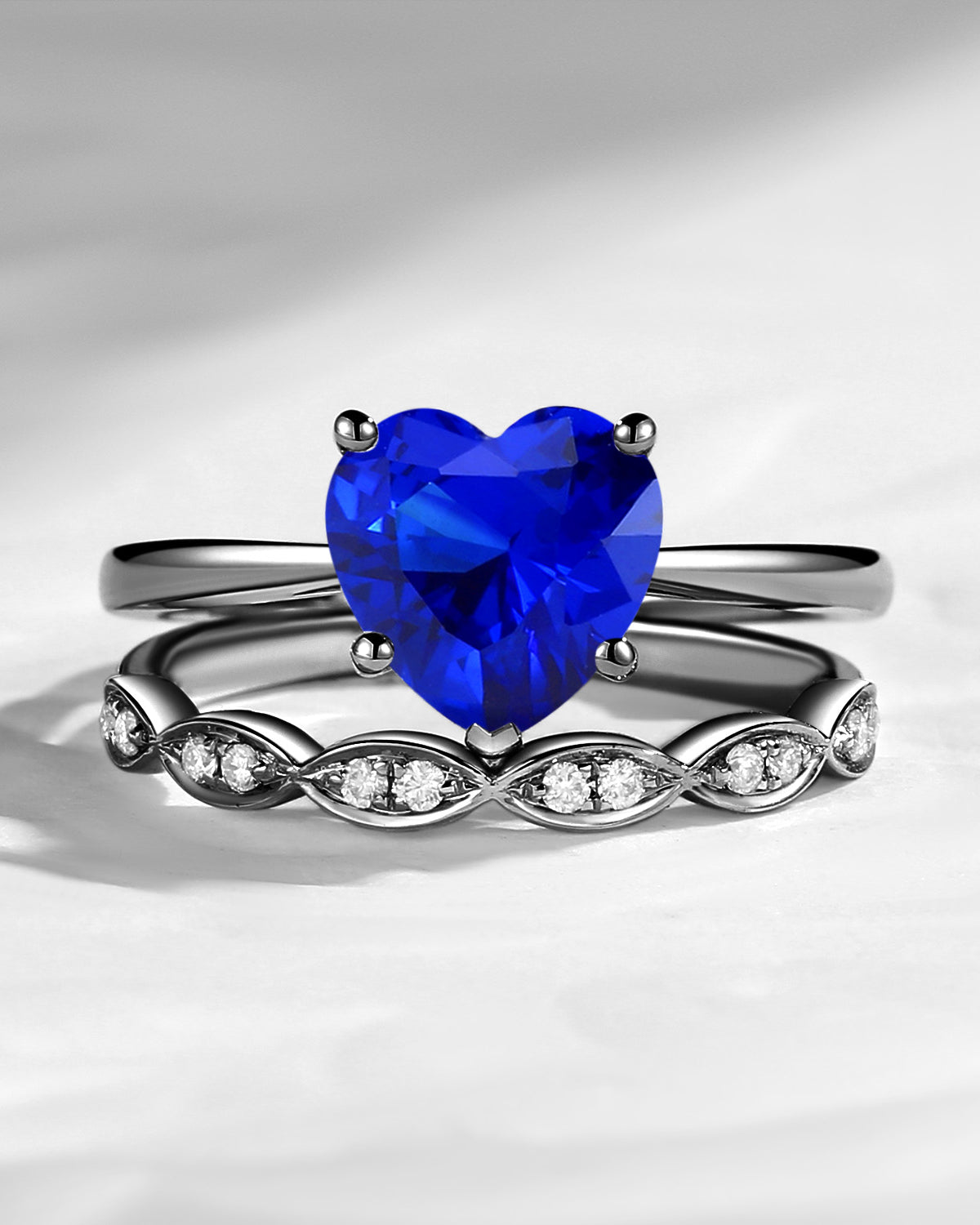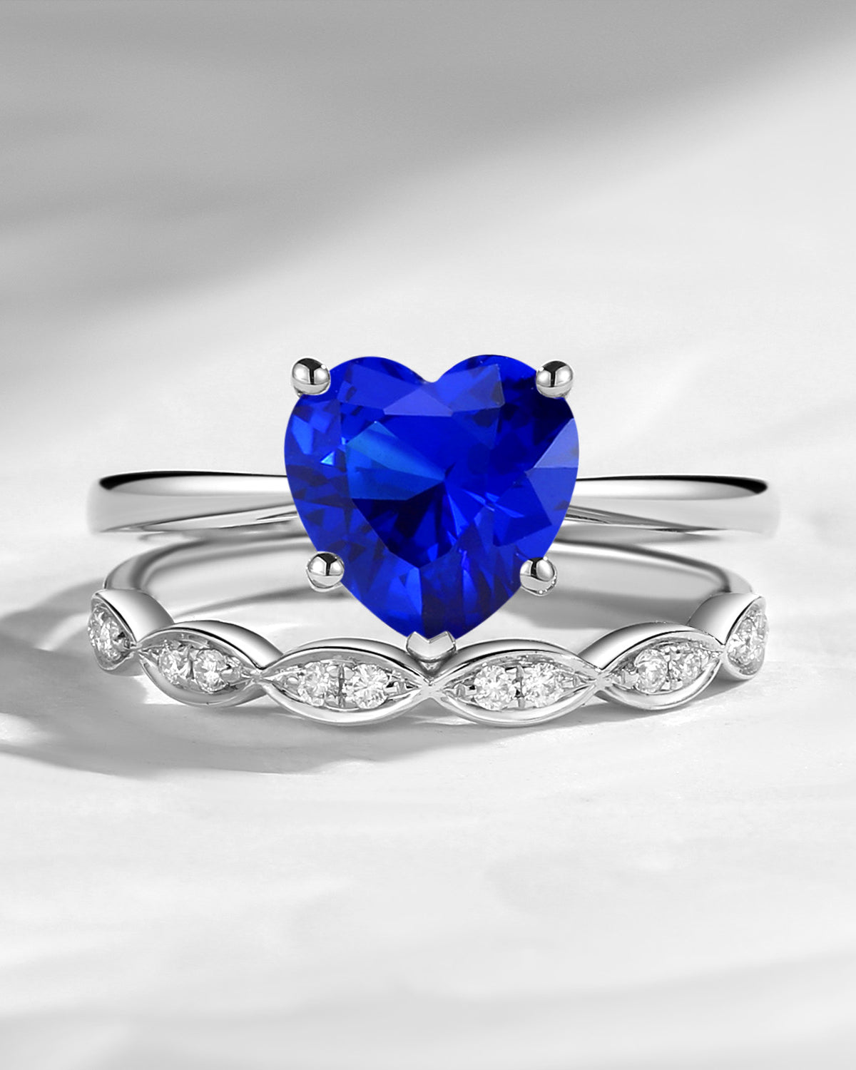 Unique Heart Shaped Solitare Lab Sapphire Engagement Ring 2pcs Set
