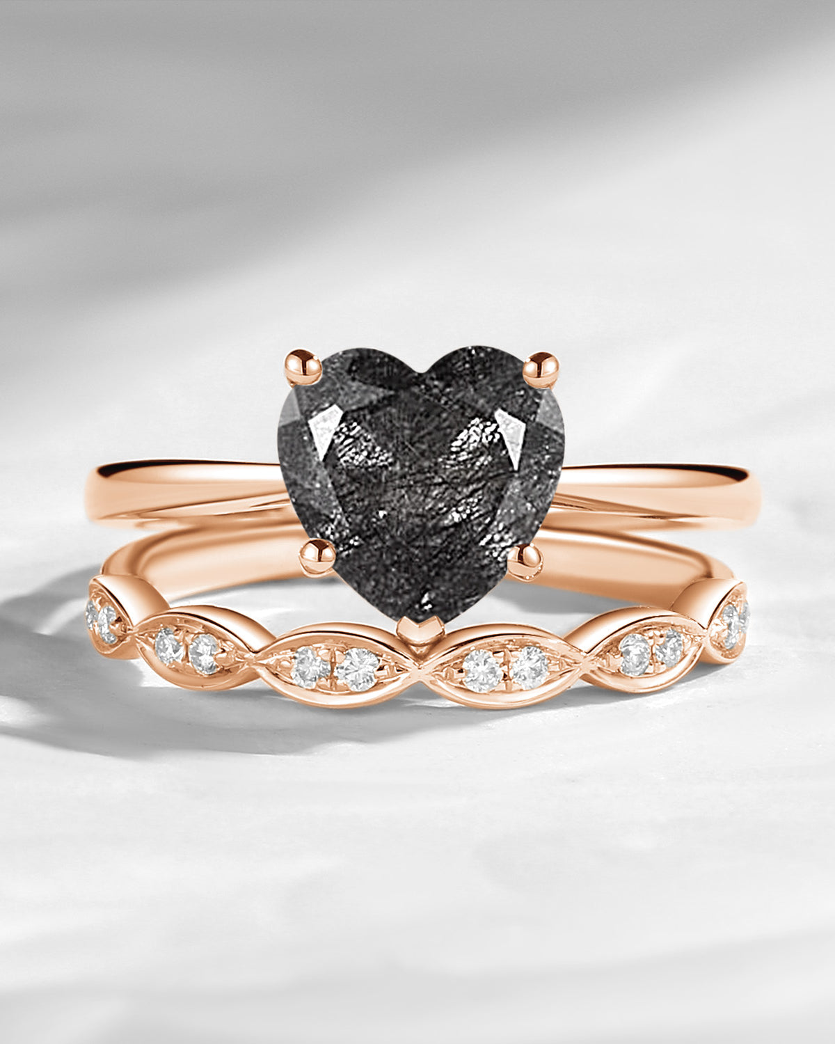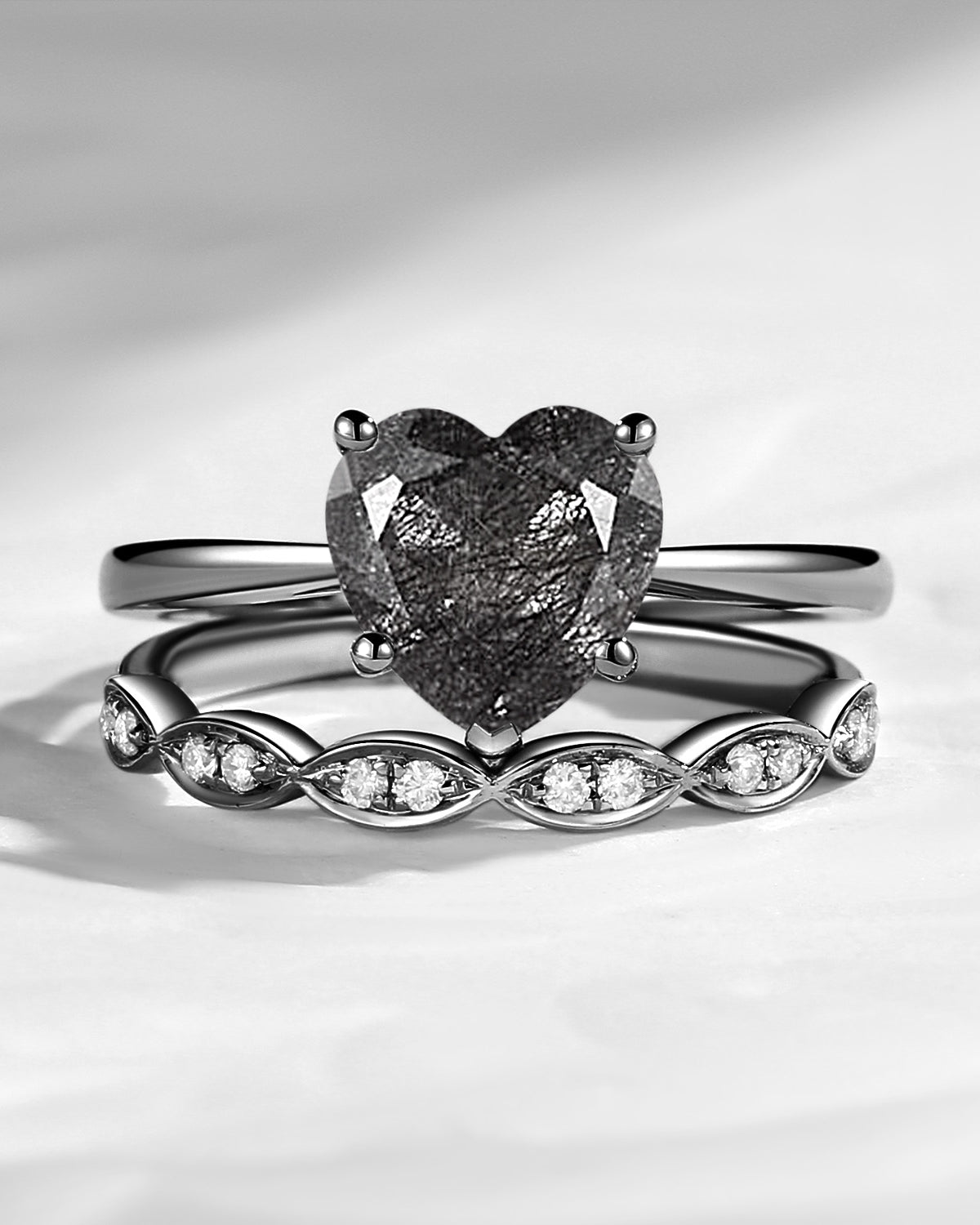 Unique Heart Shaped Solitare Black Rutilated Quartz Engagement Ring 2pcs Set