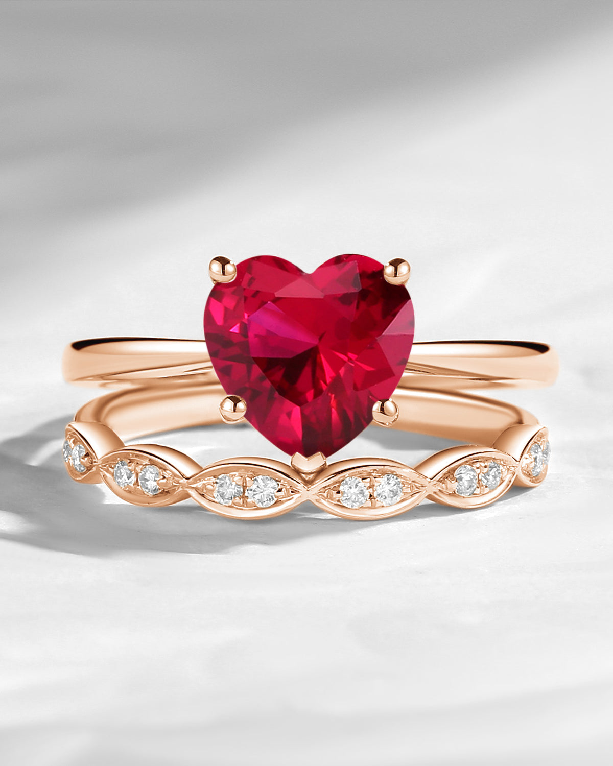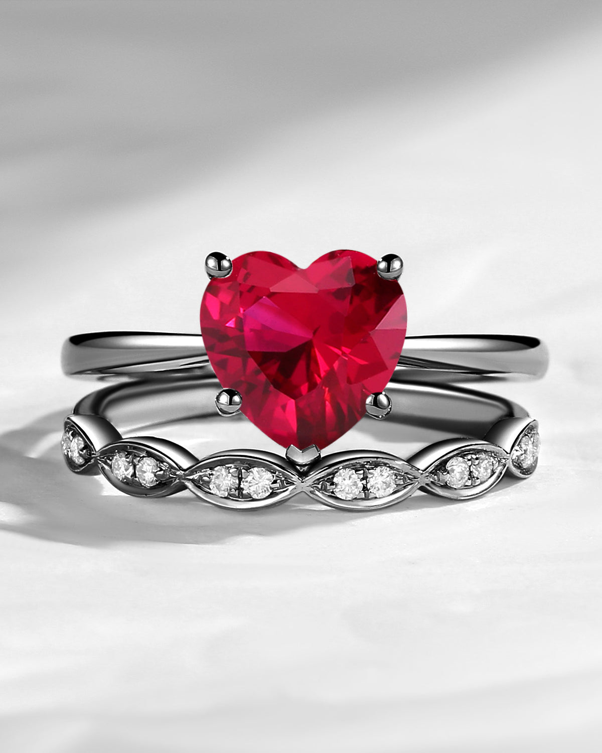 Unique Heart Shaped Solitare Lab Ruby Engagement Ring 2pcs Set