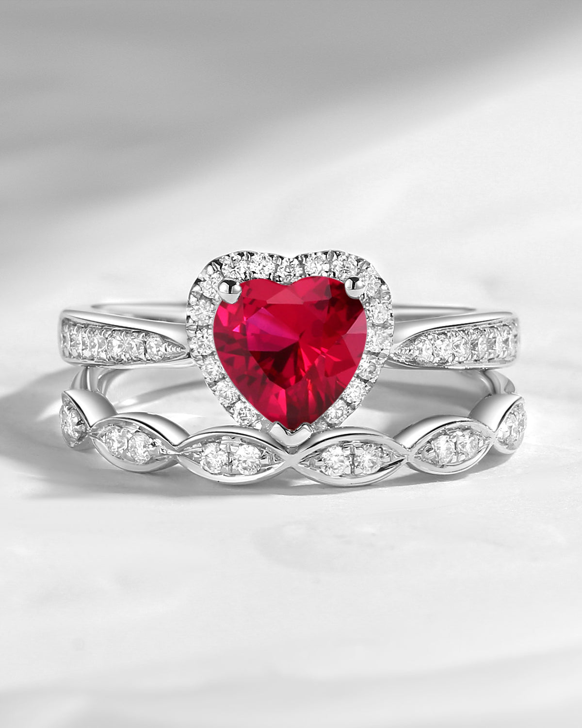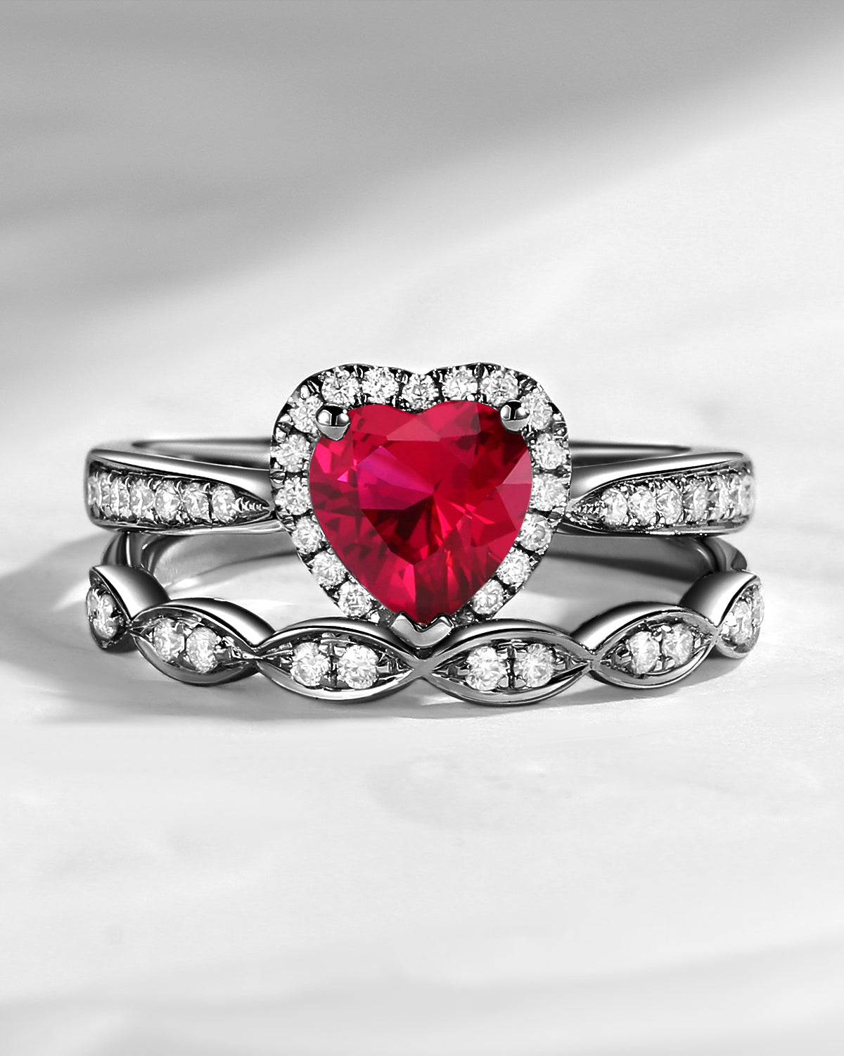 Unique Heart Shaped Halo Lab Ruby Engagement Ring 2pcs Set