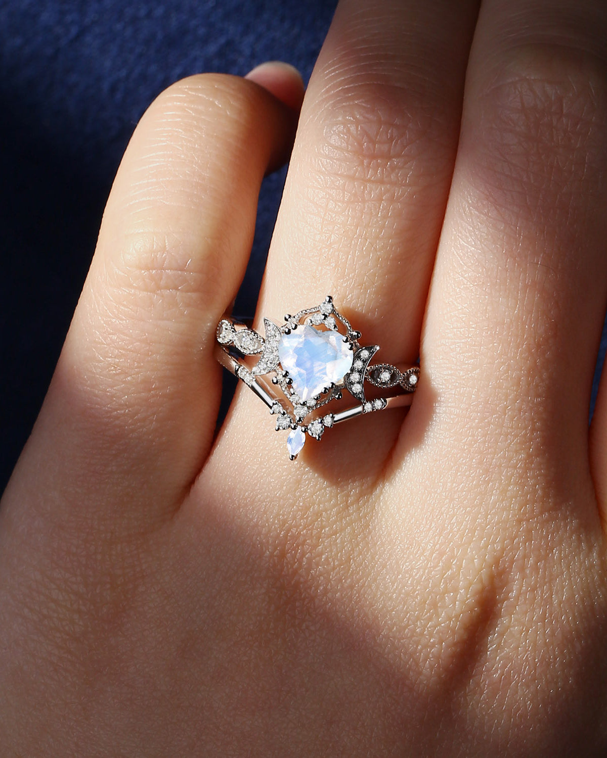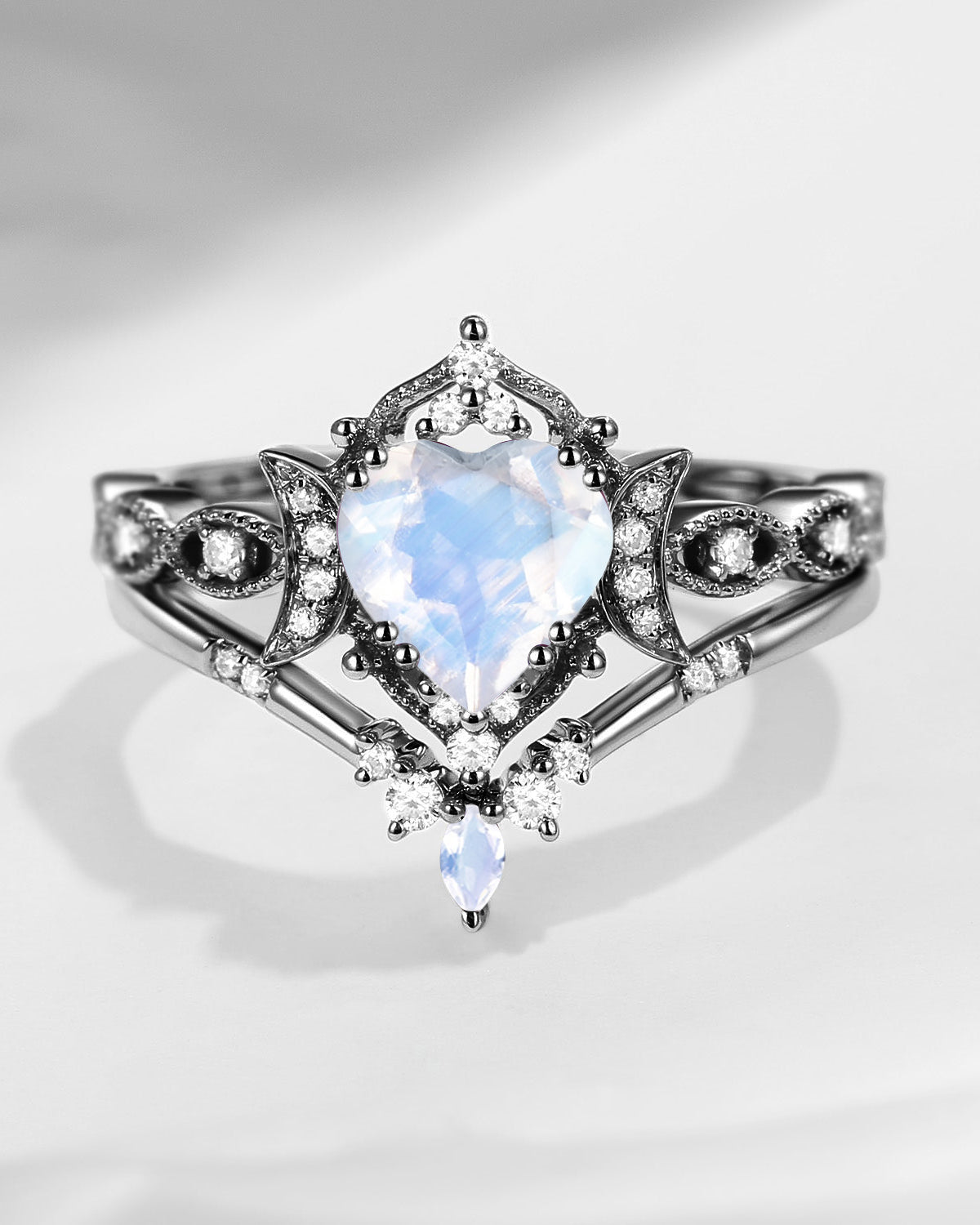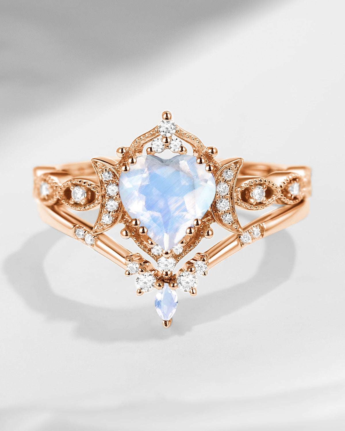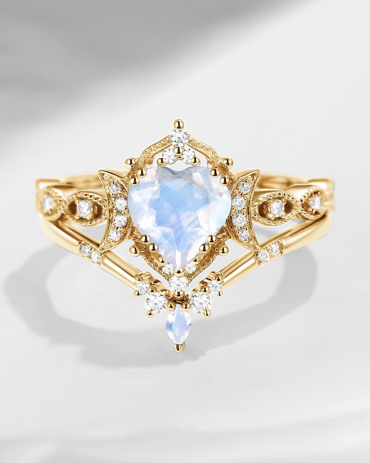 Crescent Moon | 1.5ct 18K Heart Shaped Moonstone Engagement Ring Set 2pcs - Luna
