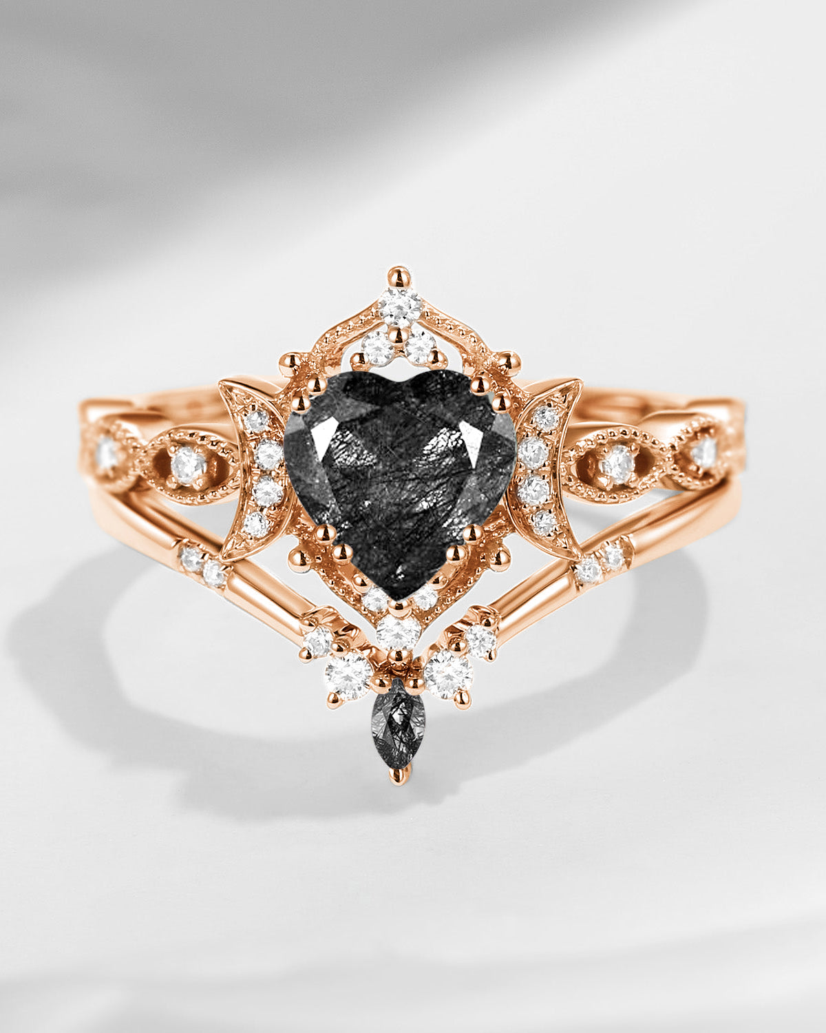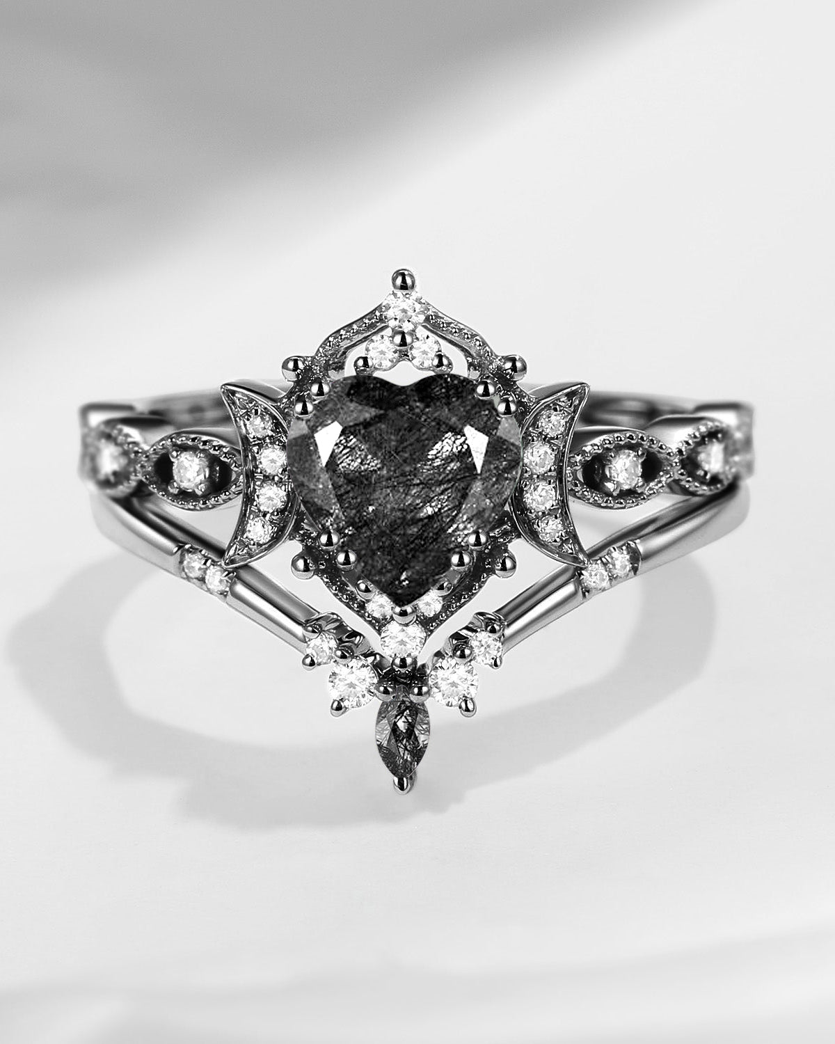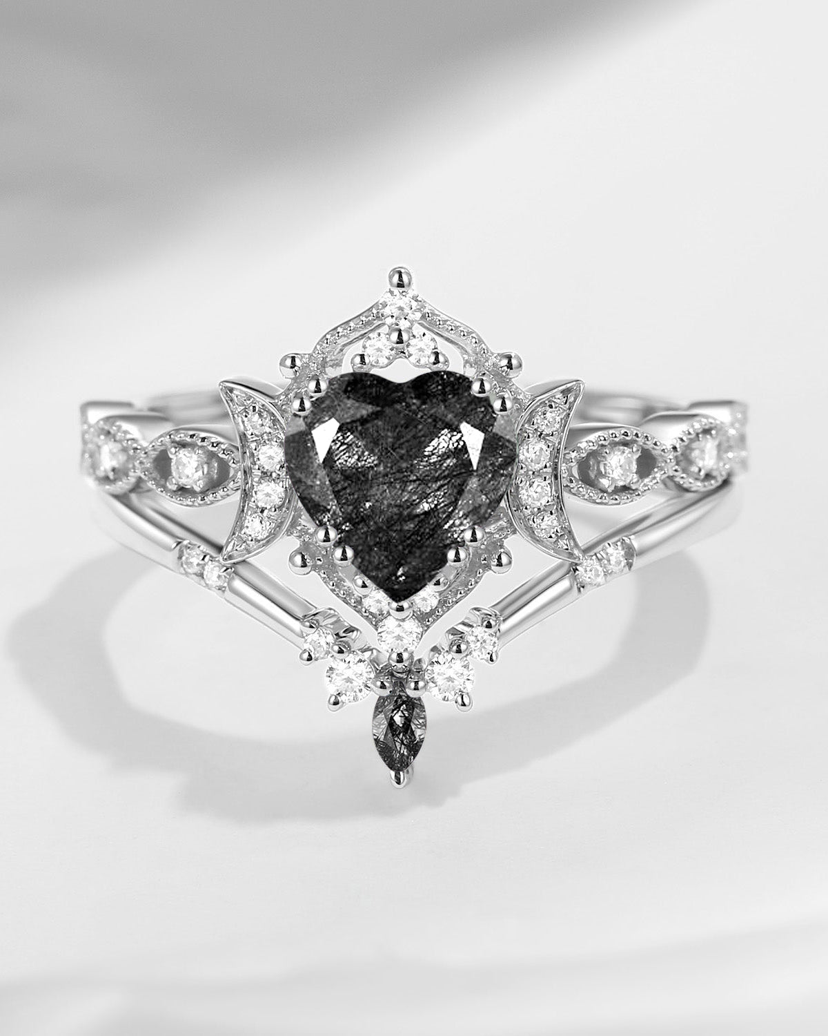 Heart Shaped Black Moissanite Vintage Bridal Set 2pcs - Bat Ring