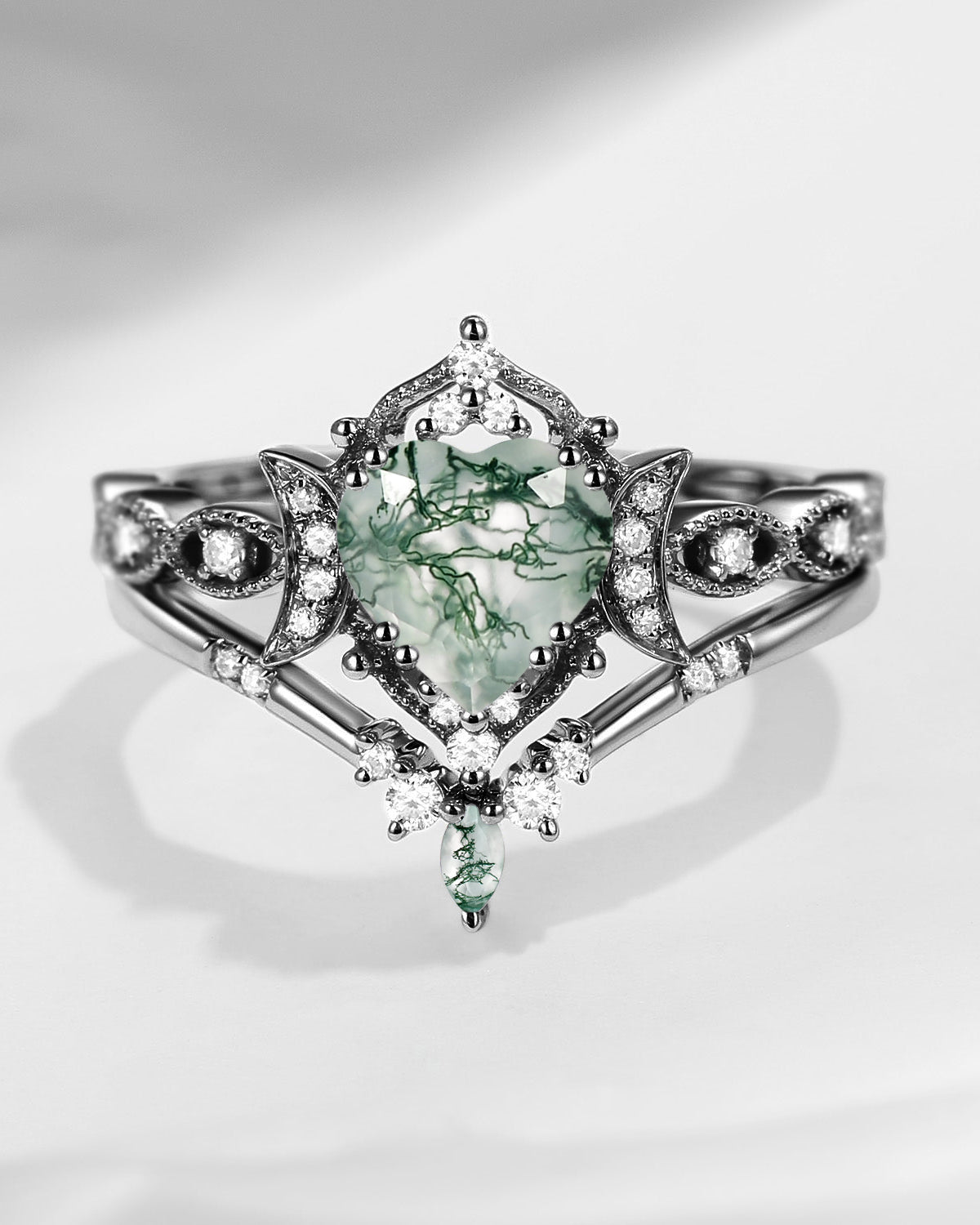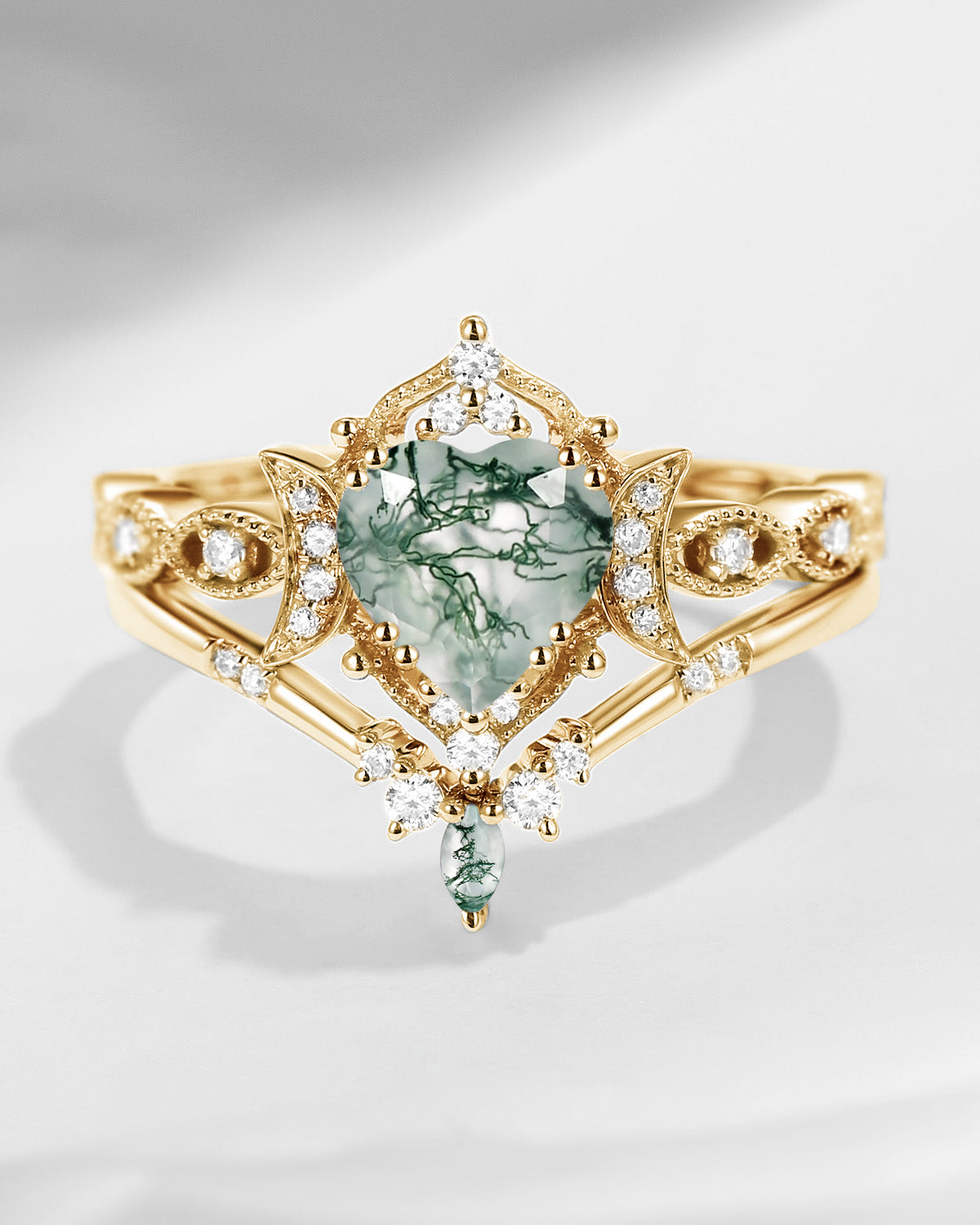 Crescent Moon | 18K Heart Shaped Moss Agate Engagement Ring Set 2pcs - Luna