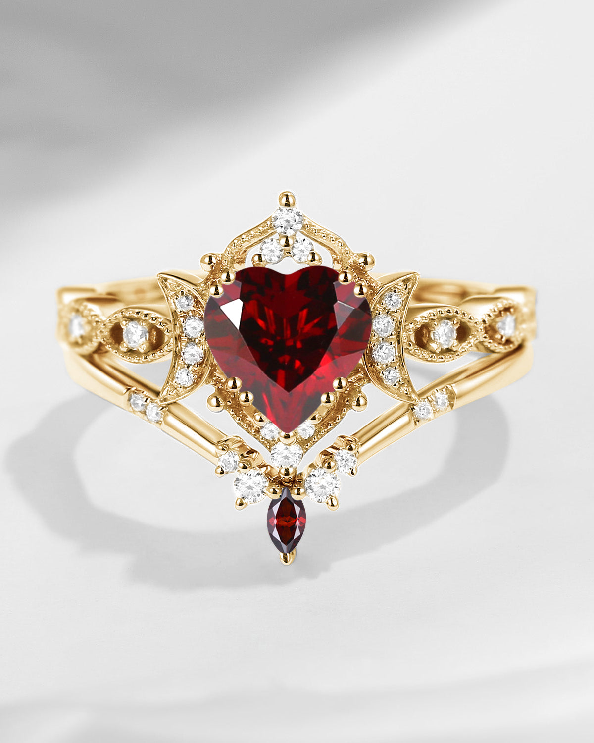 Crescent Moon | 18K Heart Shaped Garnet Engagement Ring Set 2pcs - Luna