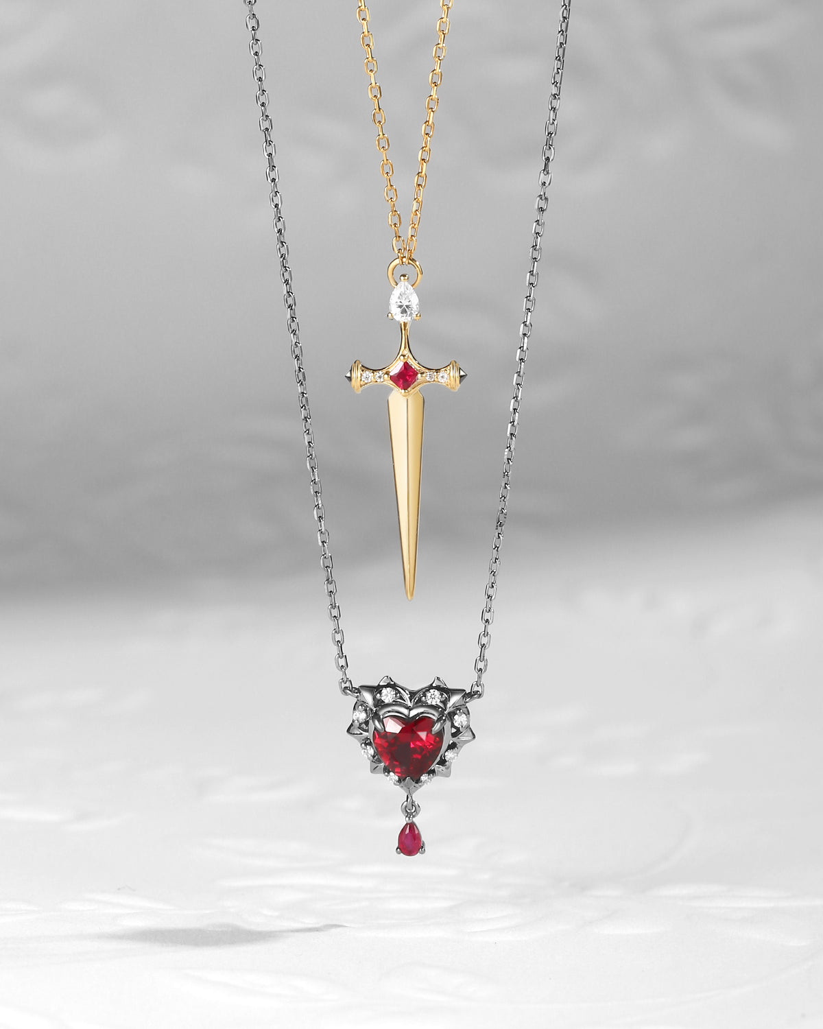 Lab Ruby Heart Cut Couple Necklaces Set 2pcs - Cupid's Arrow