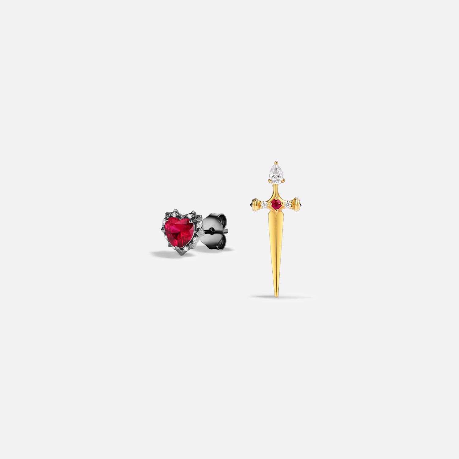 Lab Ruby Heart Shaped And Sword Earrings - Cupid's Arrow