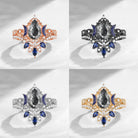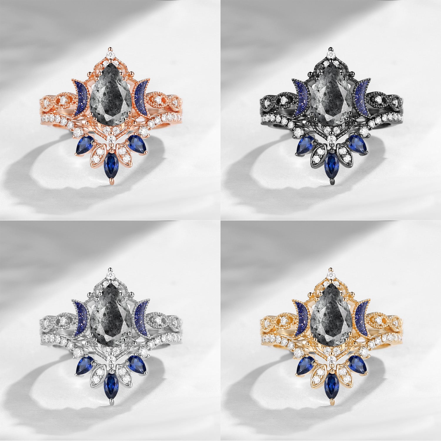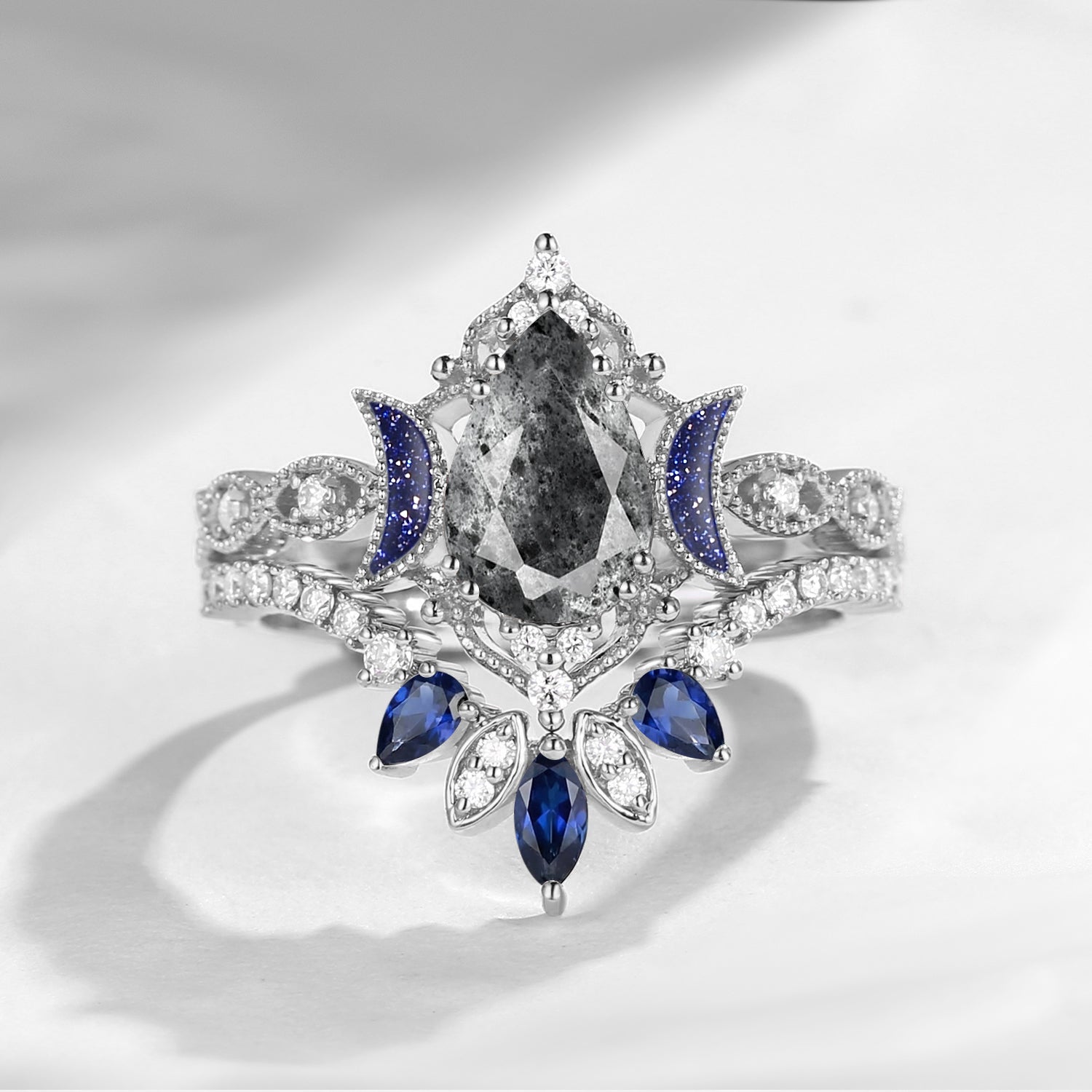 Crescent Moon | Blue Moon Inspired Pear Herkimer Diamond 'Ultra Galaxy' Engagement Ring Set 2pcs