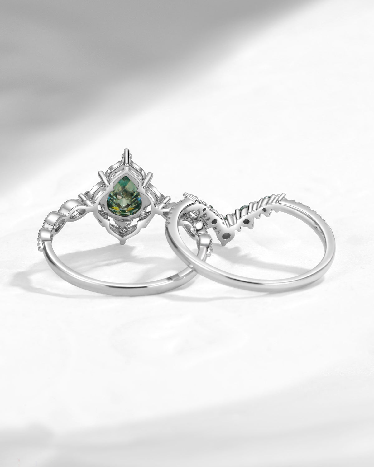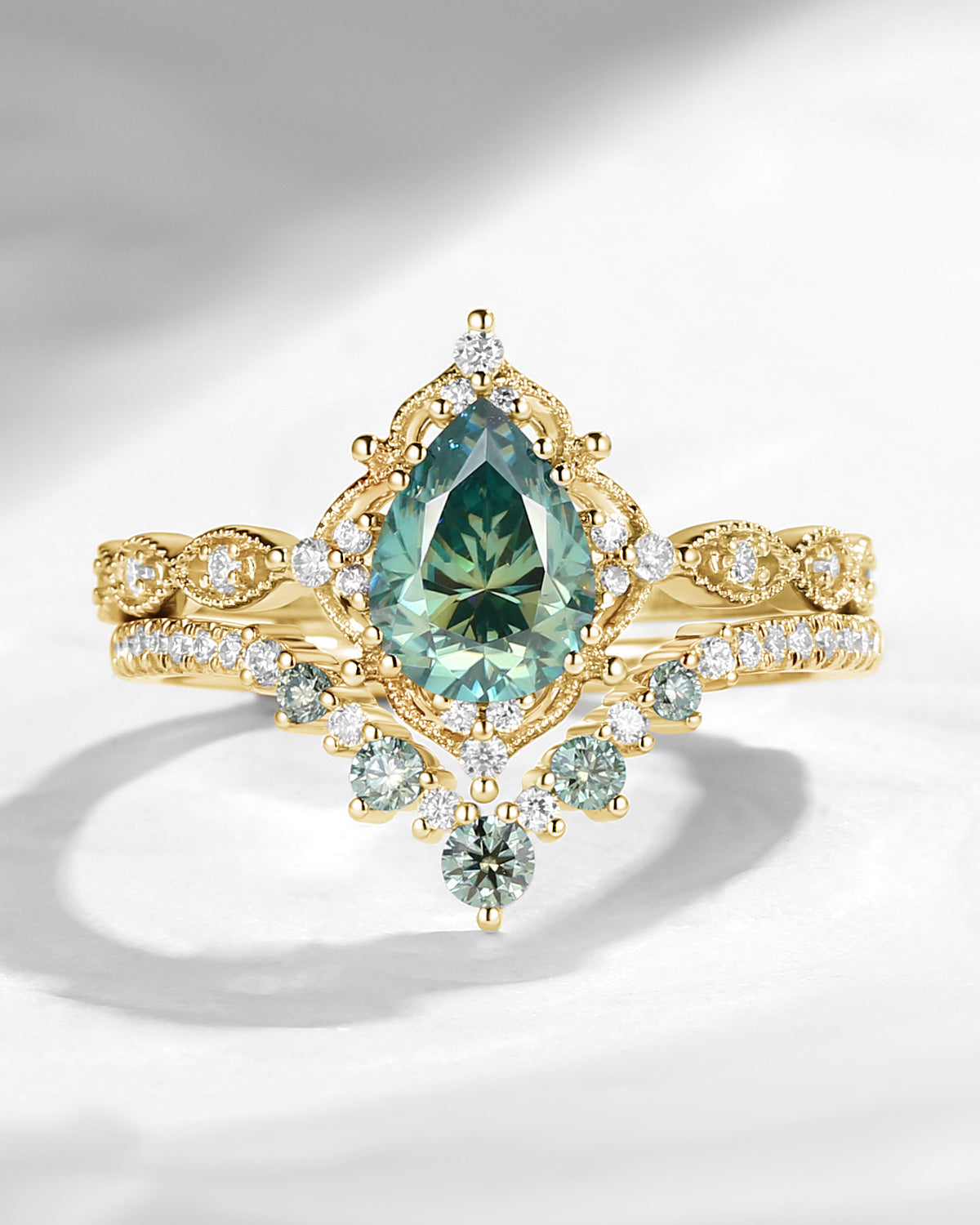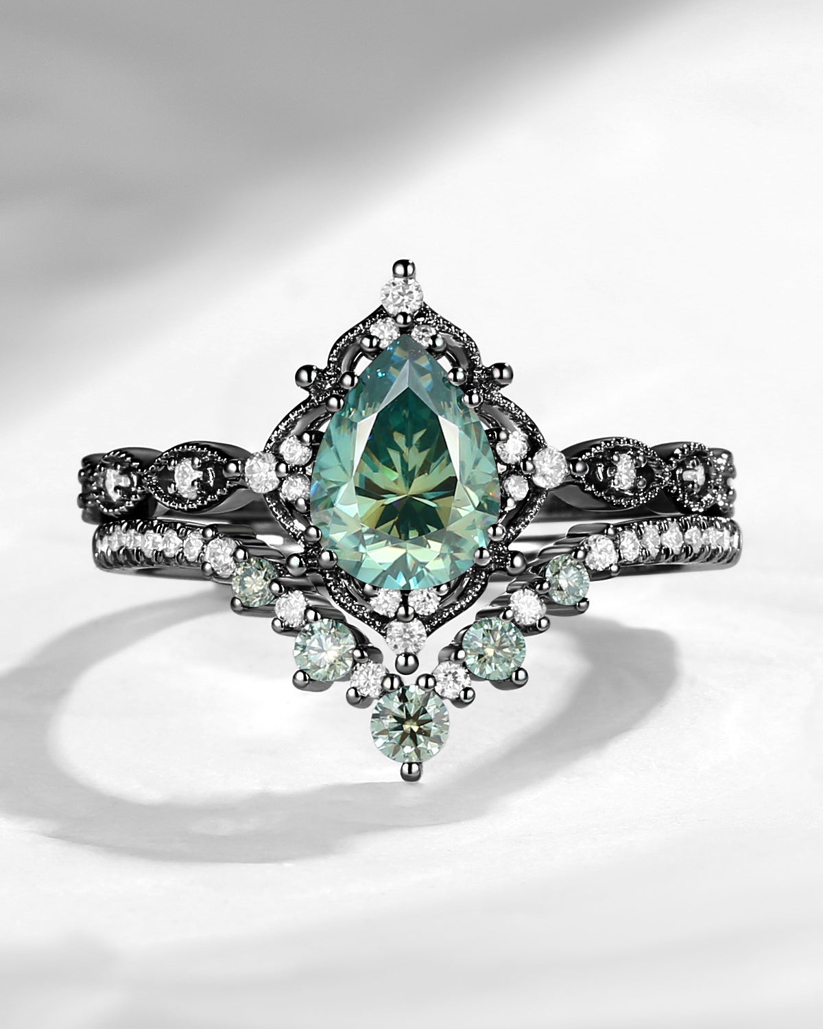 1.5ct Pear Shaped Lab Emerald Engagement Ring Set 2pcs - Evelyn
