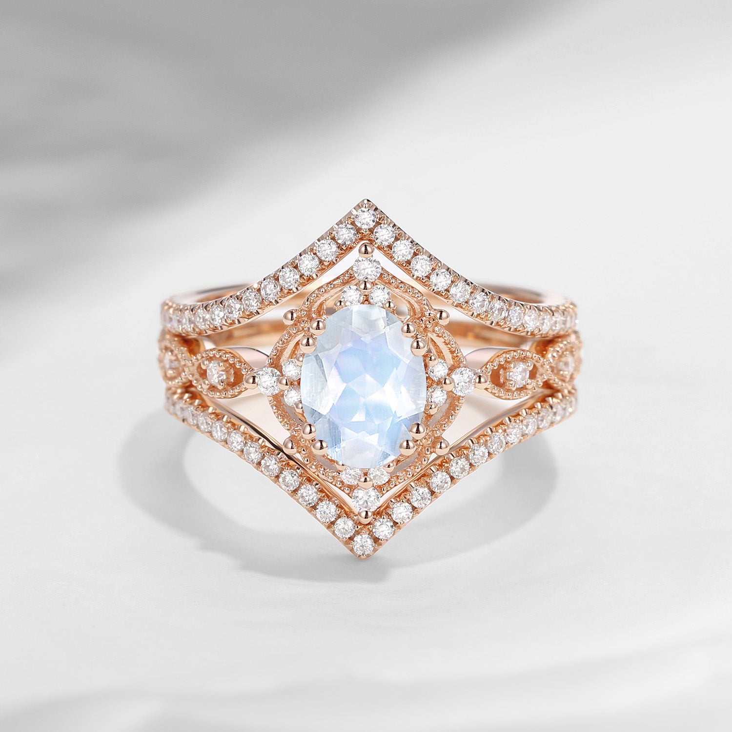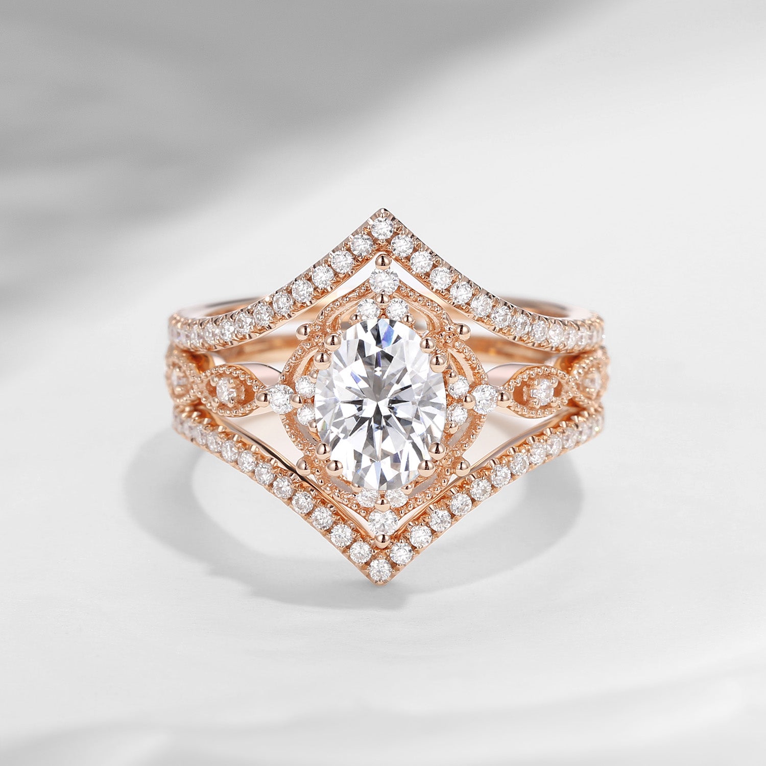 Vintage Rose Gold 1.5ct Oval Moissanite Ring Bridal Set 3pcs Art Deco Engagement Ring Flower Ring Chevron Band Stacking Ring Cluster Halo