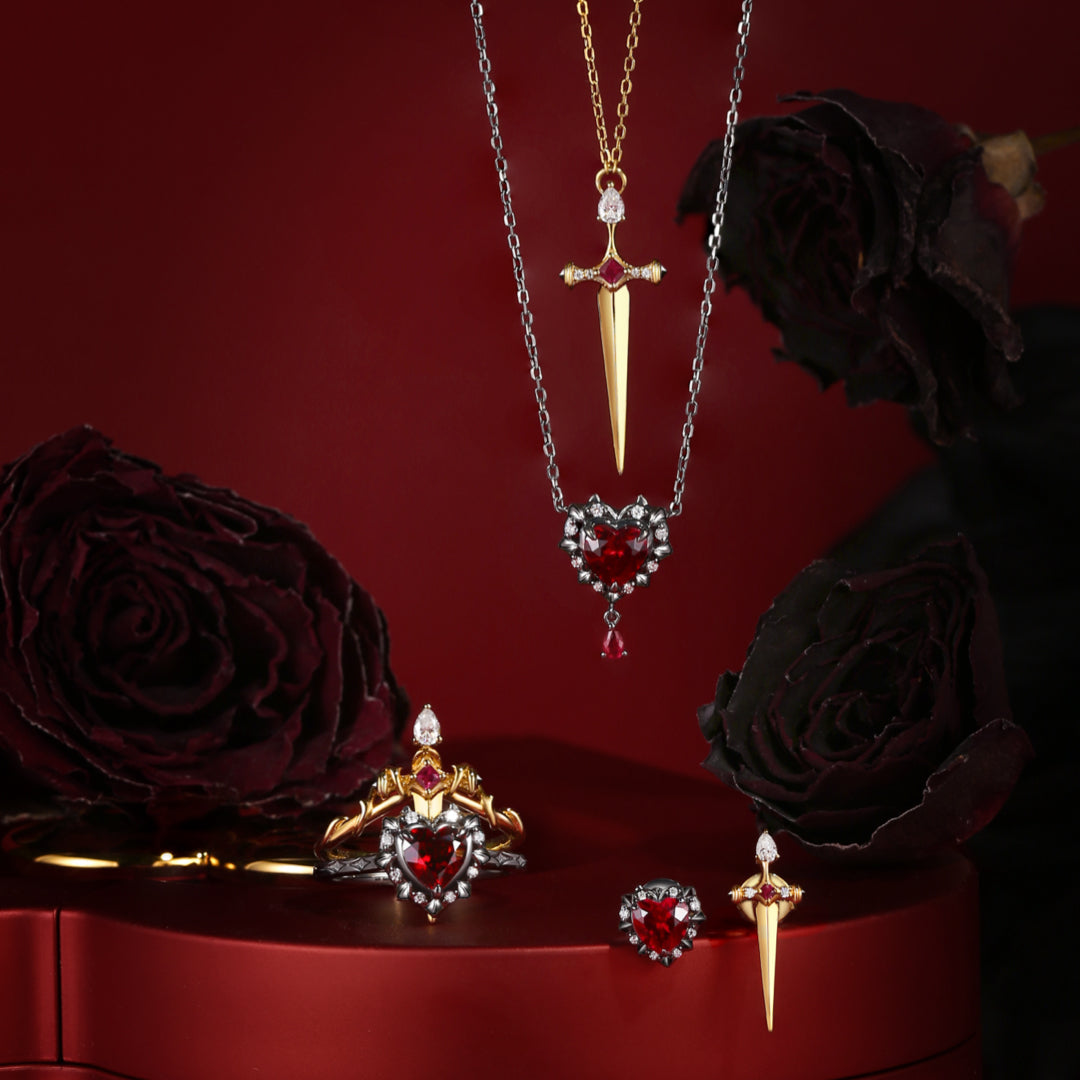 Unique Heart Shaped Lab Ruby & Sword Couple Jewelry Set - 'Cupid's Arrow' Jewelry Box