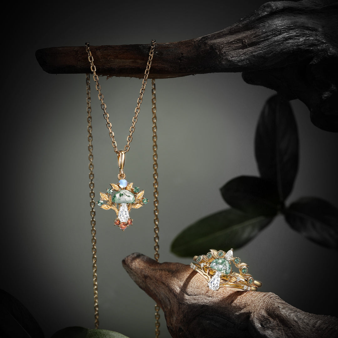 Maximalist Nature Inspired Half Moon Moss Agate + Coffin Moissanite Mushroom Necklace - 'Tree of Life'