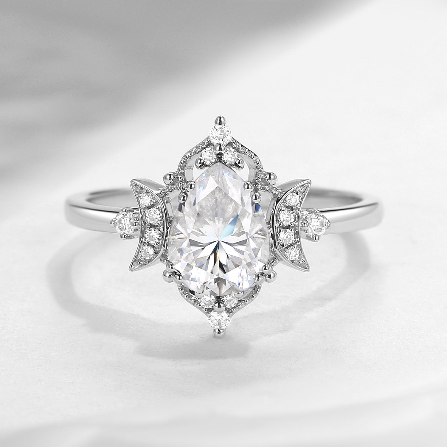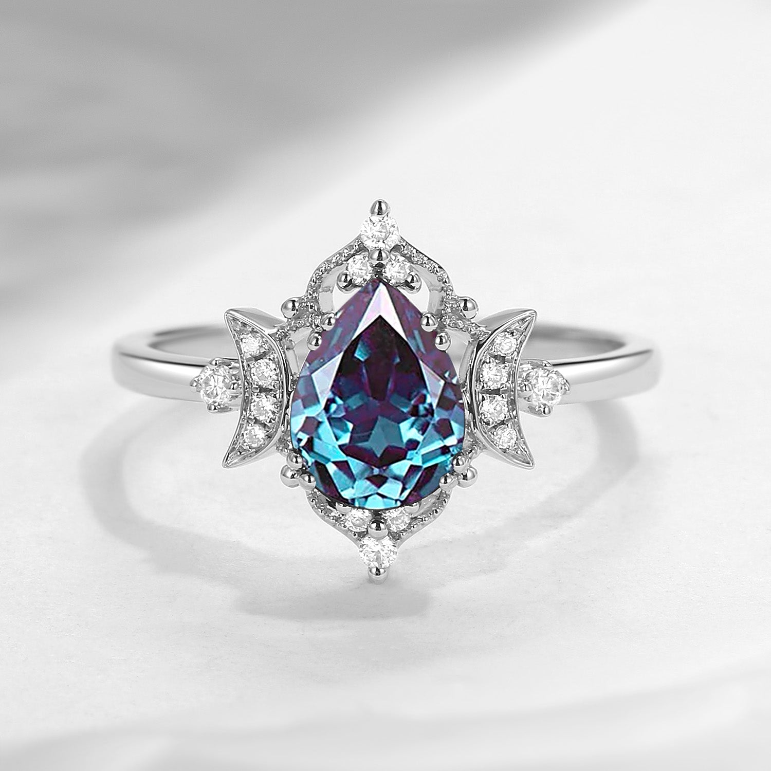 Lab Alexandrite Engagement Ring 1ct Mystic Boho Ring White Gold Ring Unique Pear Moon Star Ring Changing Color Alexandrite Gift Women