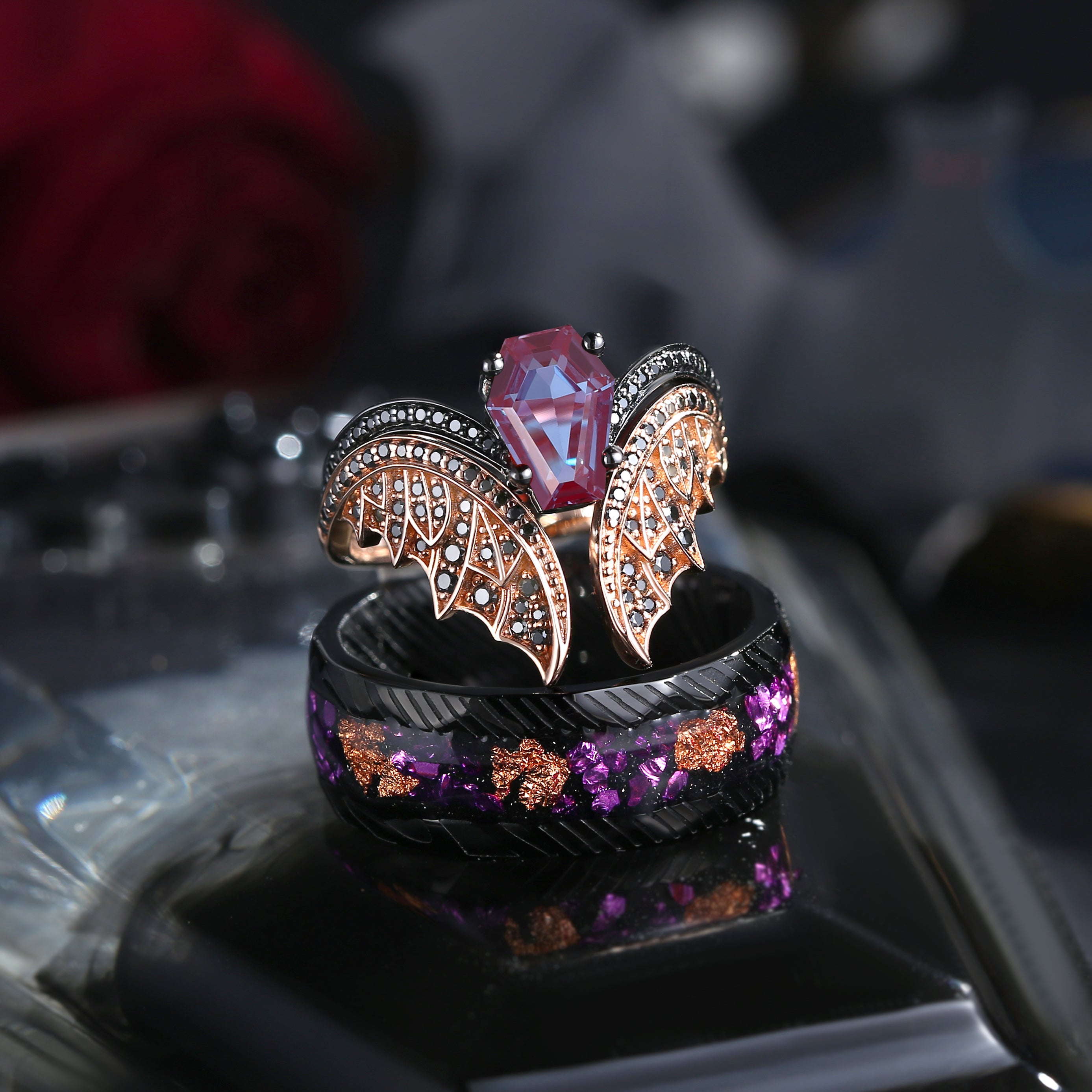 Bat Wing Inspired Coffin Lab Alexandrite With Gold Leaf Couple Bridal Ring Set