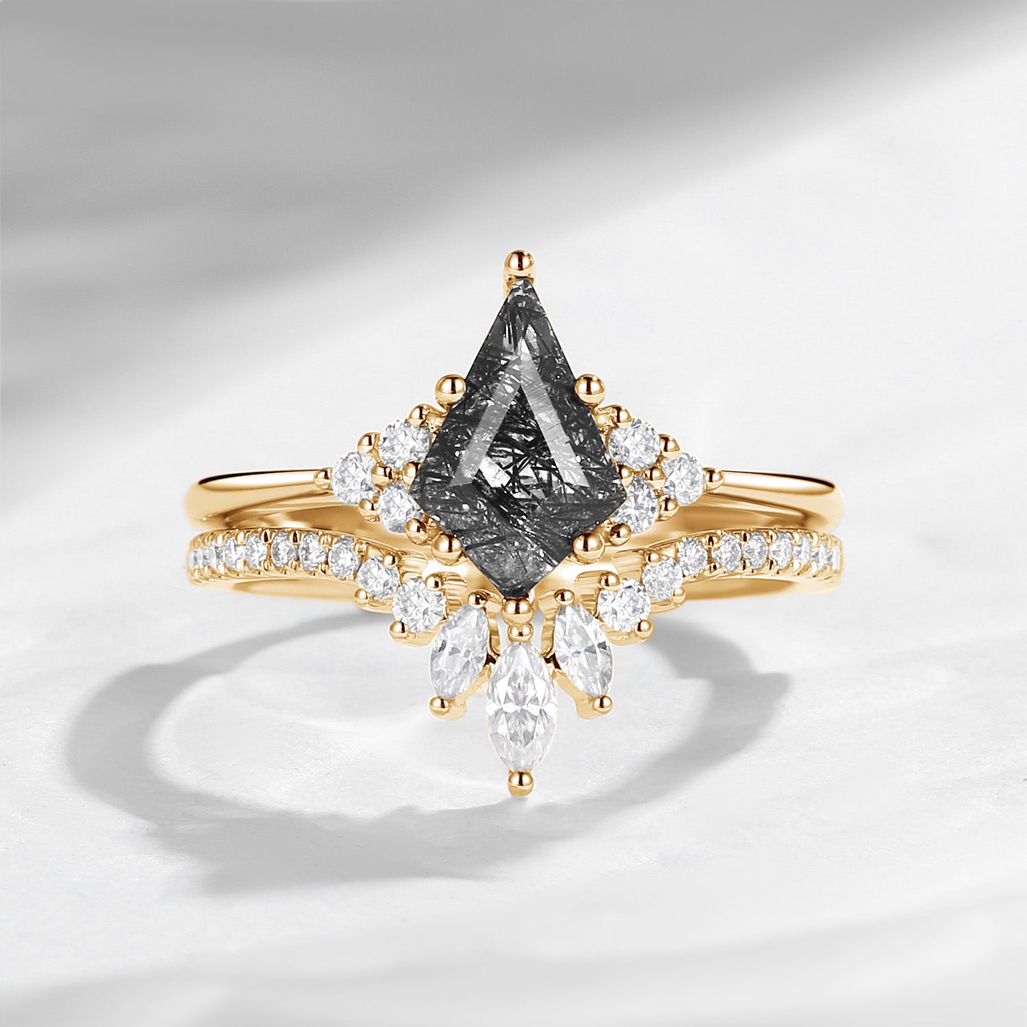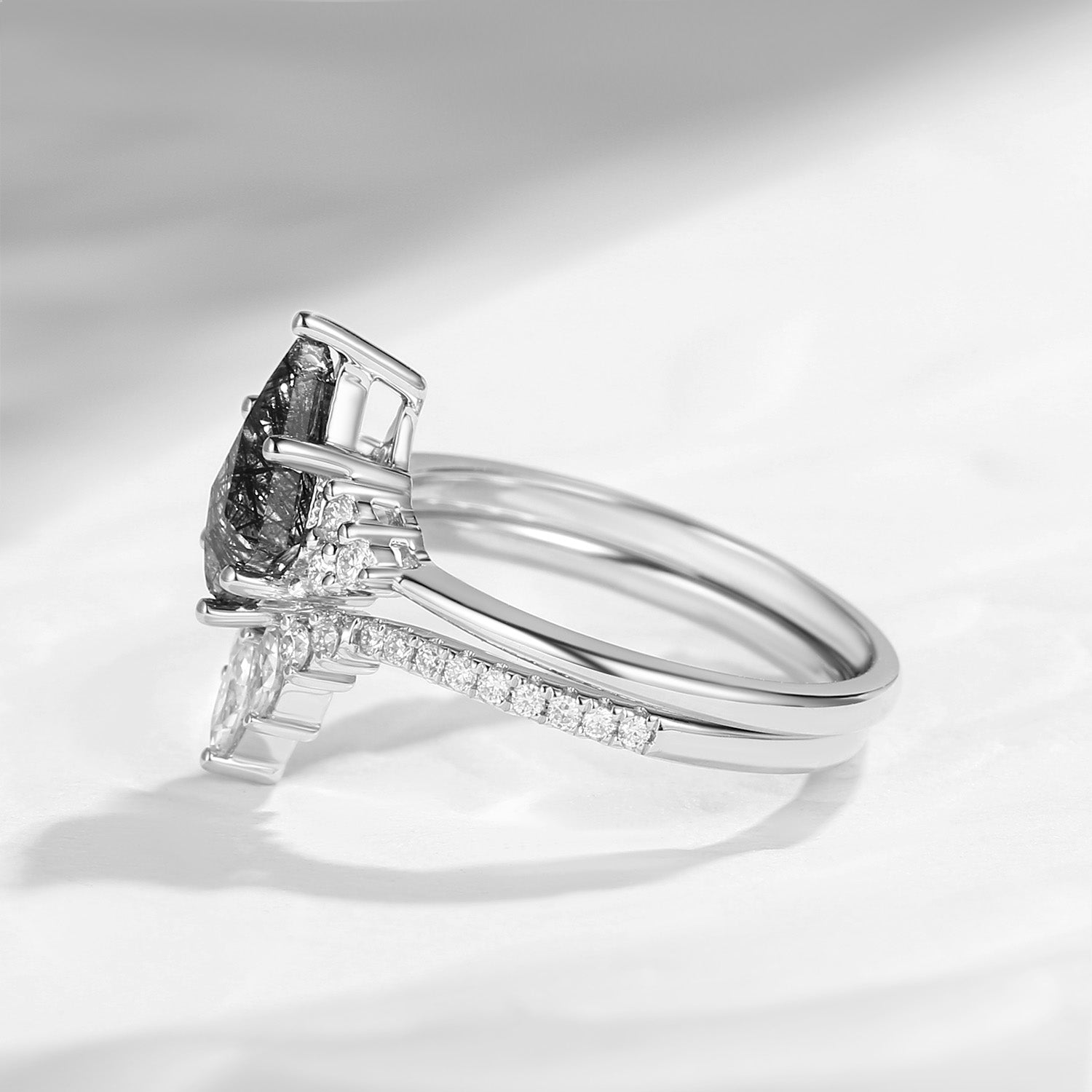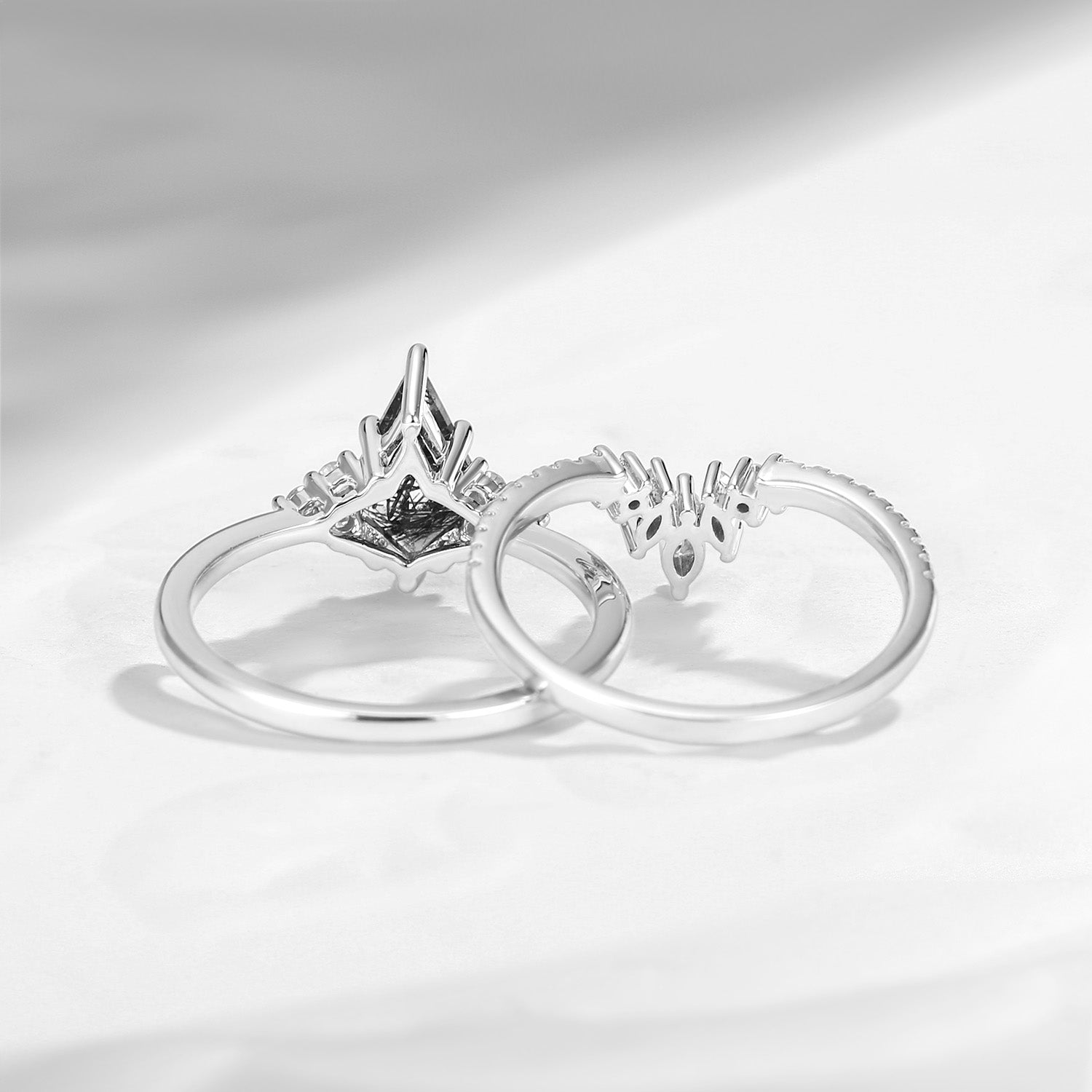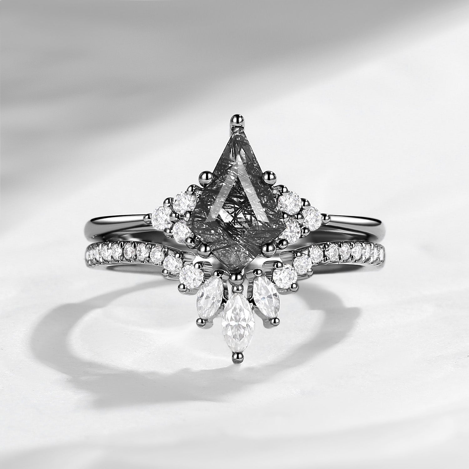 Kite Engagement Rings Set 2pcs Black Rutilated Quartz White Golf Bridal Set Cluster Art Deco Marquise