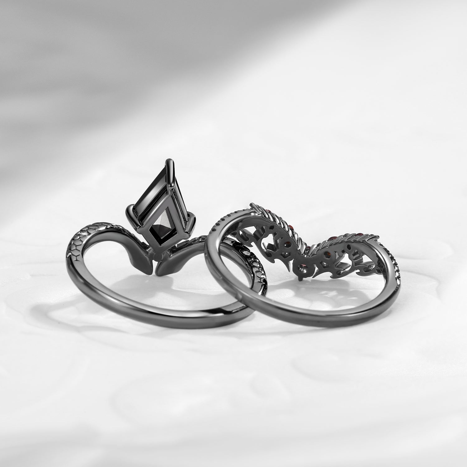 Gothic Kite Cut Black Moissanite Engagement Ring Set 2pcs - Serpent's Embrace