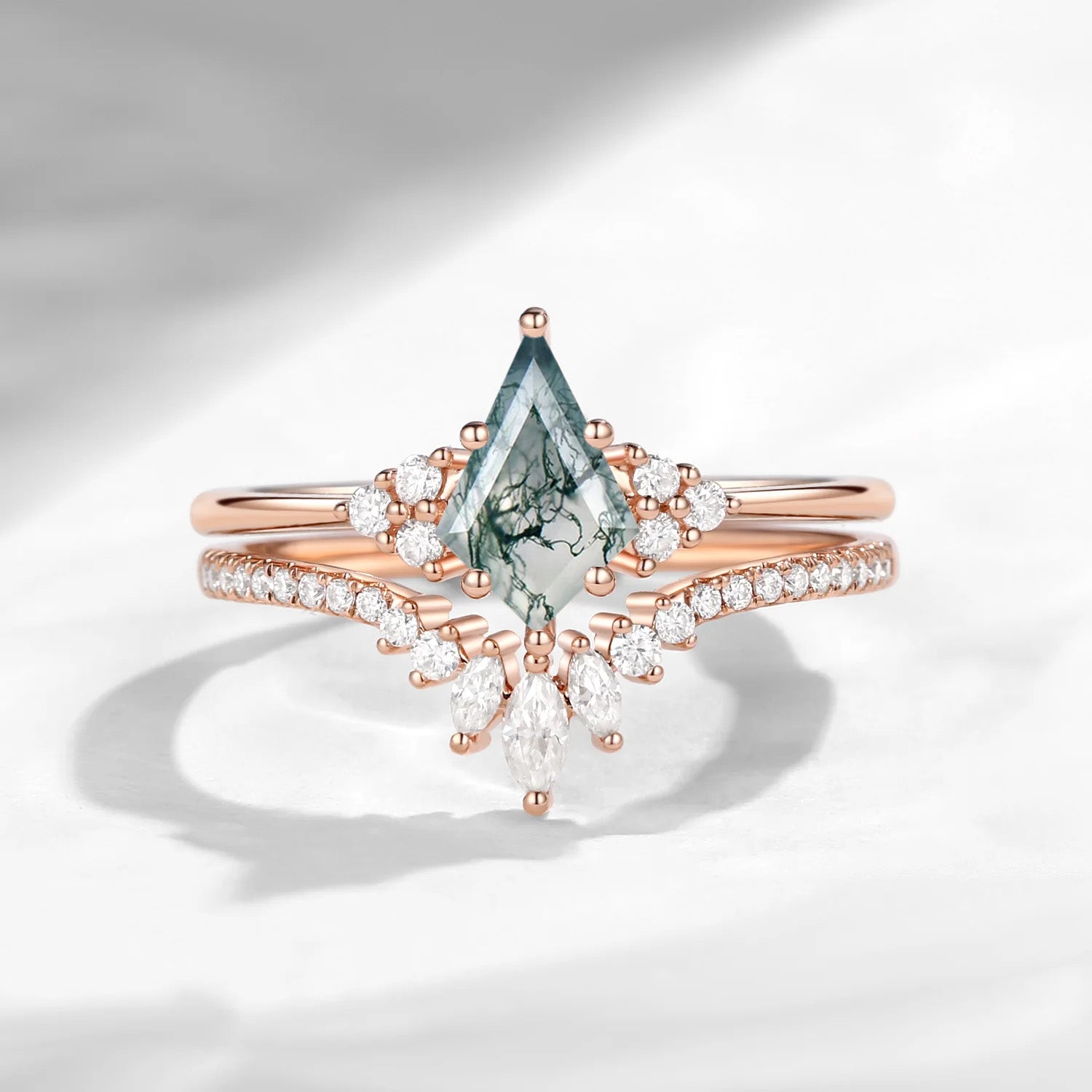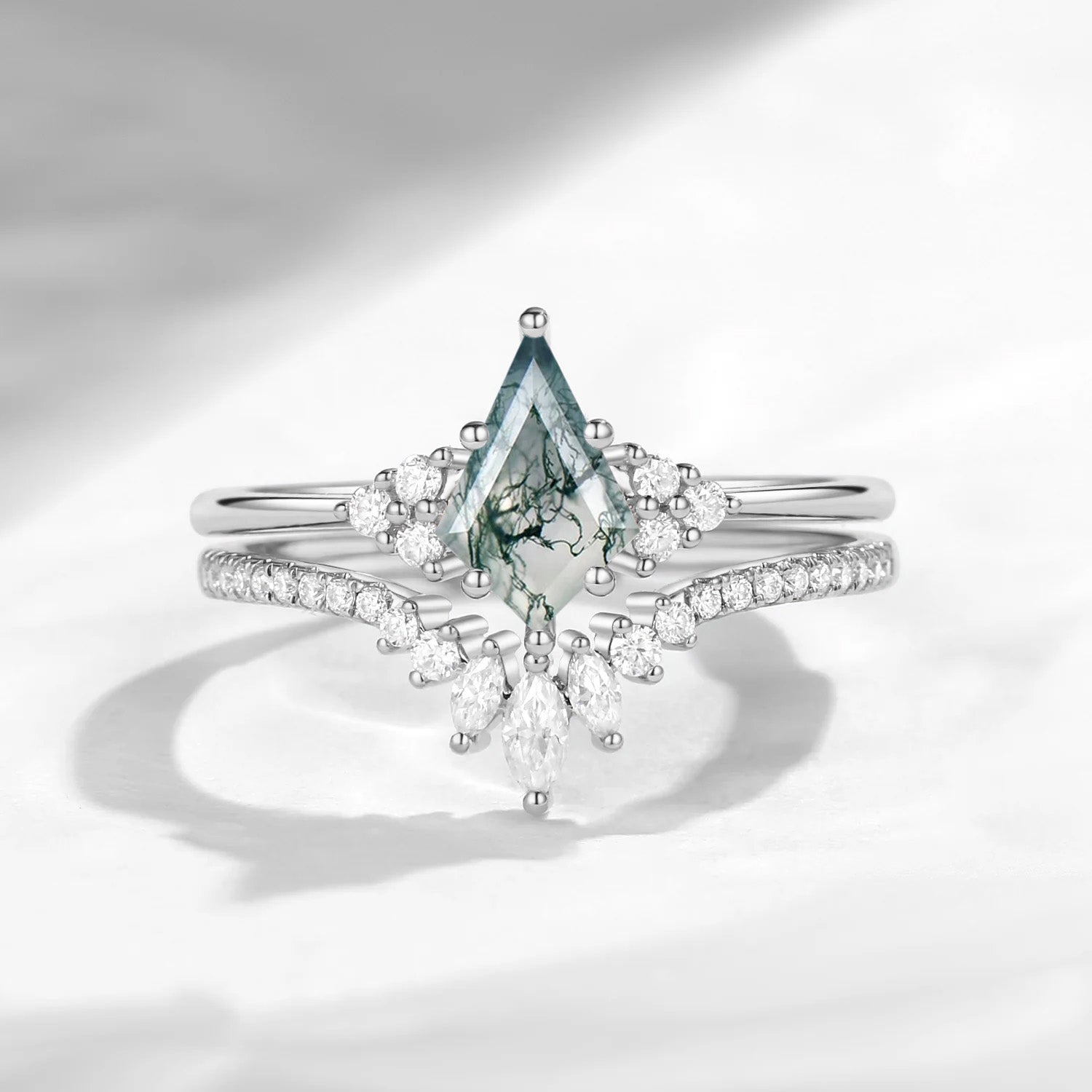 Kite Cut Moss Agate Engagement Ring Set 2pcs - Electra