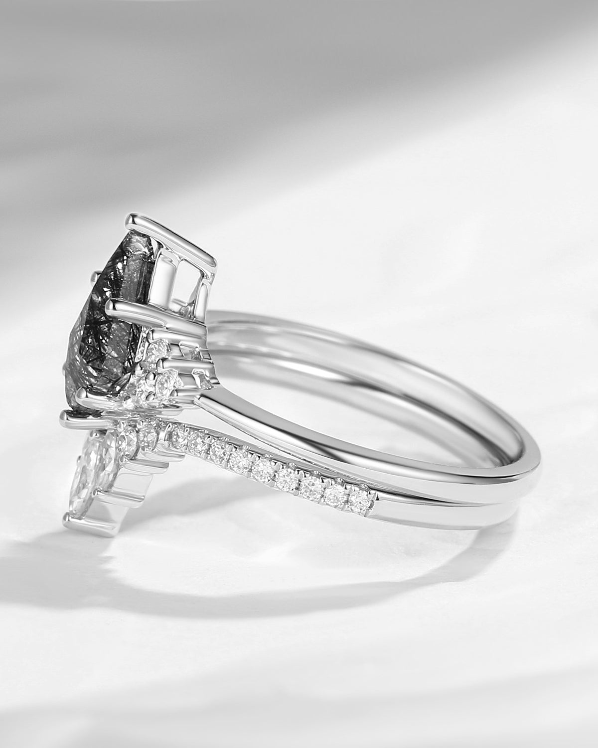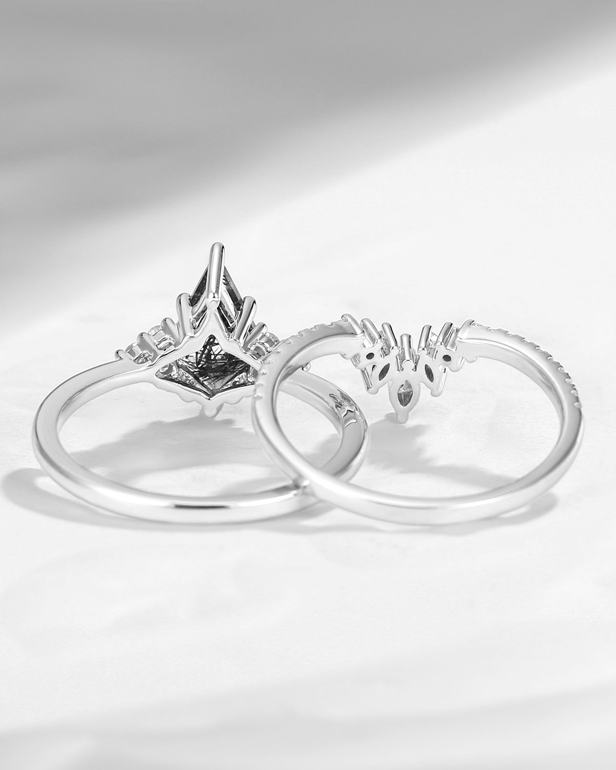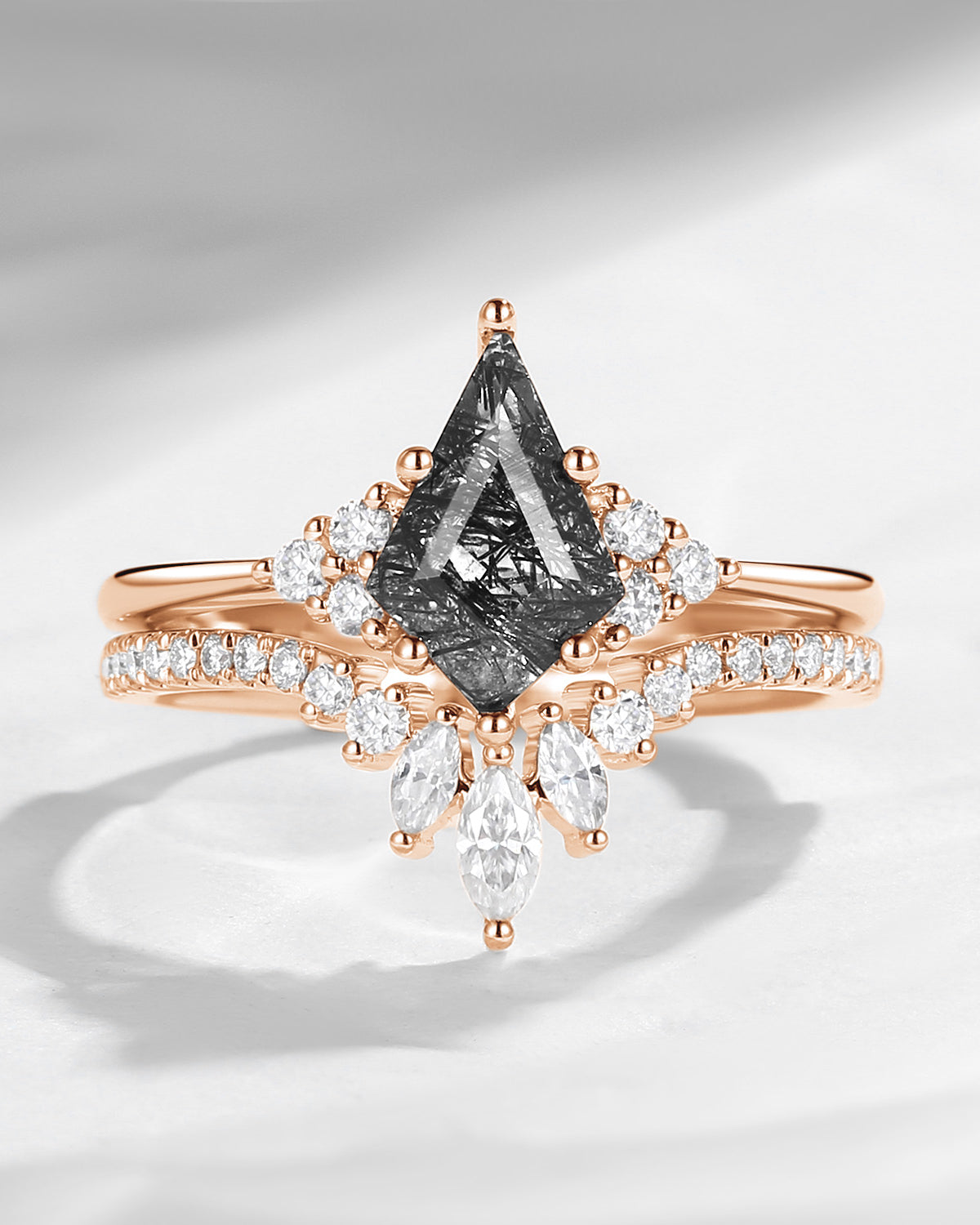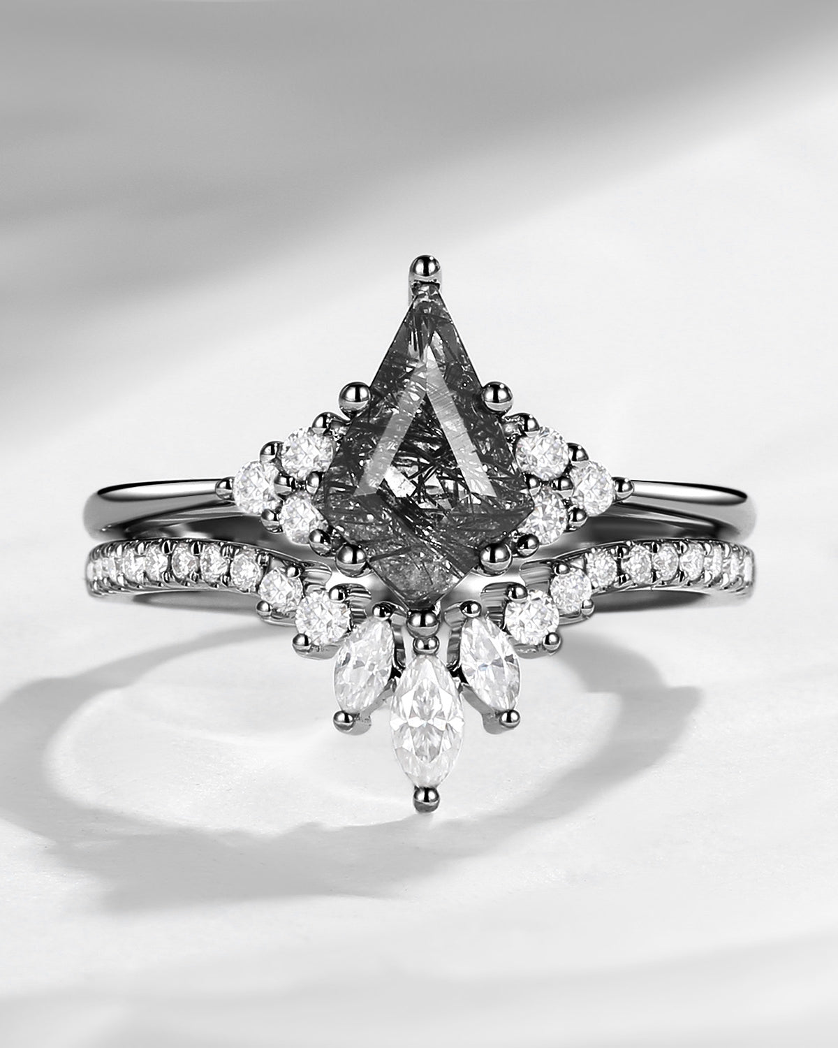 Art Deco Black Rutilated Quartz Kite Cut Engagement Ring Set 2pcs - Electra