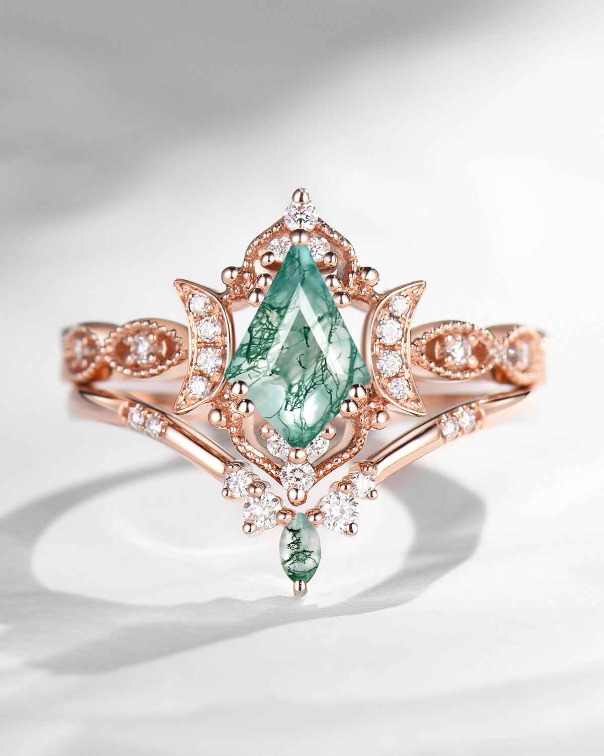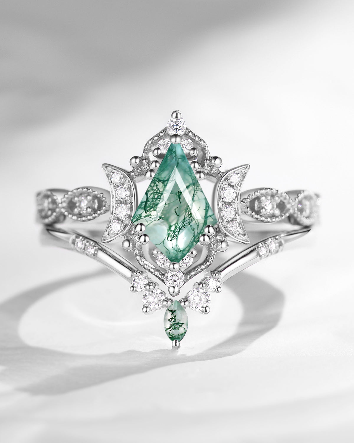 Crescent Moon | Kite Cut Unique Moss Agate Engagement Ring Set 2pcs - Luna
