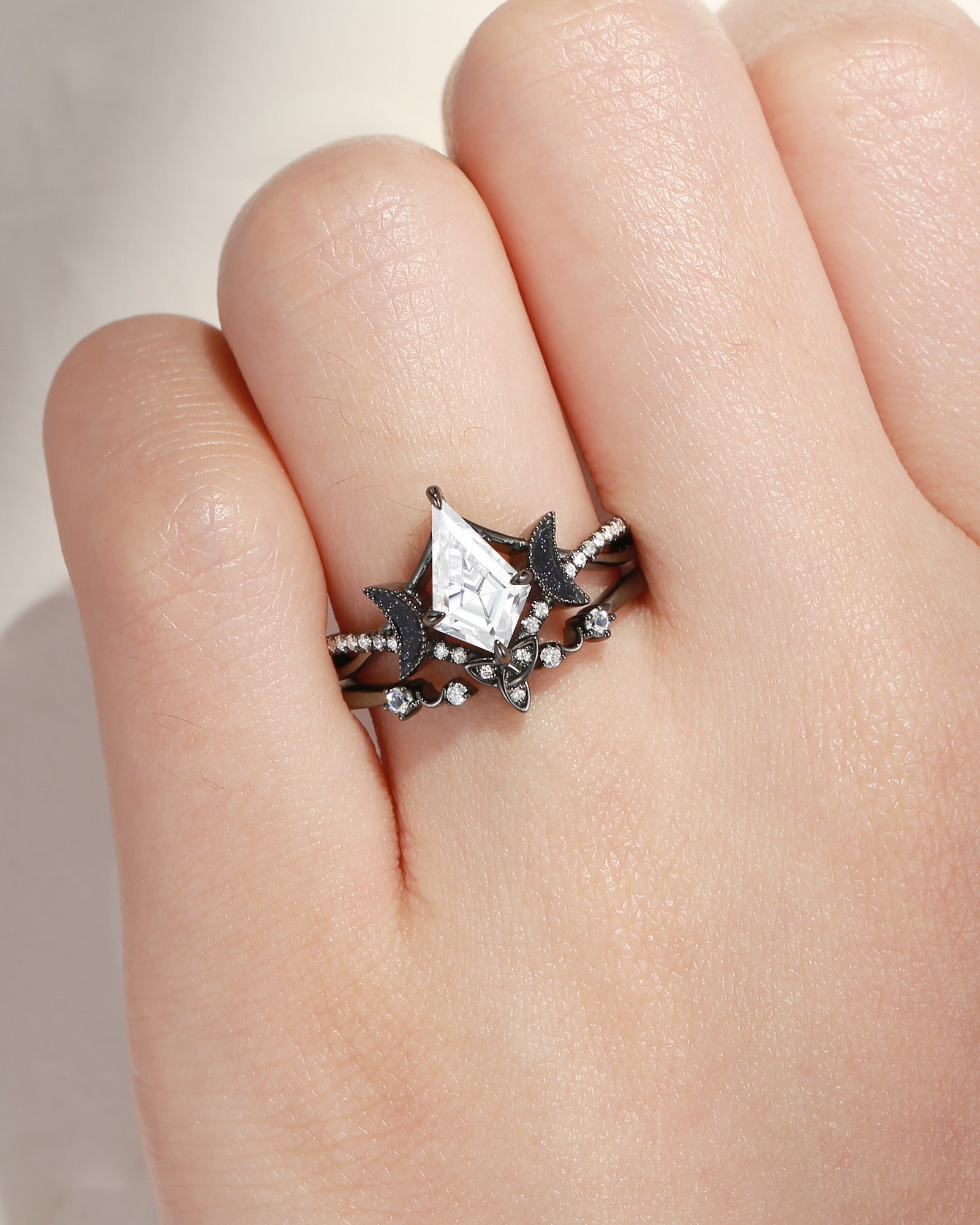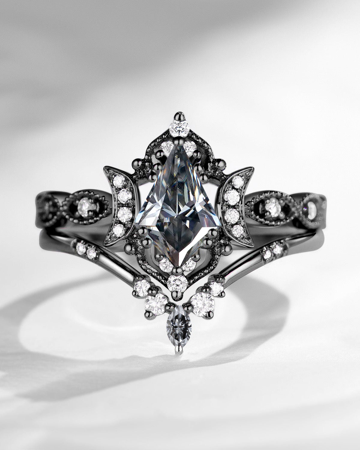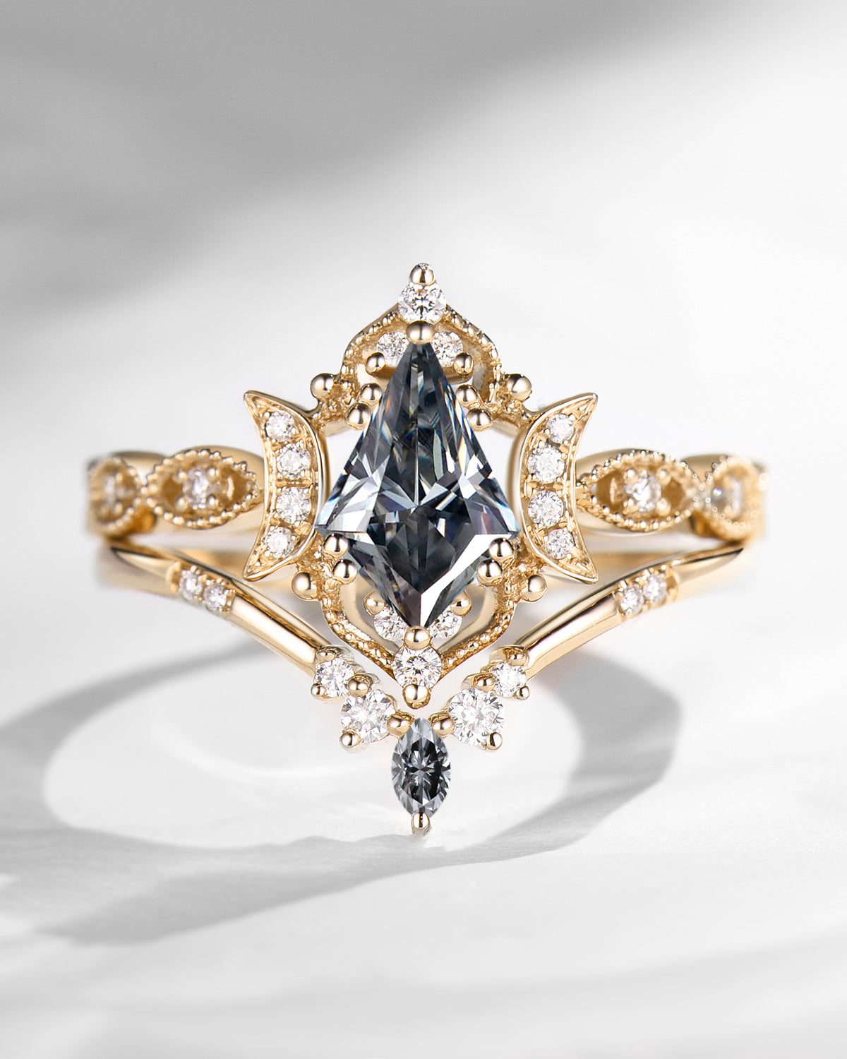 Crescent Moon | Kite Cut Unique Grey Moissanite Engagement Ring Set 2pcs - Luna