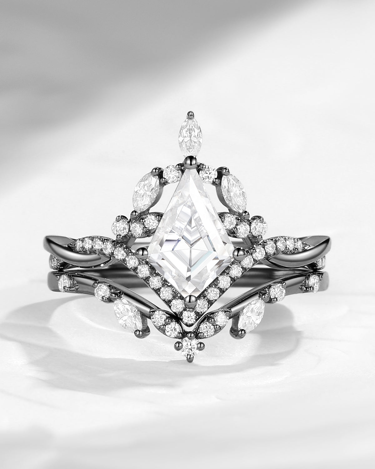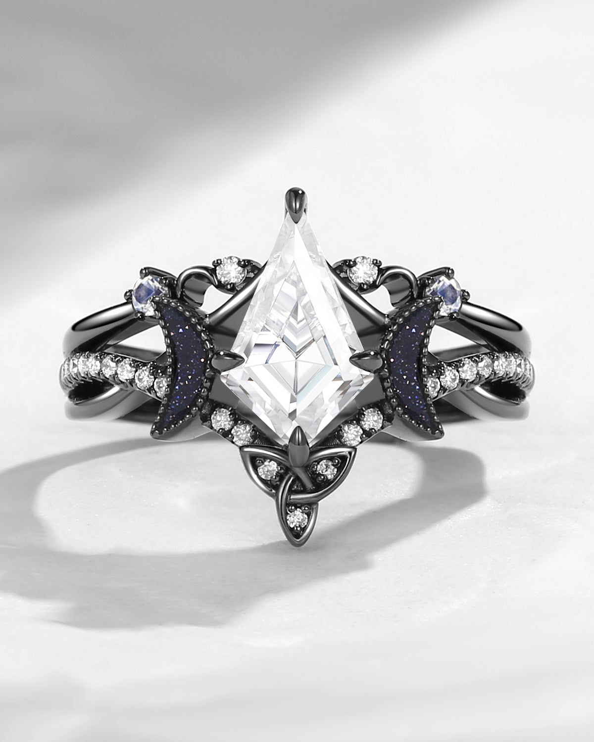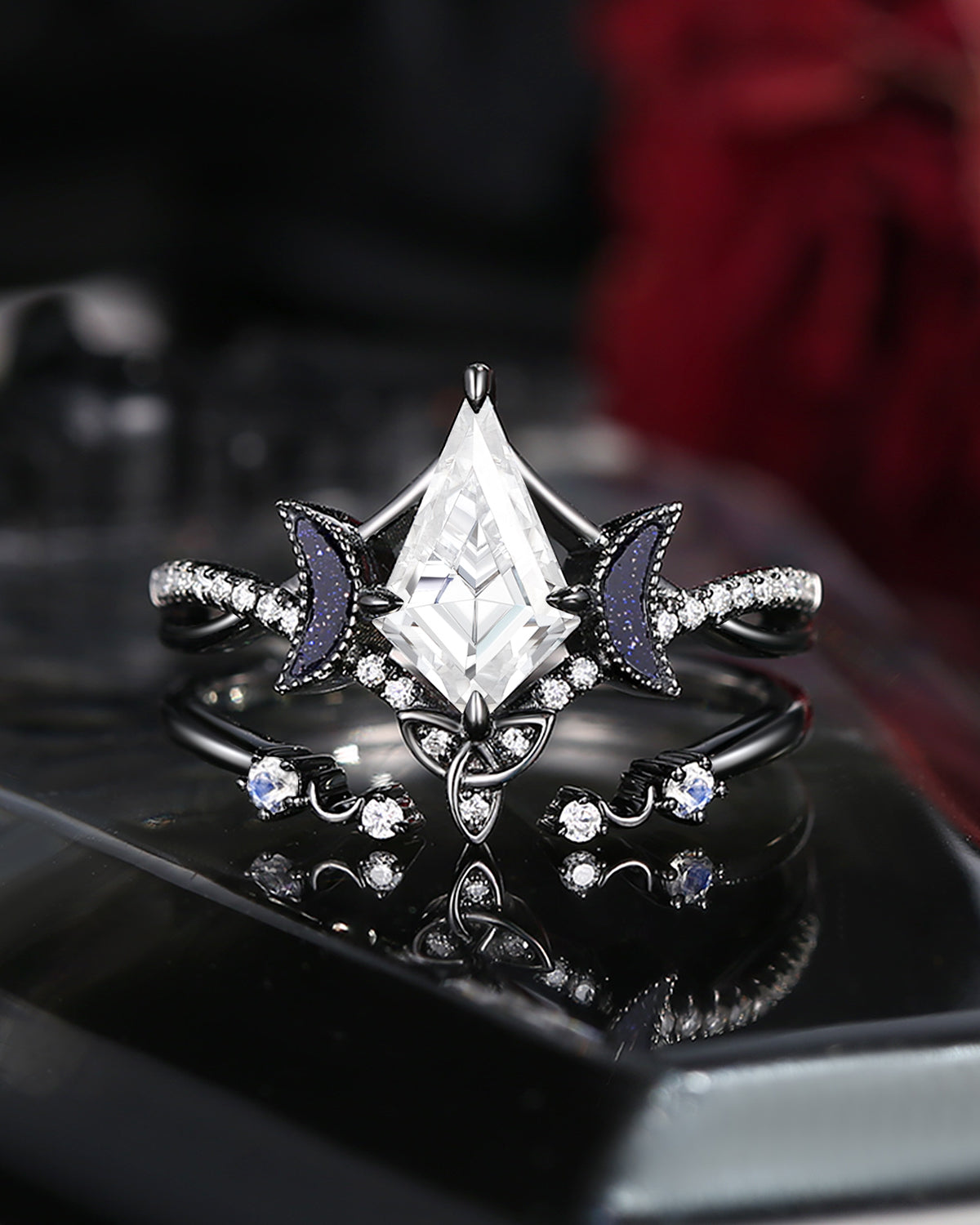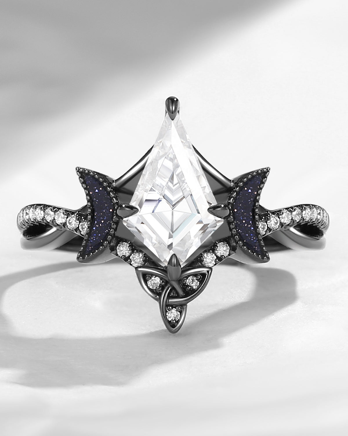 Crescent Moon | Kite Cut Unique Grey Moissanite Engagement Ring Set 2pcs - Luna