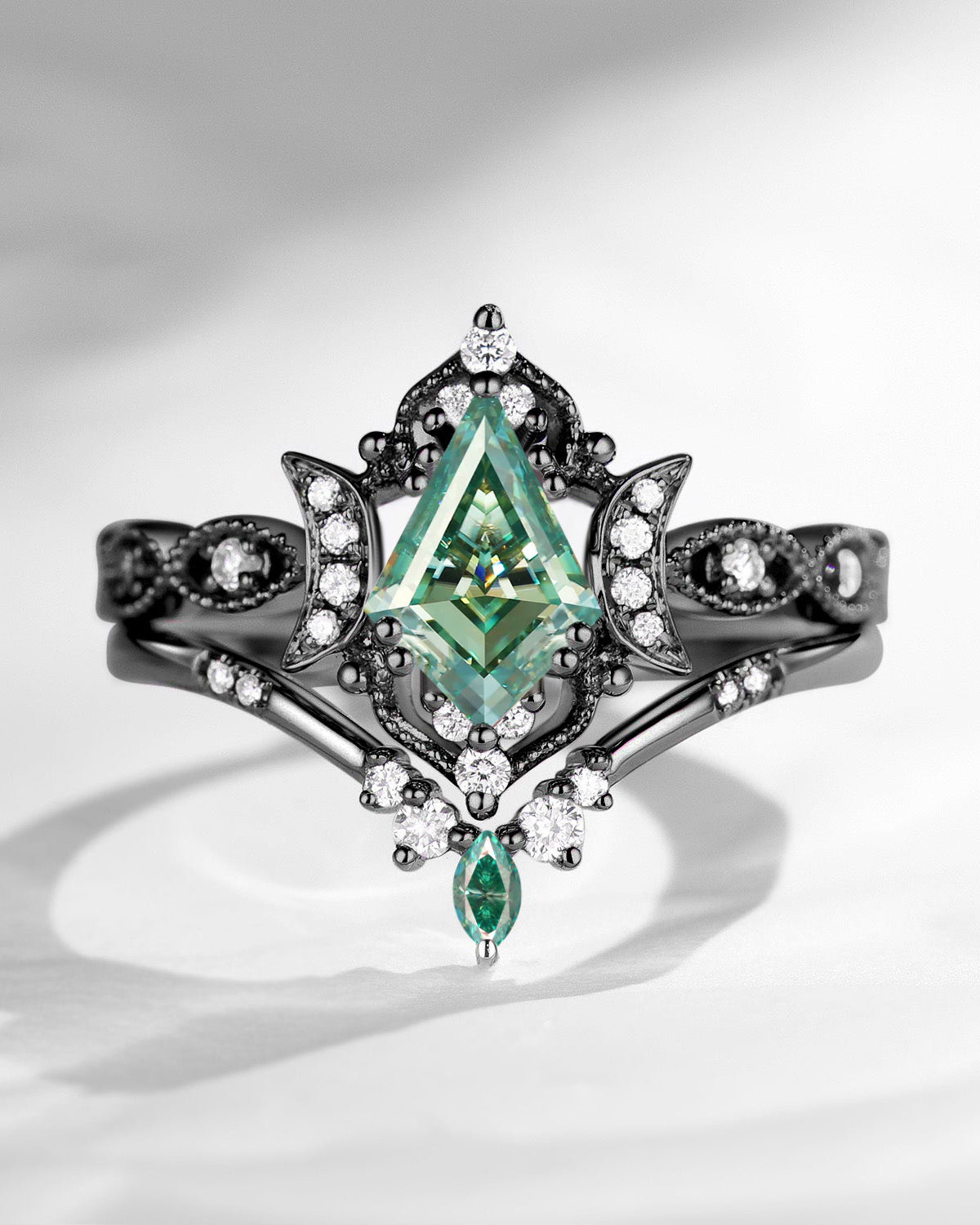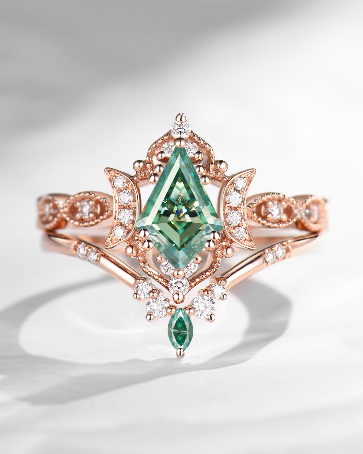 Crescent Moon | Kite Cut Unique Green Moissanite Engagement Ring Set 2pcs - Luna