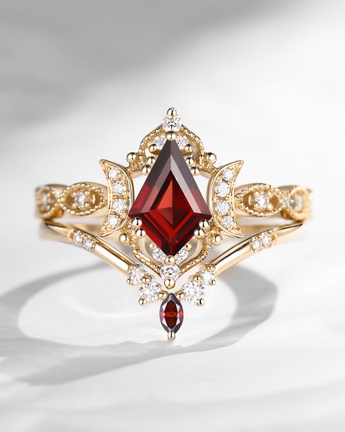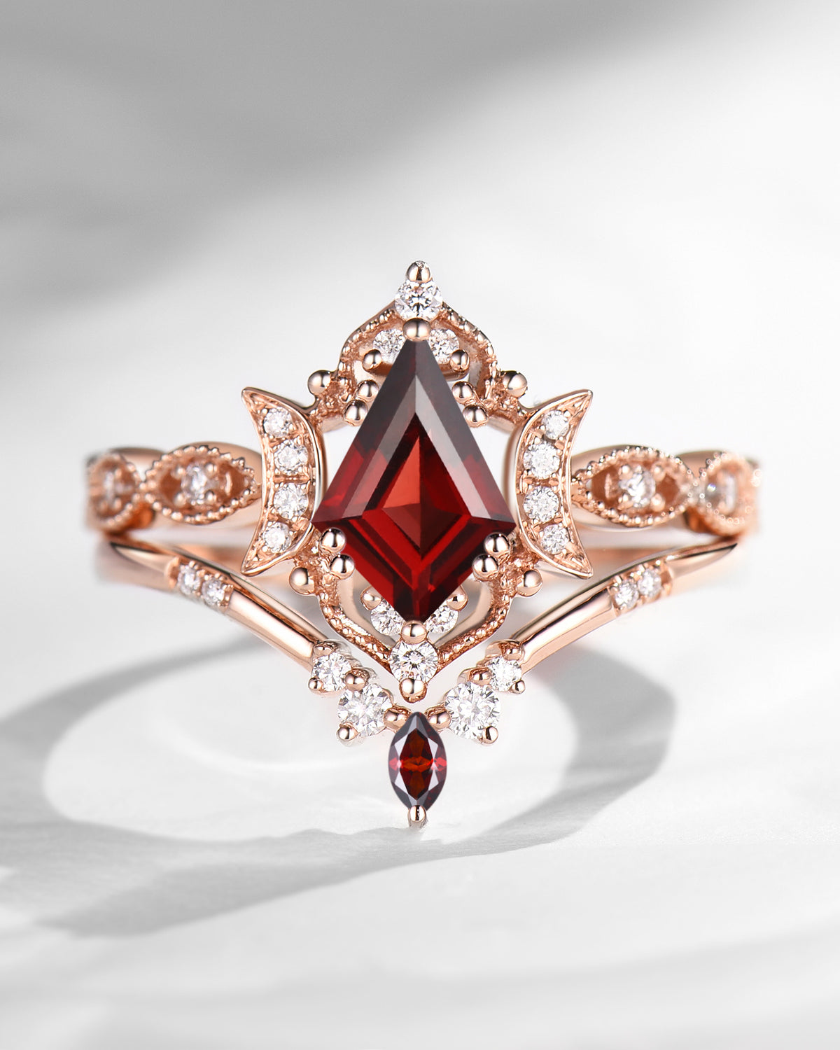 Crescent Moon | Kite Cut Unique Garnet Engagement Ring Set 2pcs - Luna