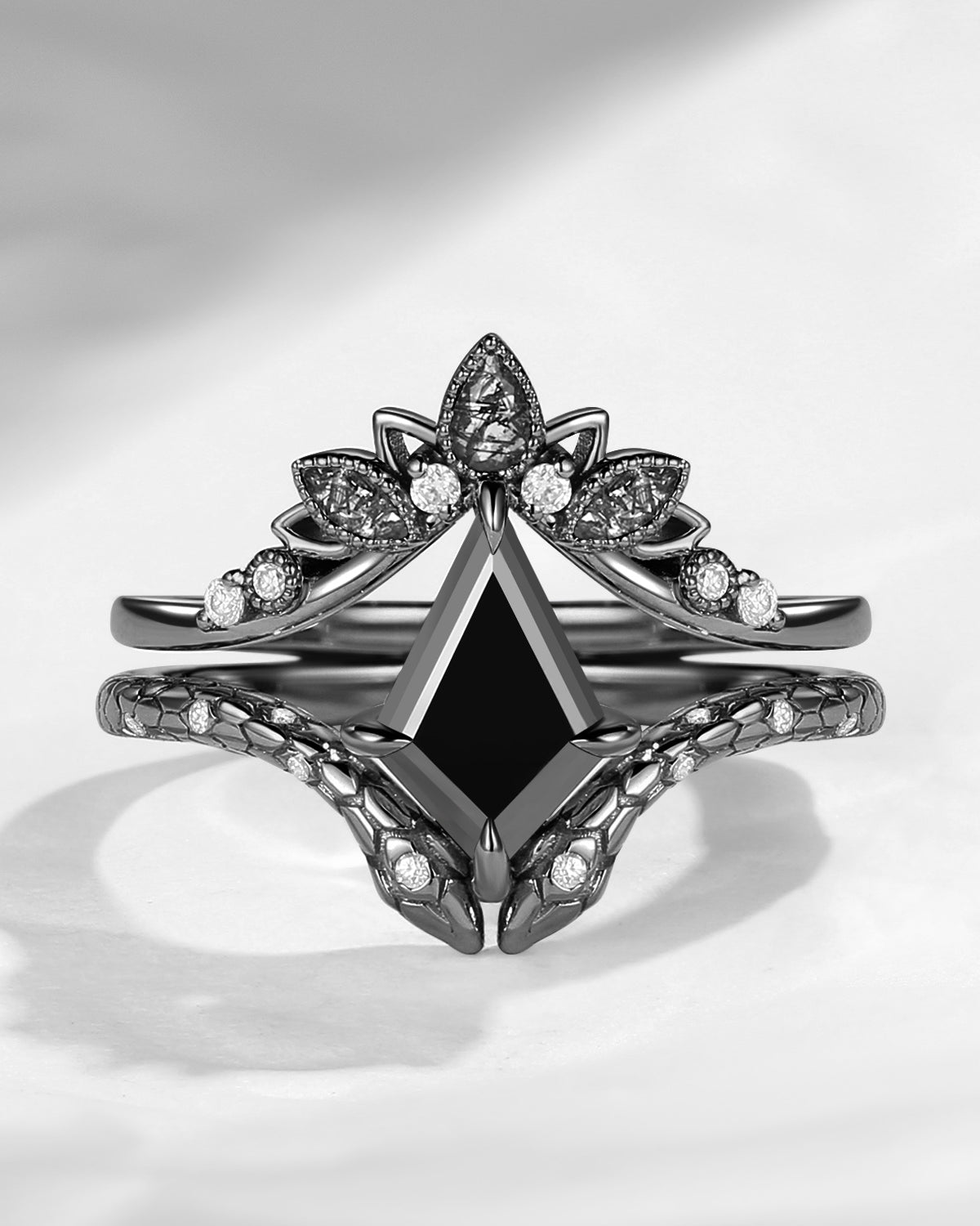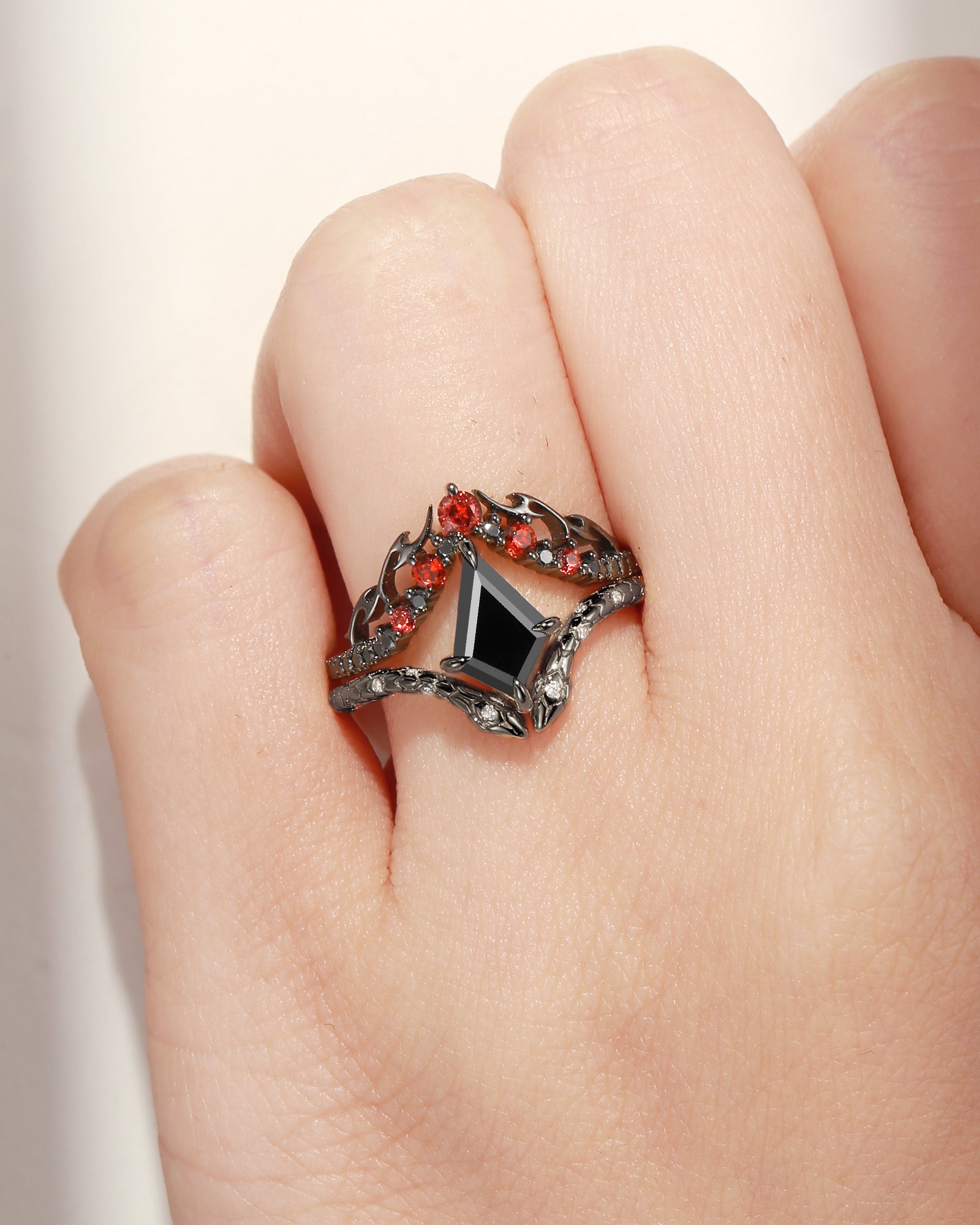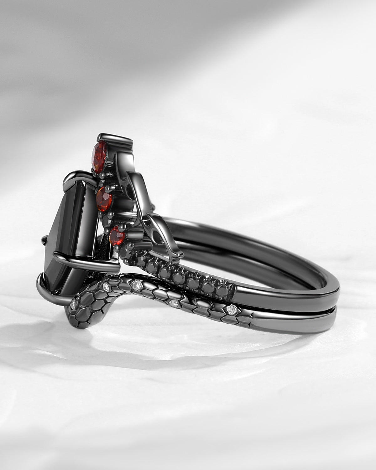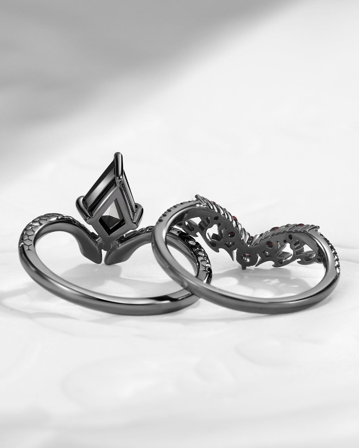 Gothic Kite Cut Black Moissanite Engagement Ring Set 2pcs - Serpent's Embrace