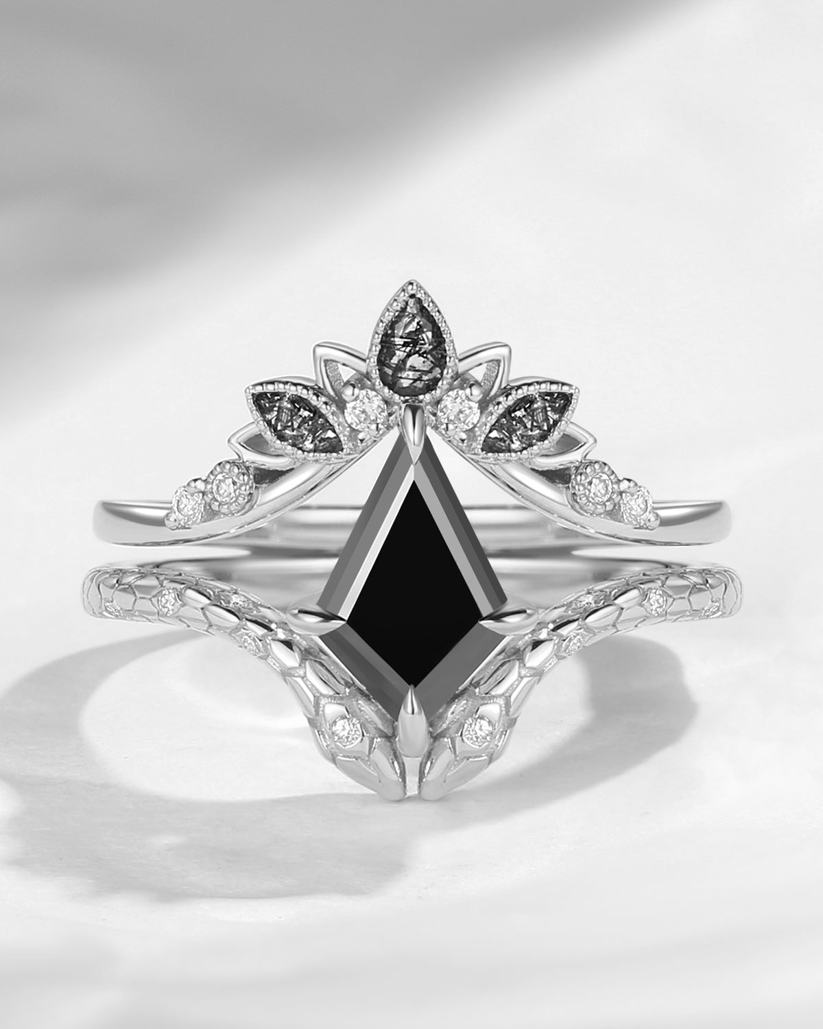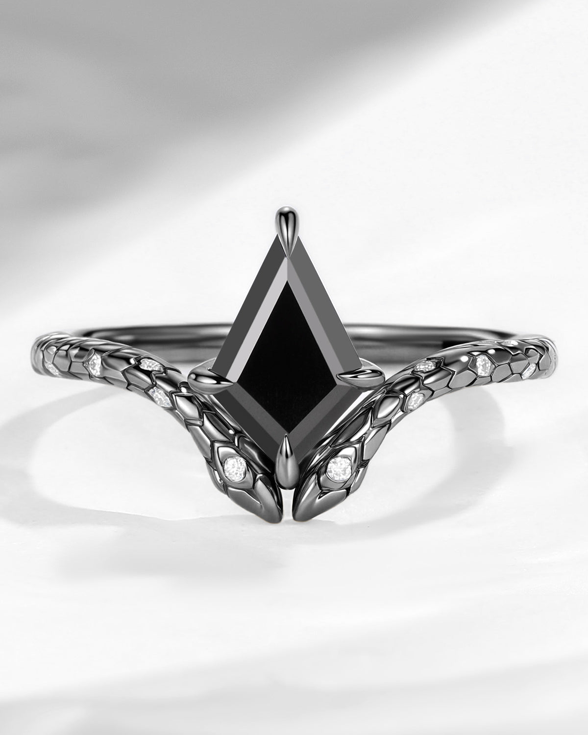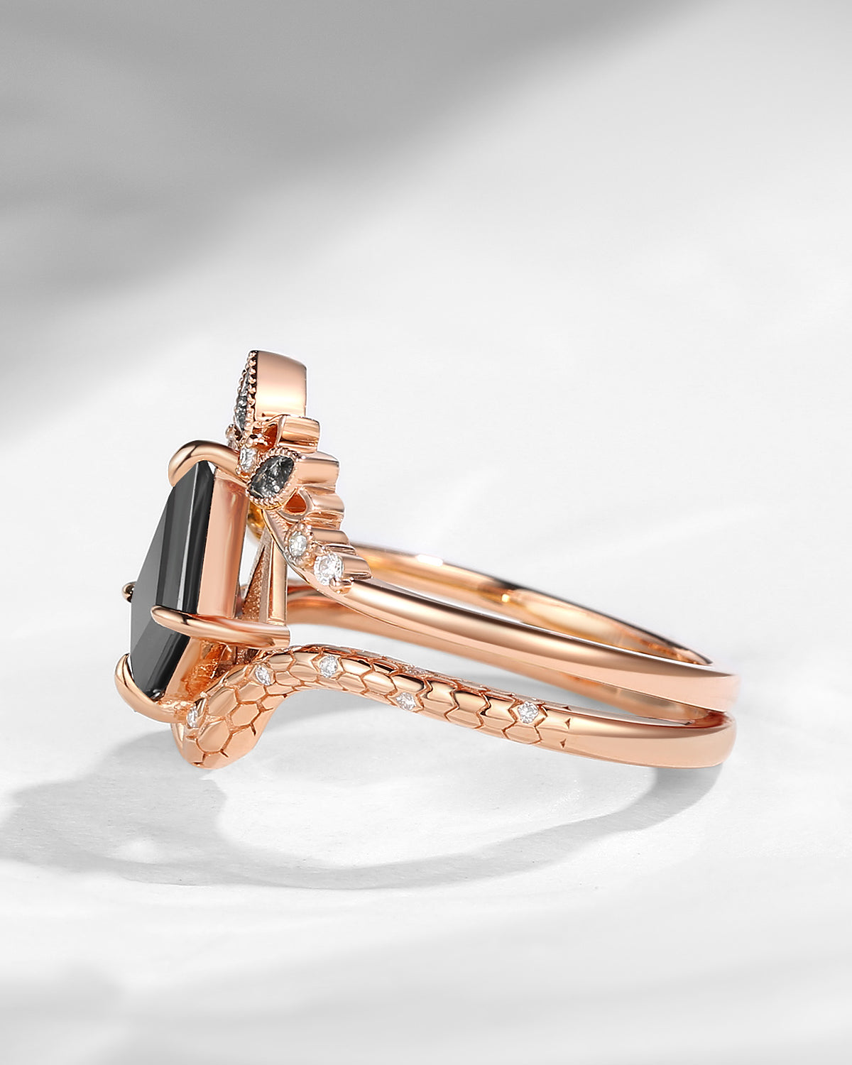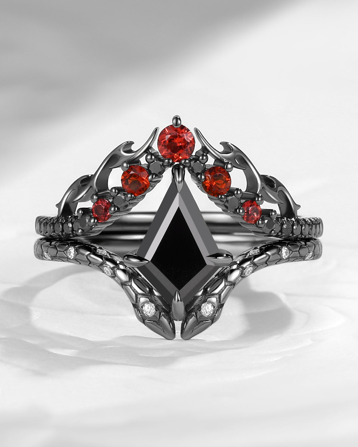 Gothic Kite Cut Black Moissanite Engagement Ring Set 2pcs - Serpent's Embrace