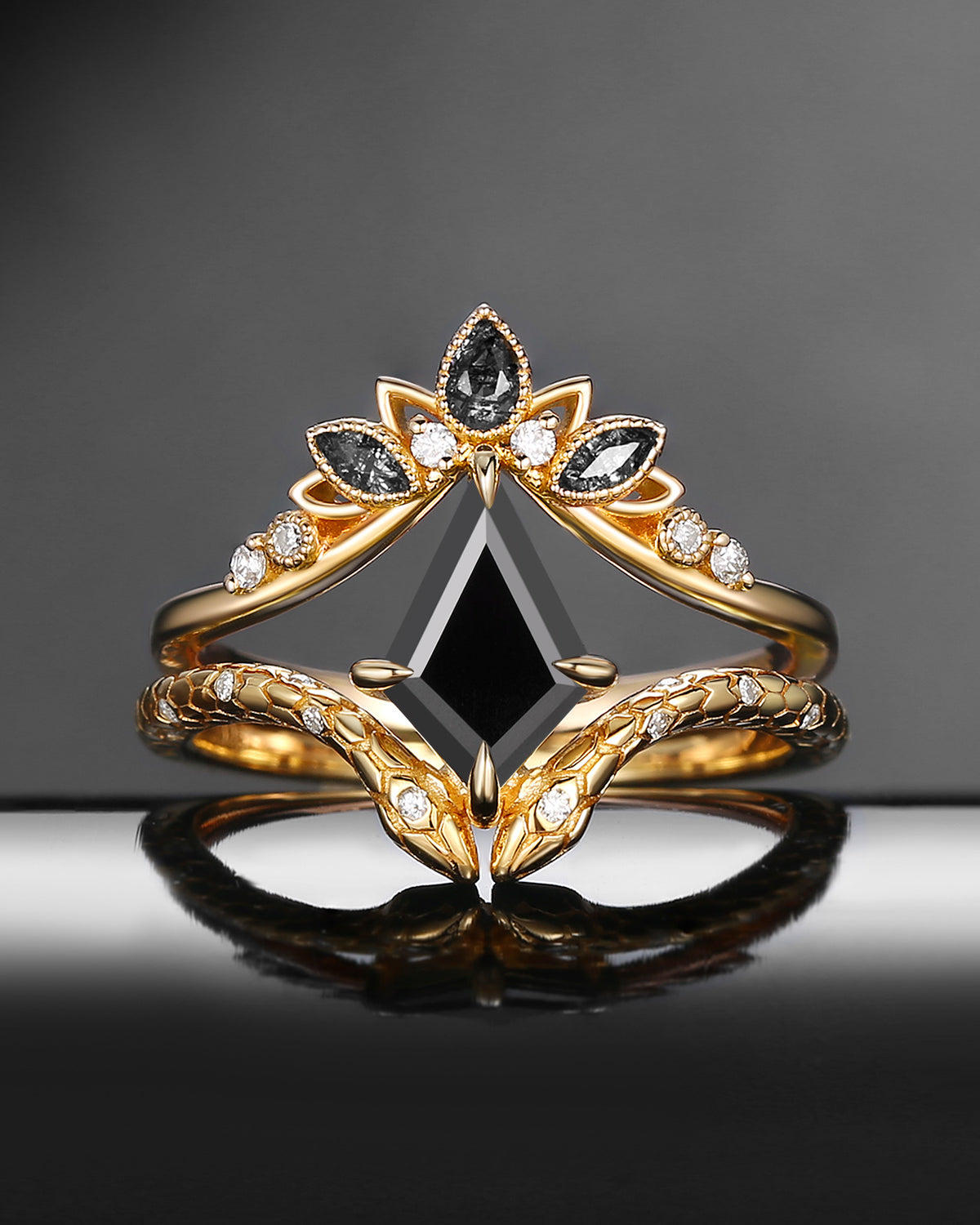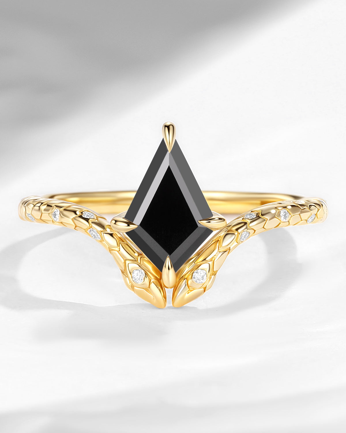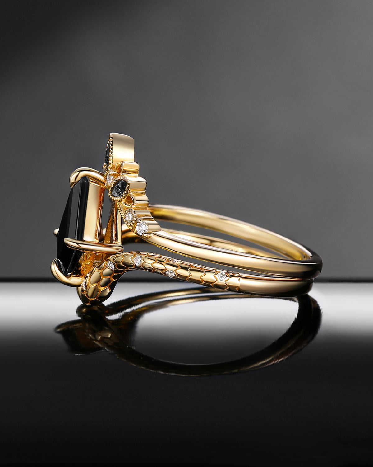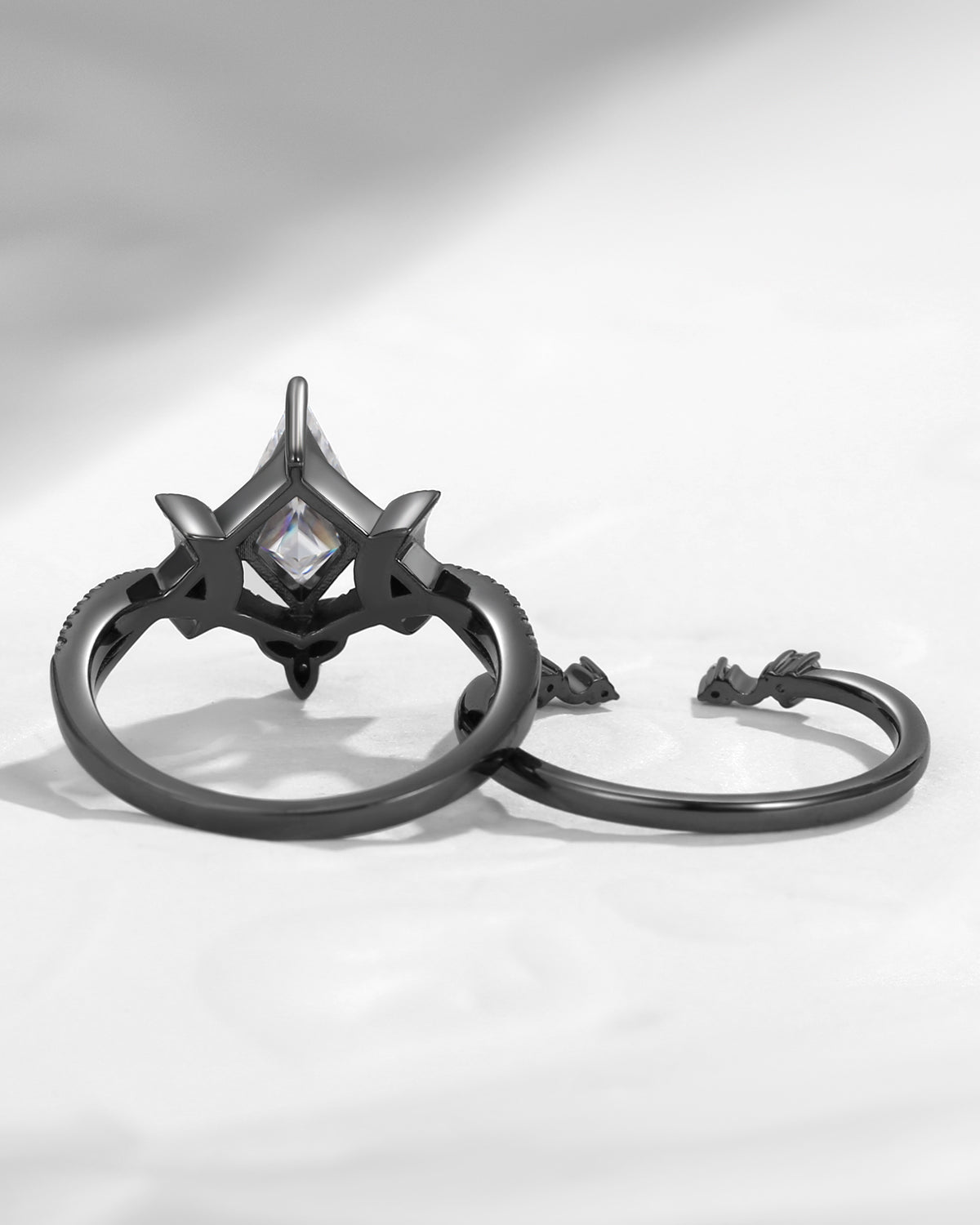 Gothic Kite Cut Black Moissanite Engagement Ring Set 2pcs - Serpent's Embrace