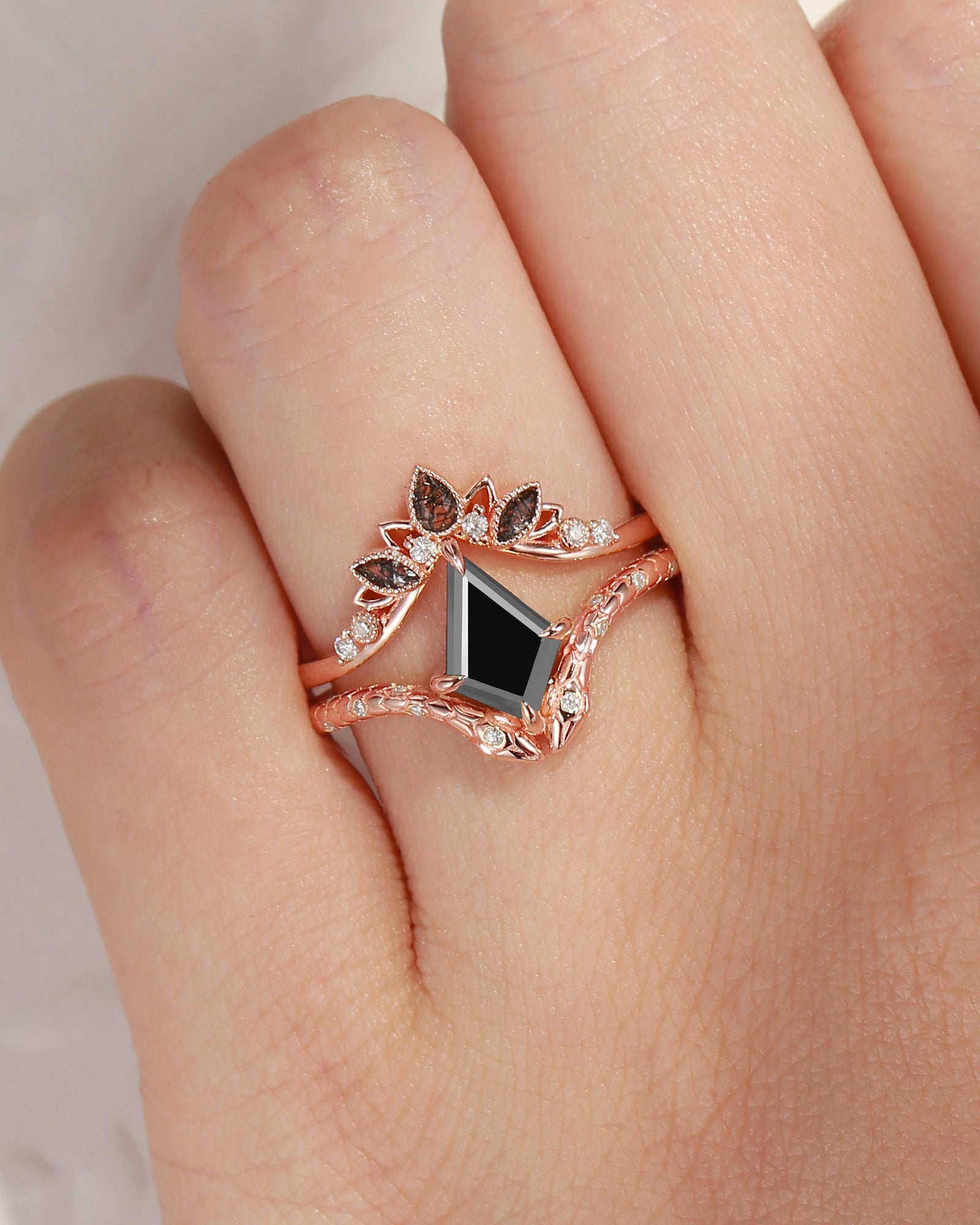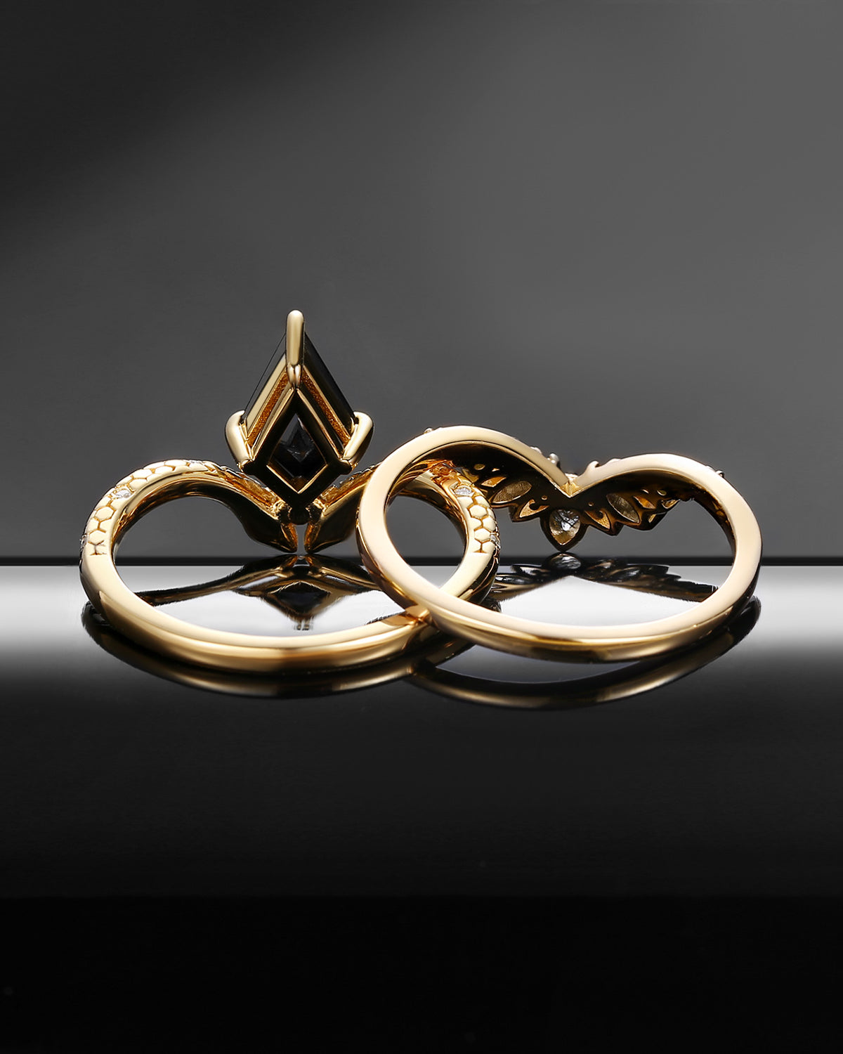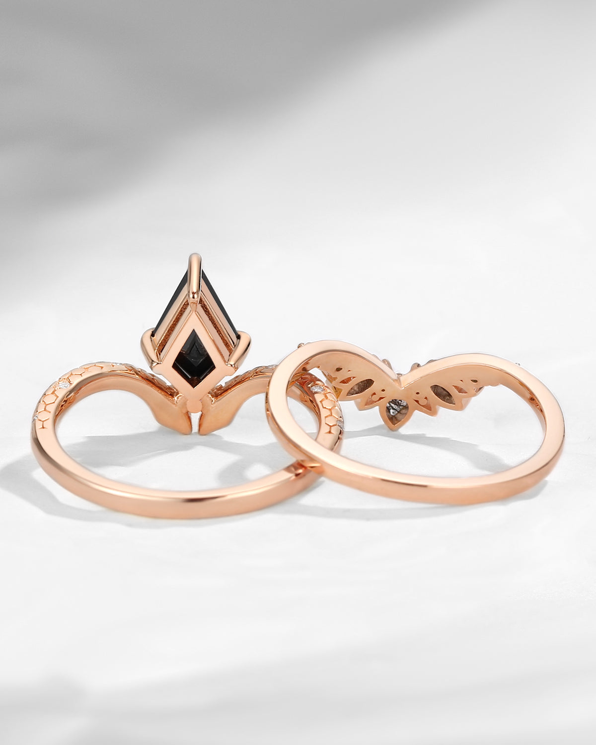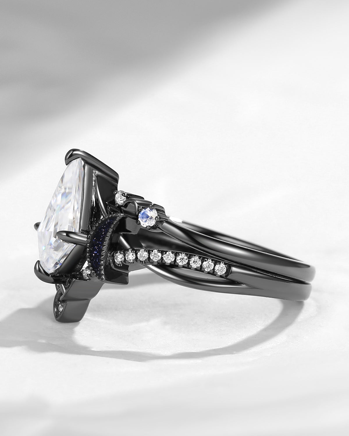 Gothic Kite Cut Black Moissanite Engagement Ring Set 2pcs - Serpent's Embrace