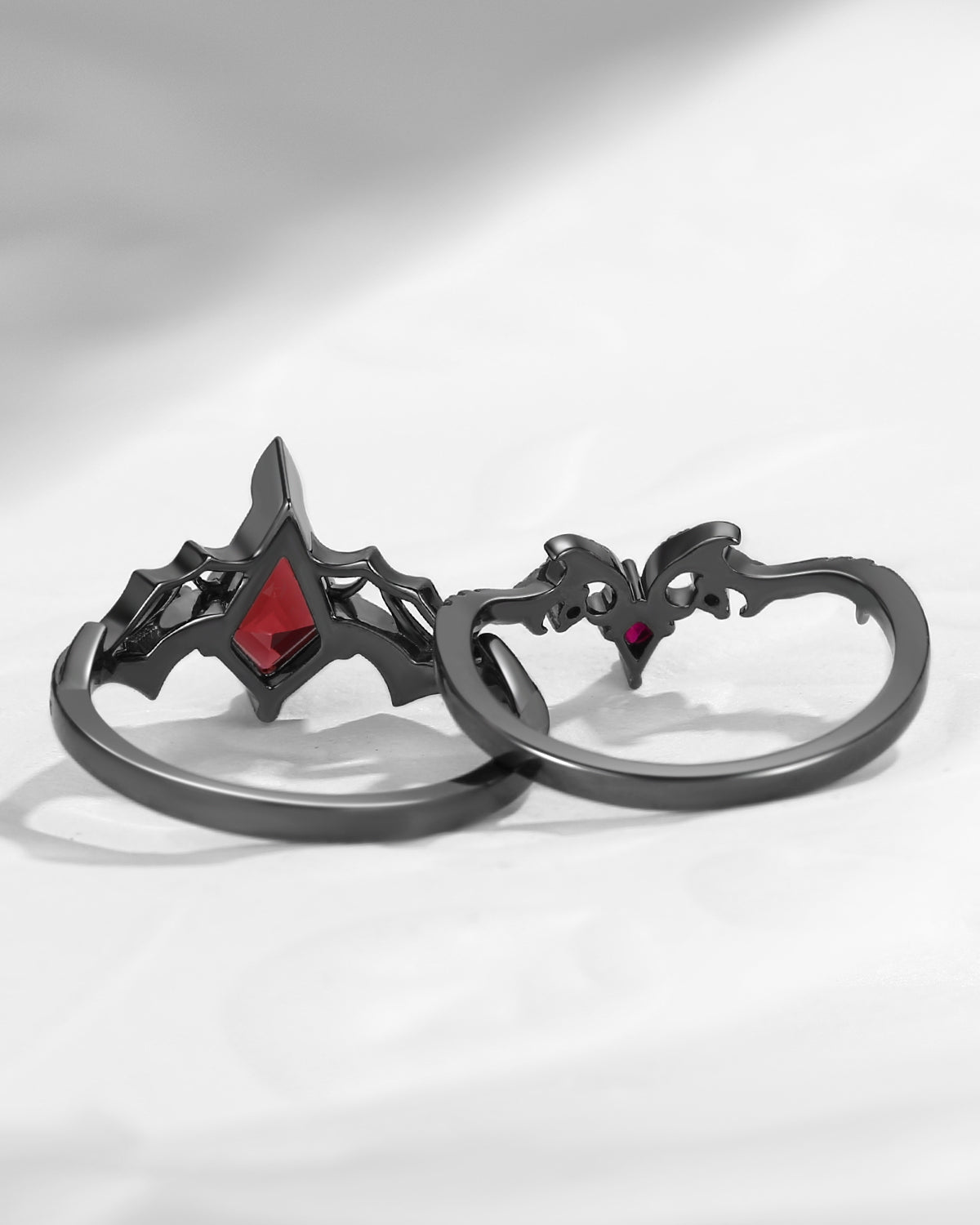 Kite Cut Garnet Bat Wing Inspired Thorns Engagement Ring Set 2pcs - Bat Ring