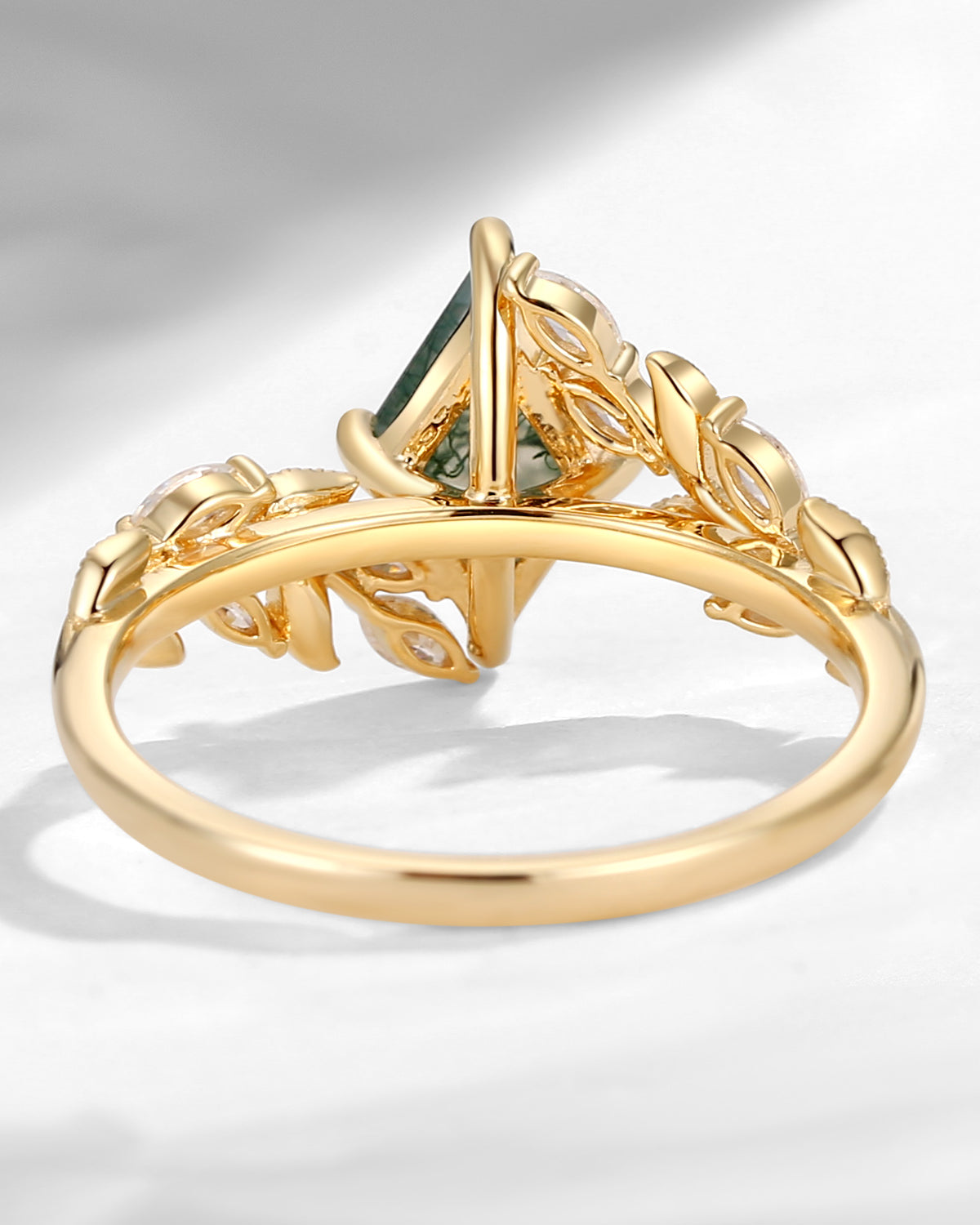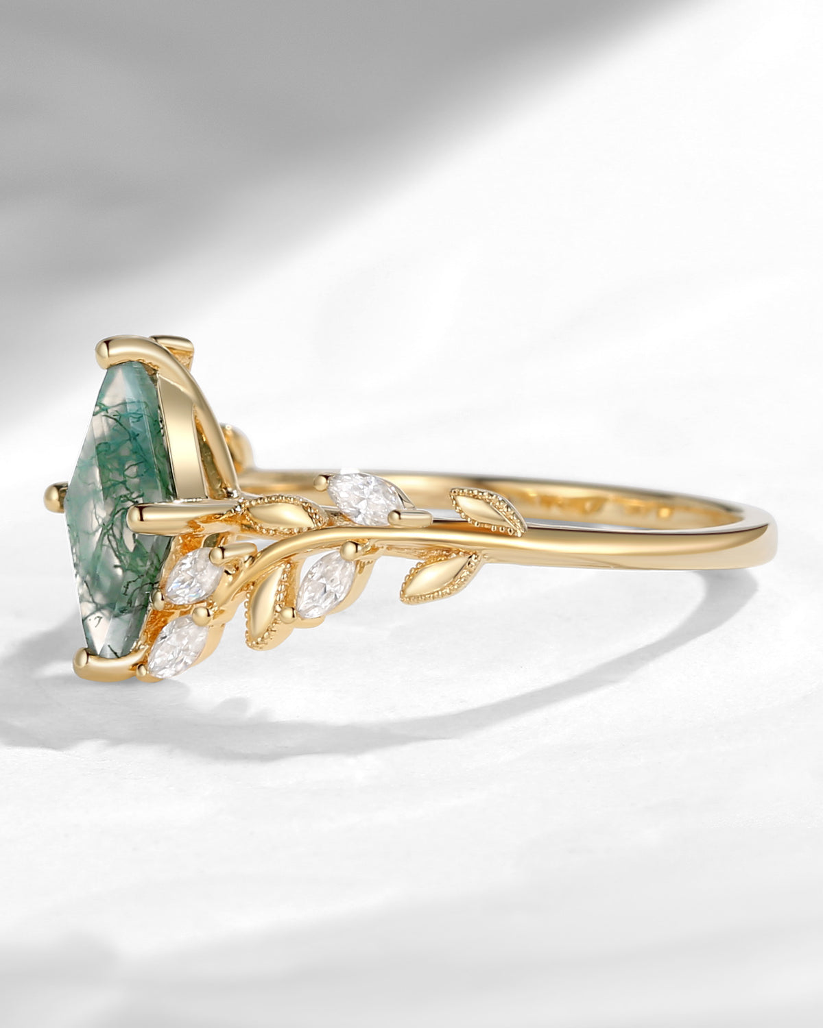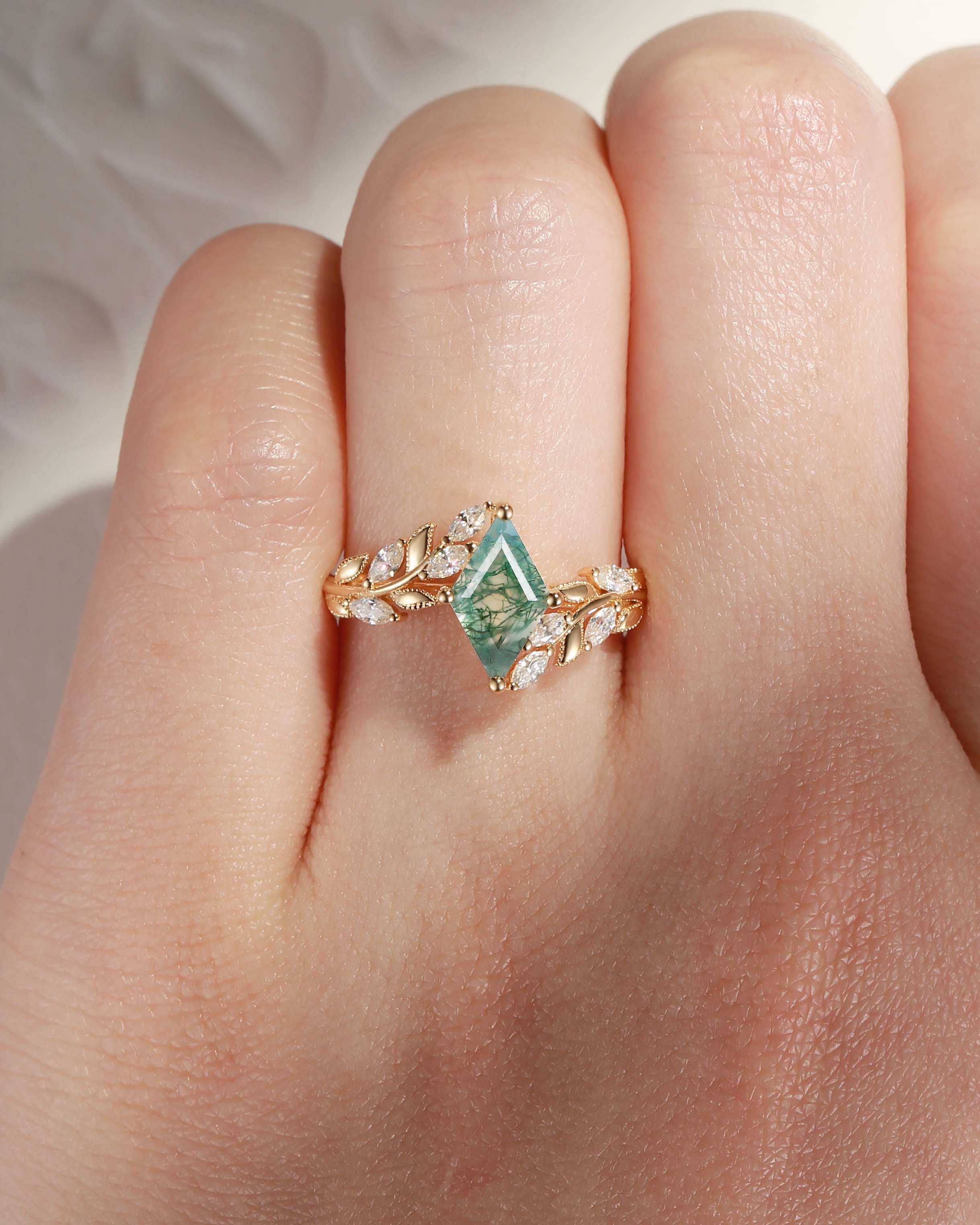 Unique Nature Inspired Kite Cut Moss Agate Leaf Engagement Ring