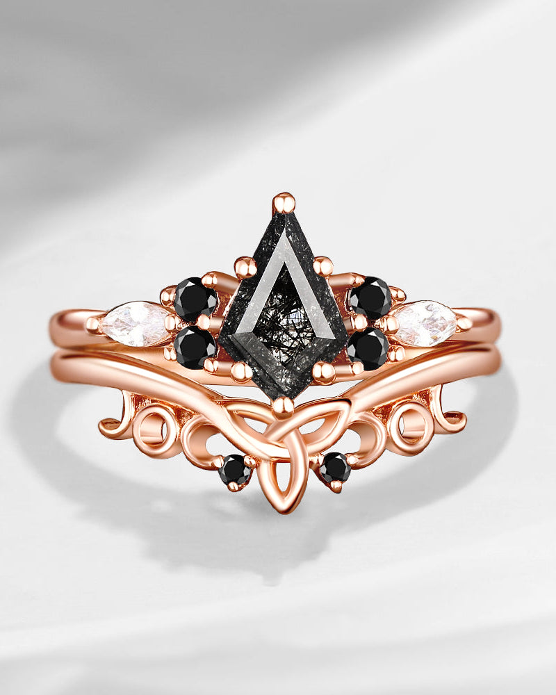 Kite Cut Black Rutilated Quartz Celtic Engagement Ring Set 2pcs