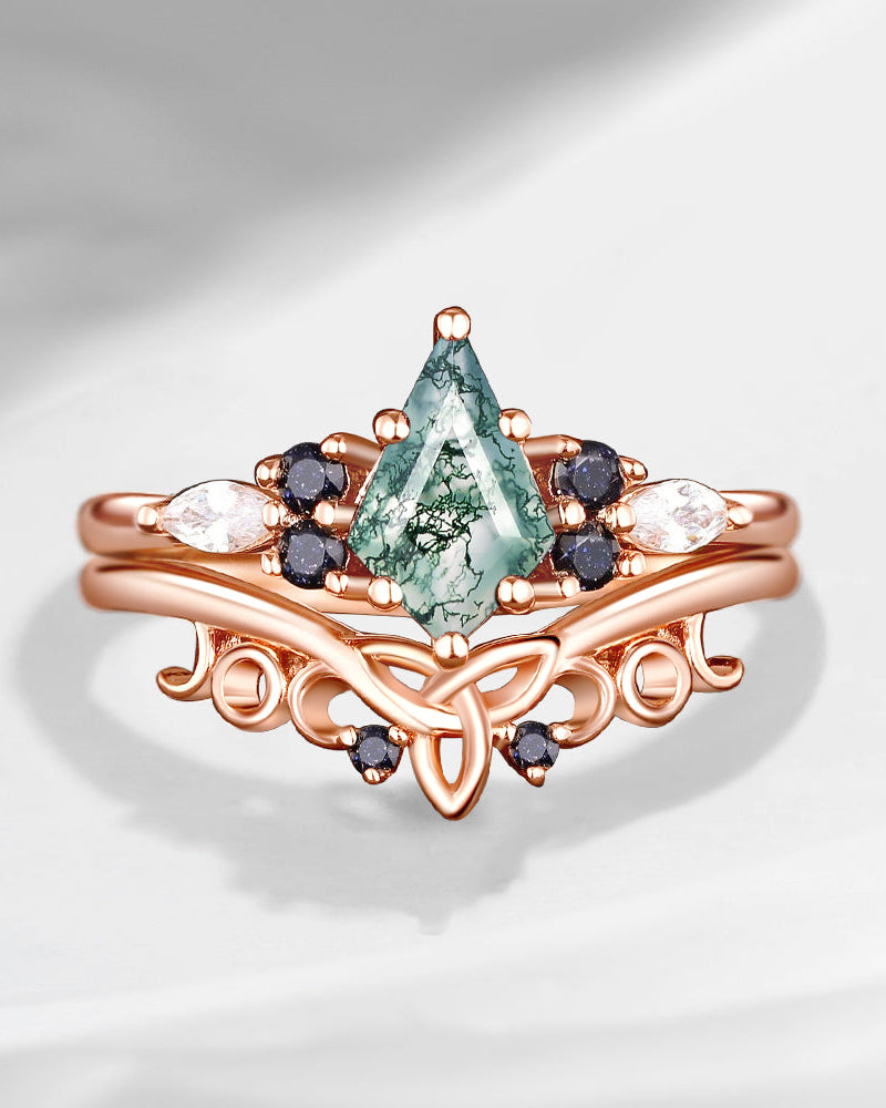 Kite Cut Moss Agate Celtic Engagement Ring Set 2pcs