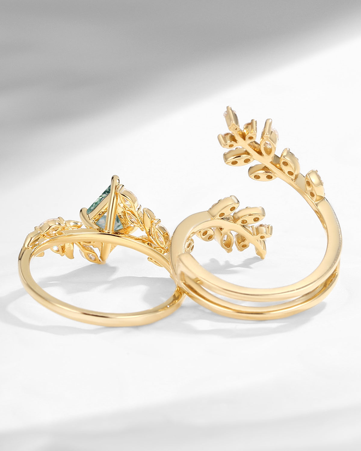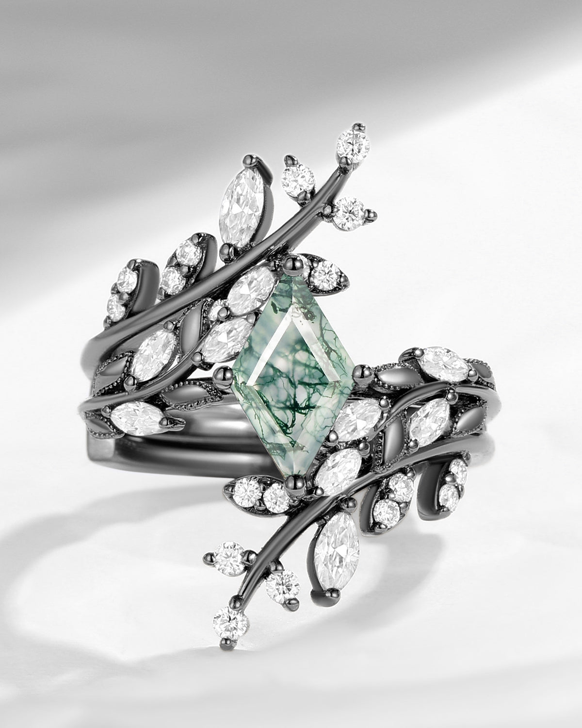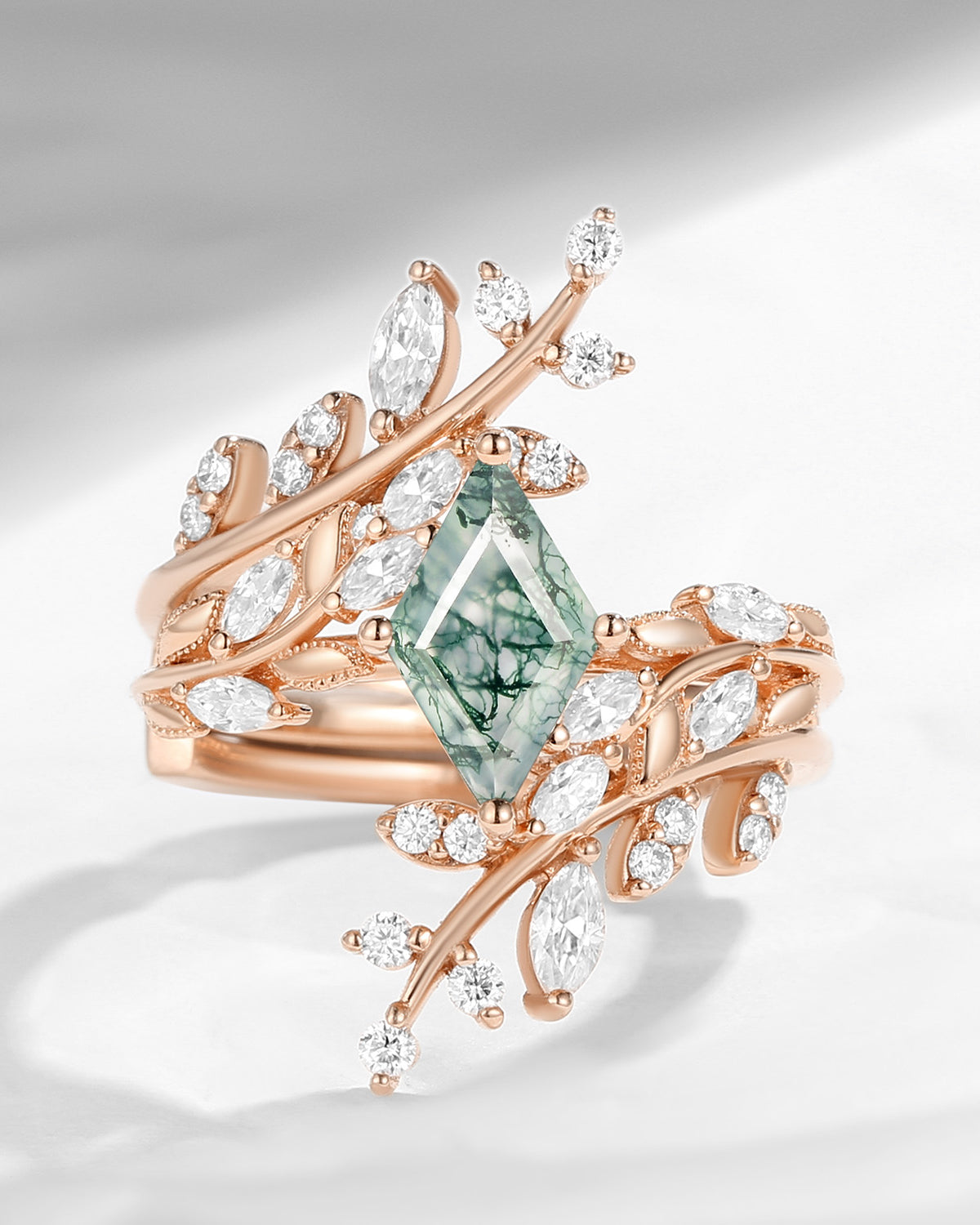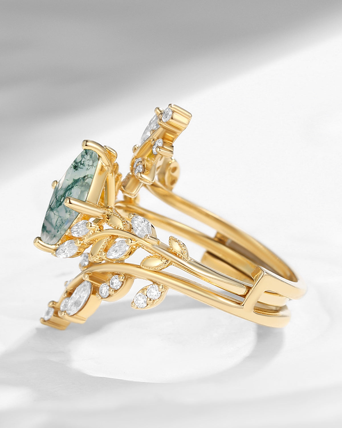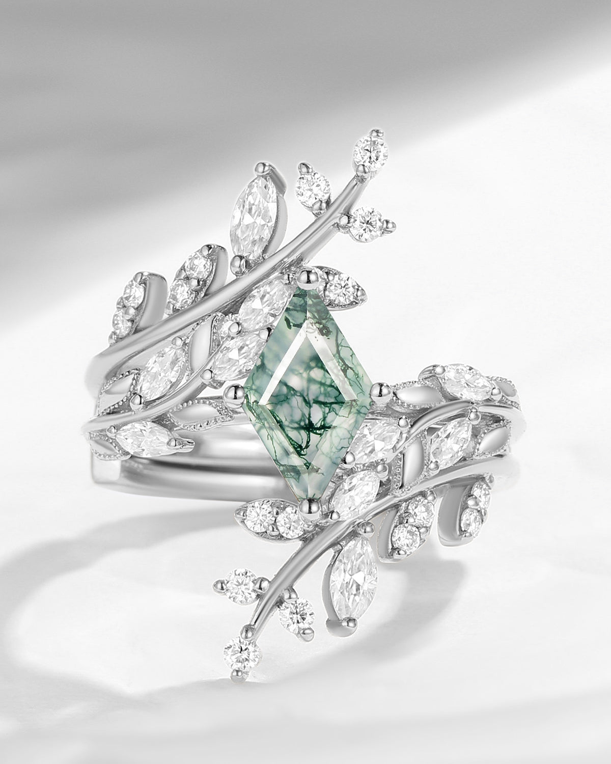 Unique Nature Inspired Kite Cut Moss Agate Leaf Engagement Ring Set 2pcs