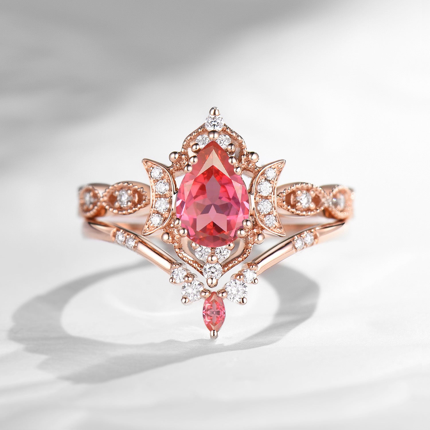 Crescent Moon | Pear Cut Lab Padparadscha Engagement Ring Sets 2pcs - Luna