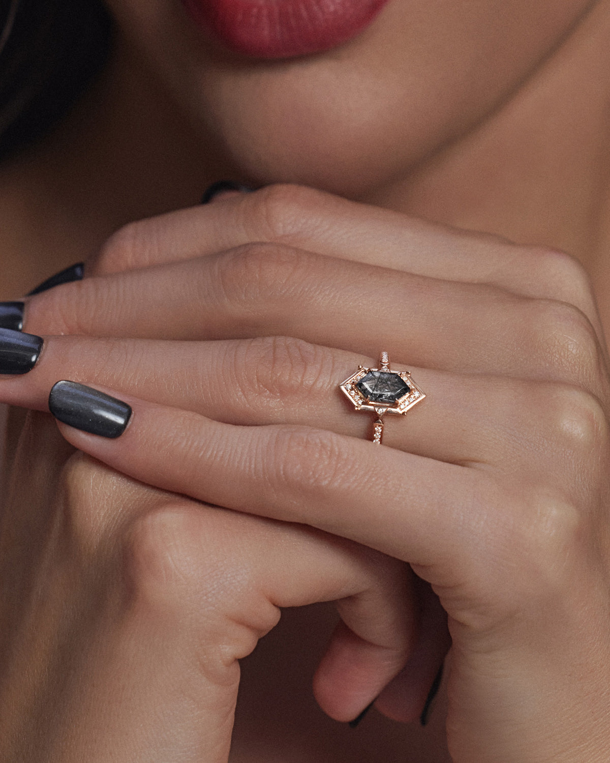 Long Hexagon Salt and Pepper Diamond Vintage Engagement Ring