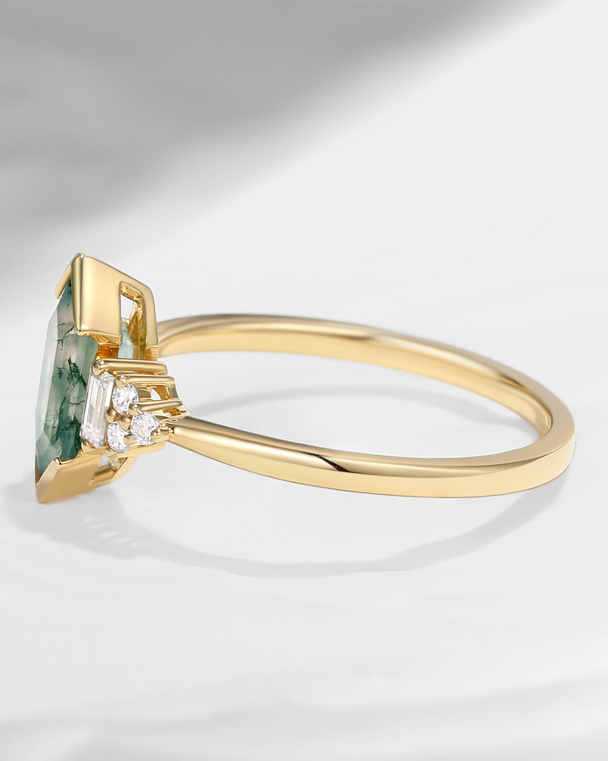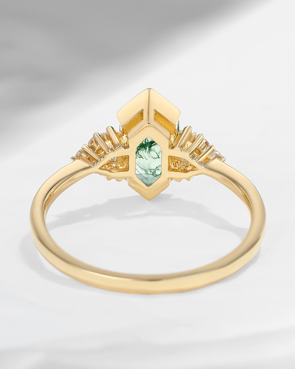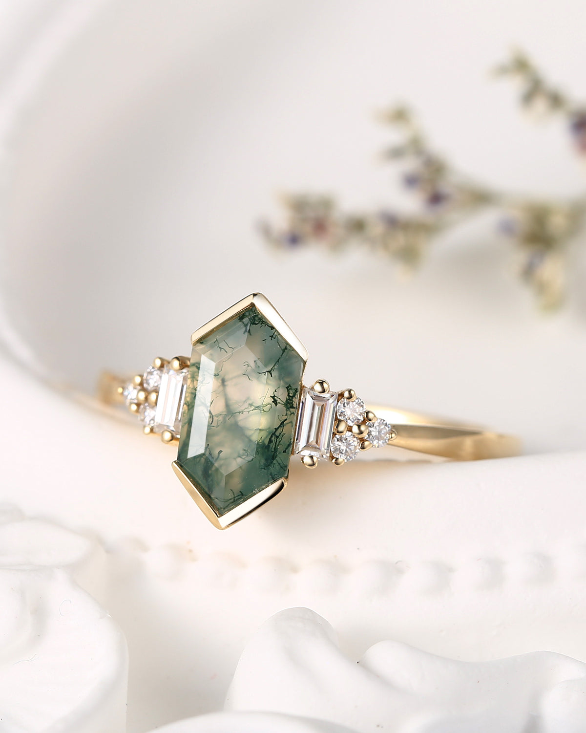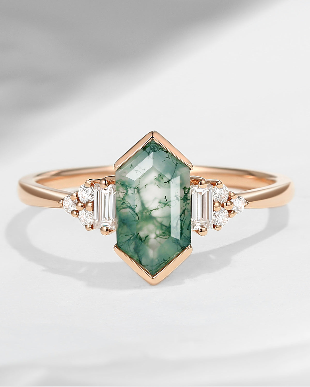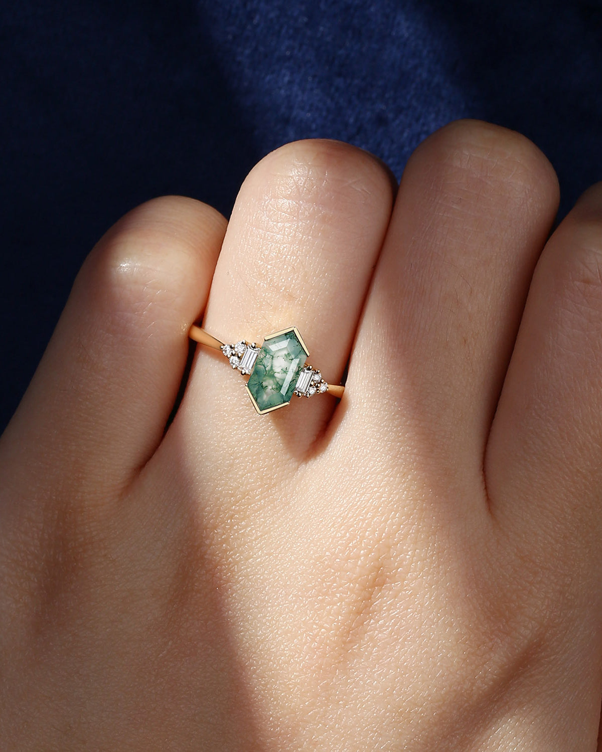 Art Deco Long Hexagon Moss Agate Cluster Engagement Ring