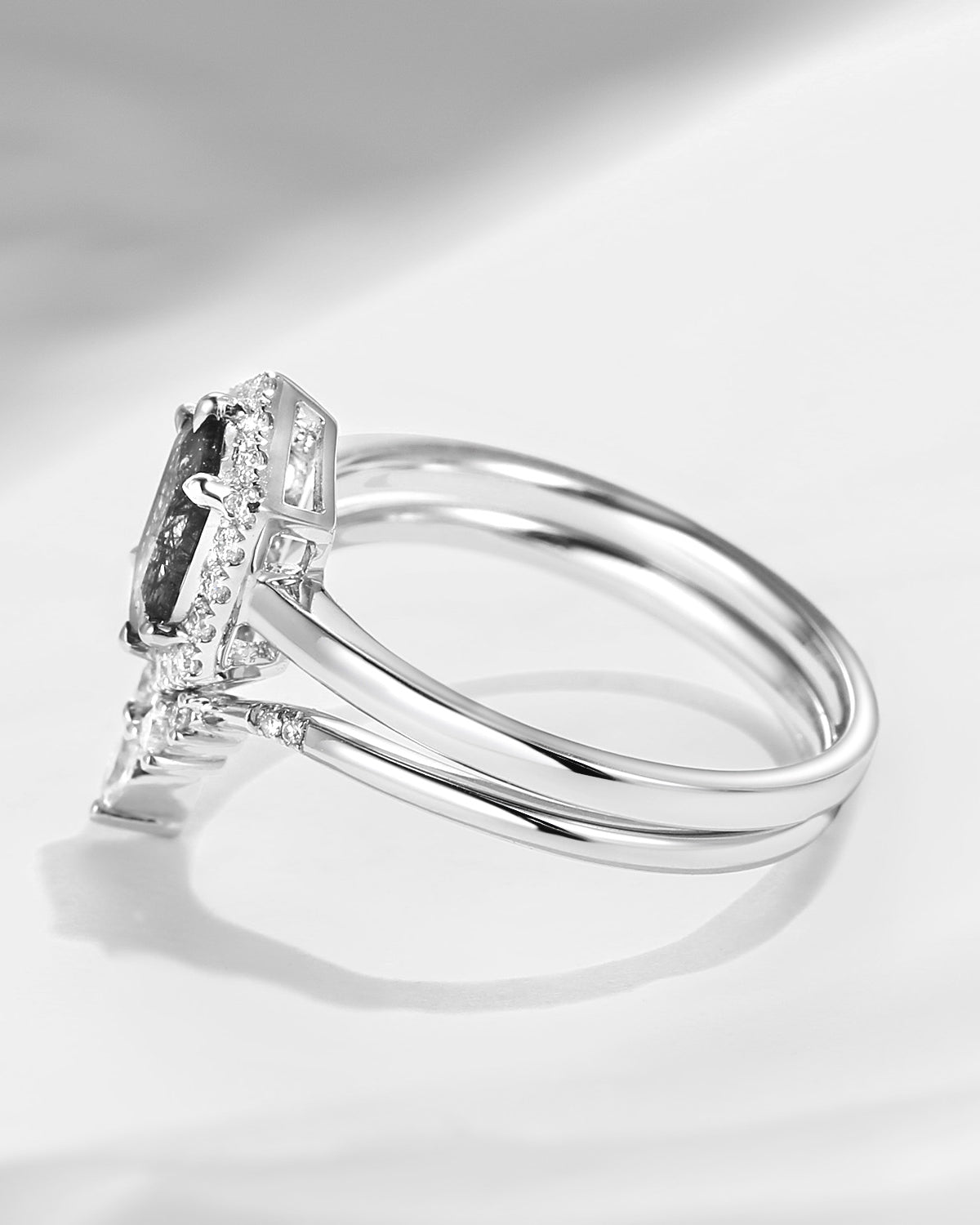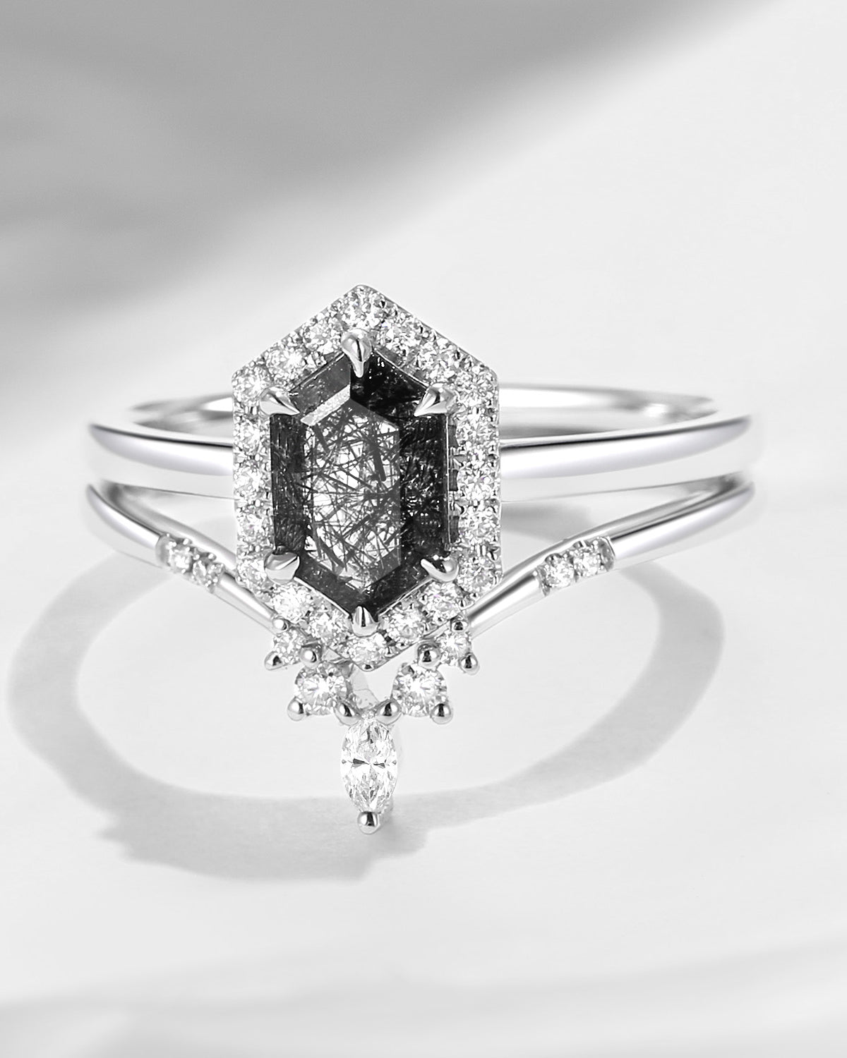 Long Hexagon Salt and Pepper Diamond Engagement Ring Set 2pcs Solitaire Cluster Ring