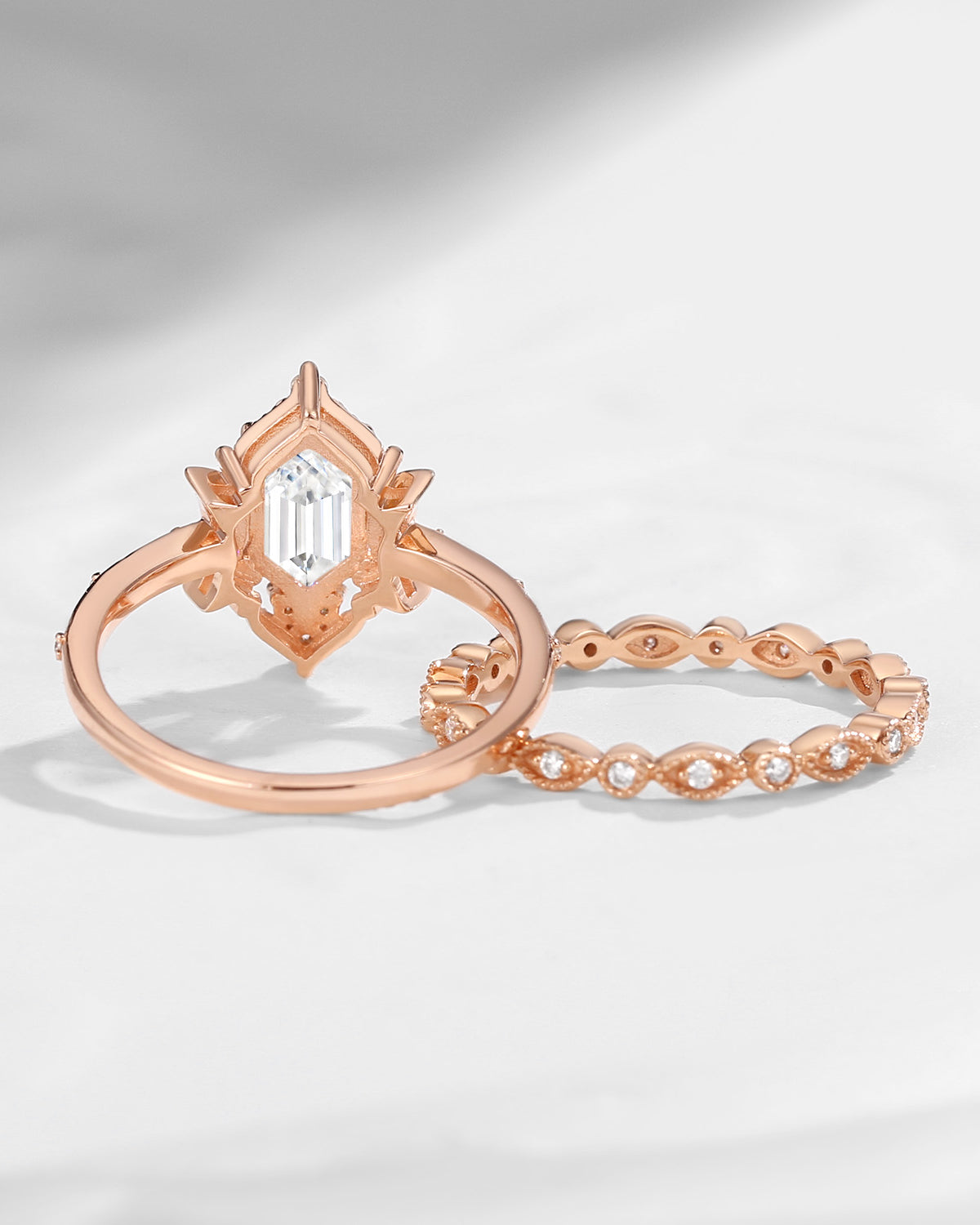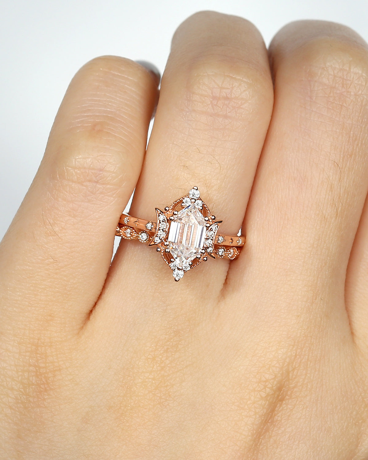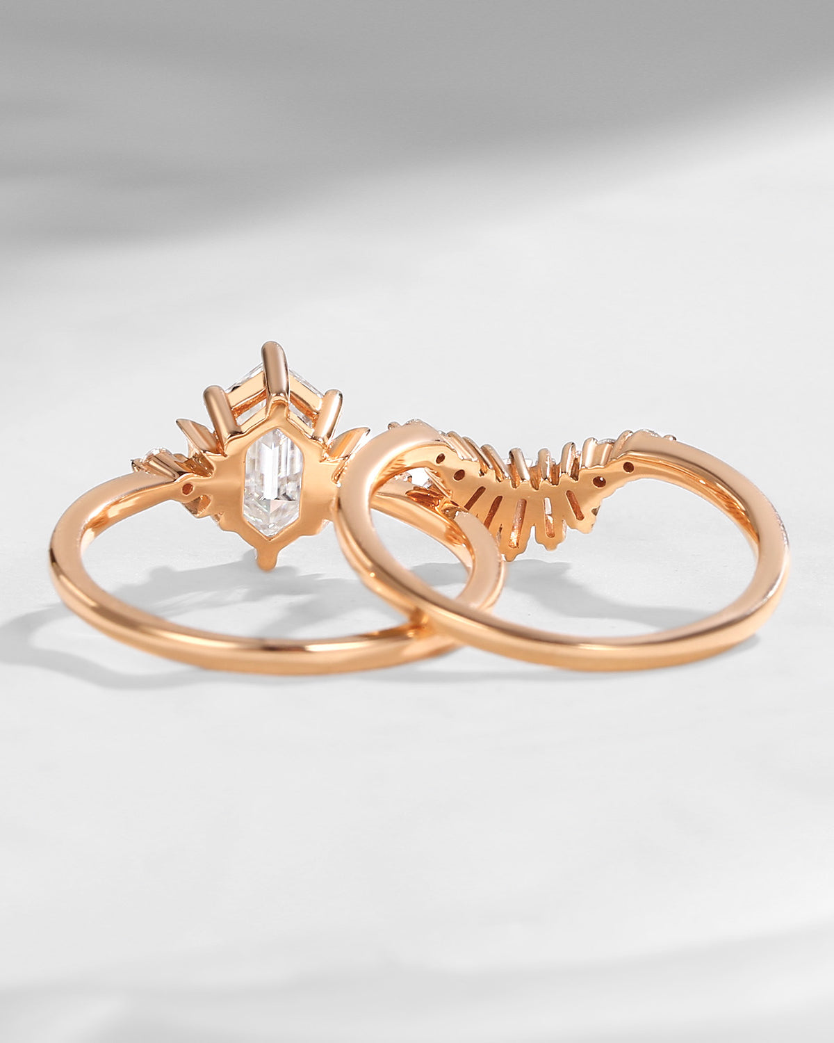 Pure Moon | Fancy Long Hexagon Moissanite Engagement Ring Set 2pcs