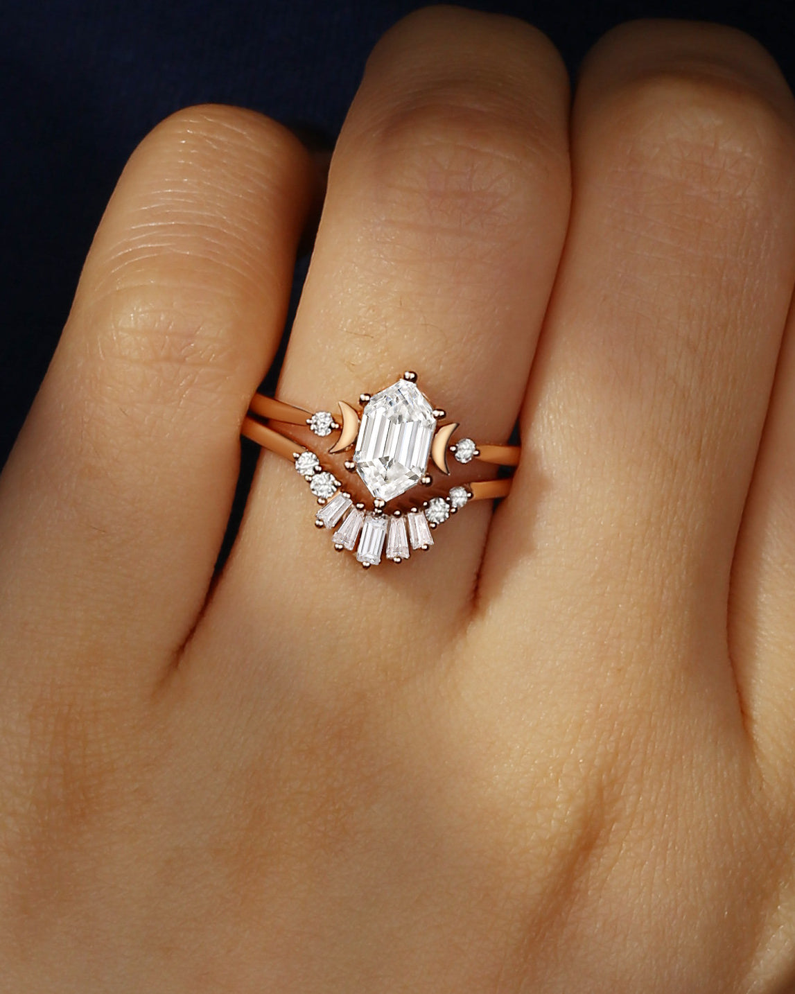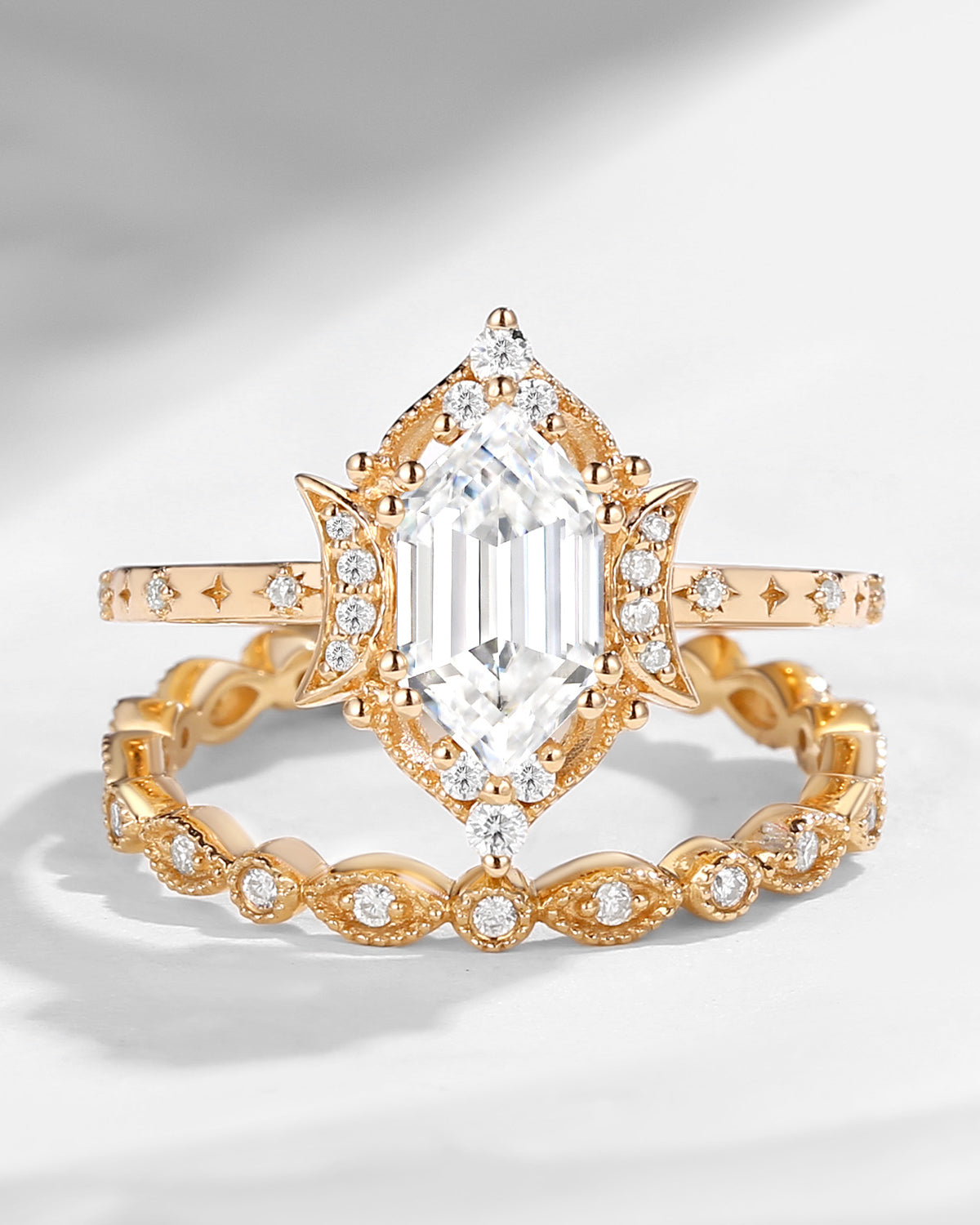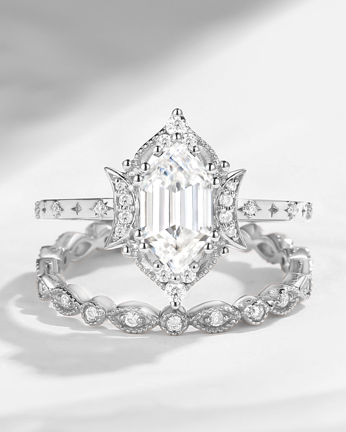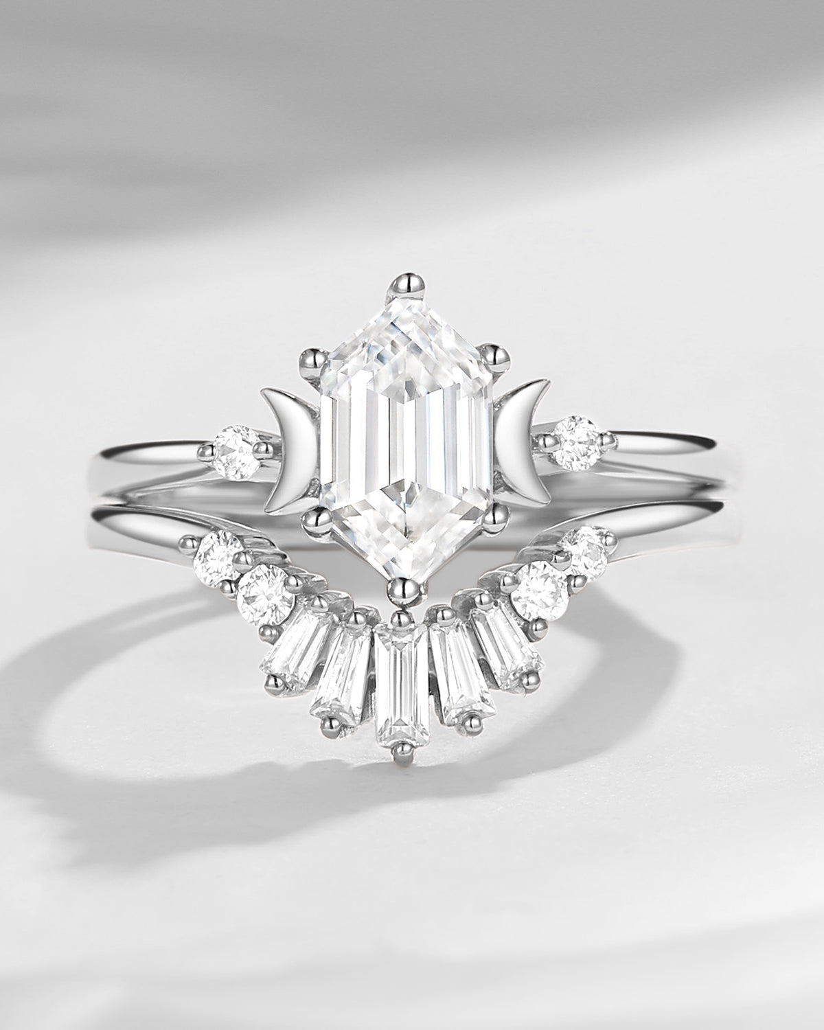 Crescent moon | Long Hexagon Moissanite Star Band Engagement Ring 2pcs