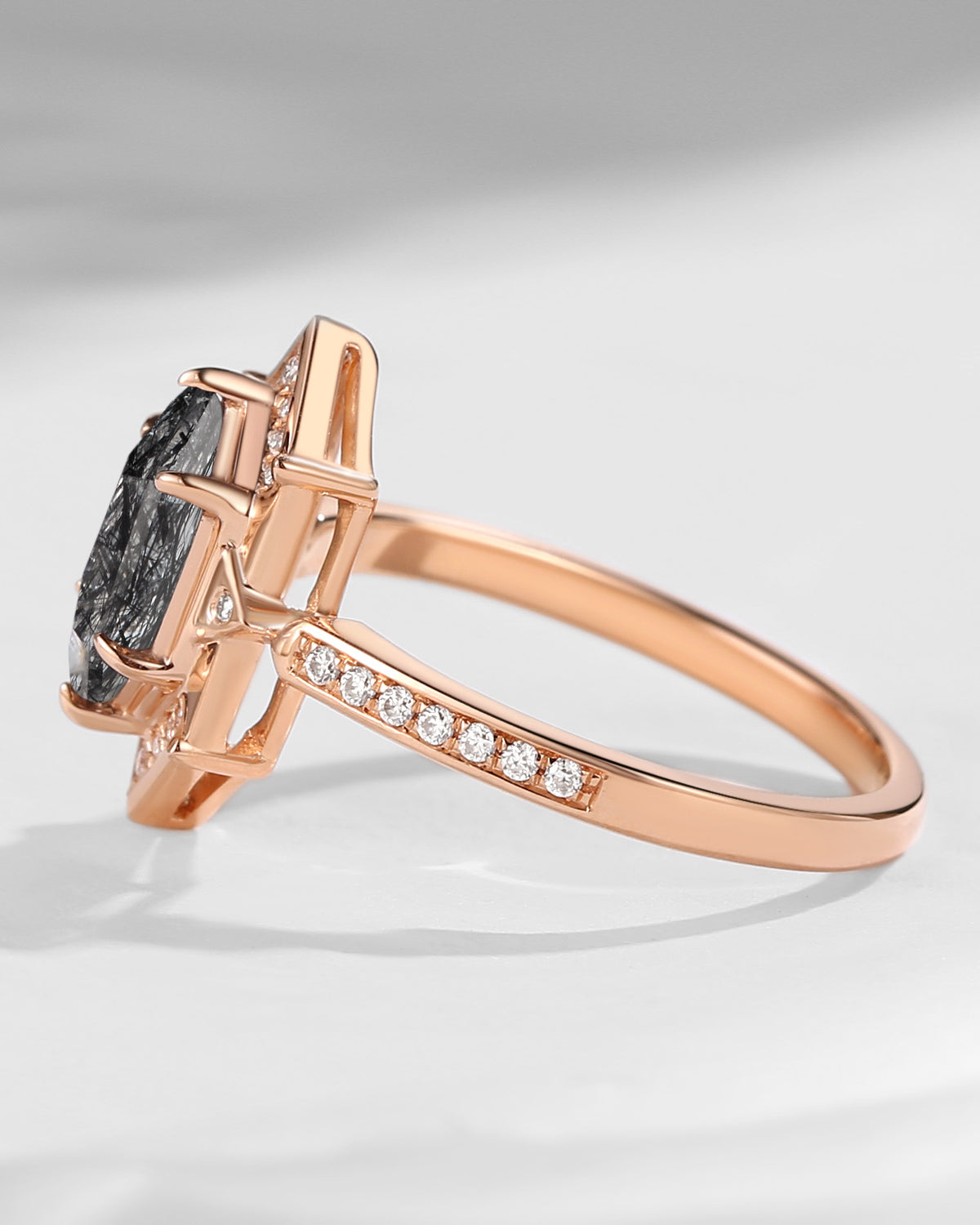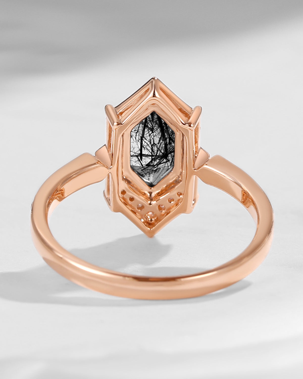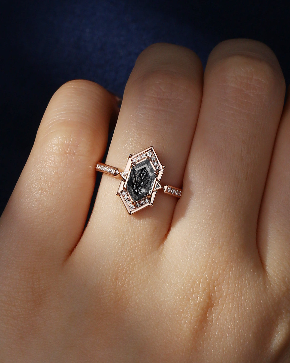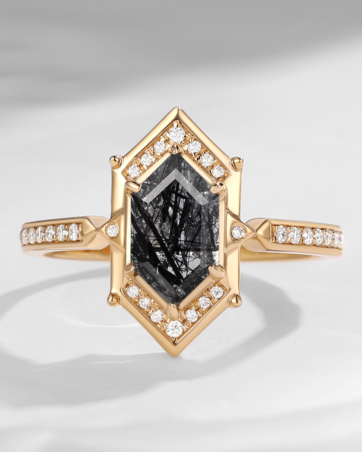 Long Hexagon Black Rutilated Quartz Vintage Engagement Ring